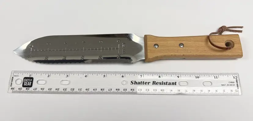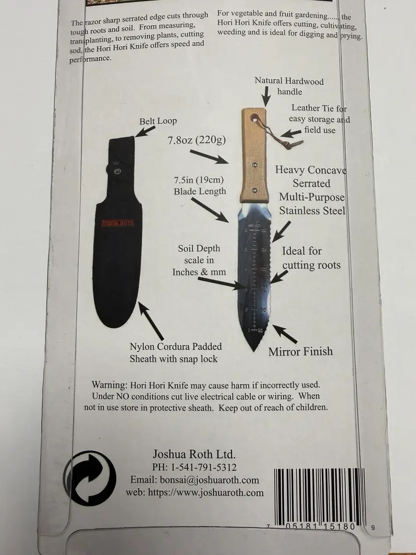 Its stainless steel blade is very sharp and concave shaped for scooping soil and other materials. Because of its sharpness, it is also excellent as a general purpose sporting knife. Nylon Cordura Sheath has belt loop and retaining strap.