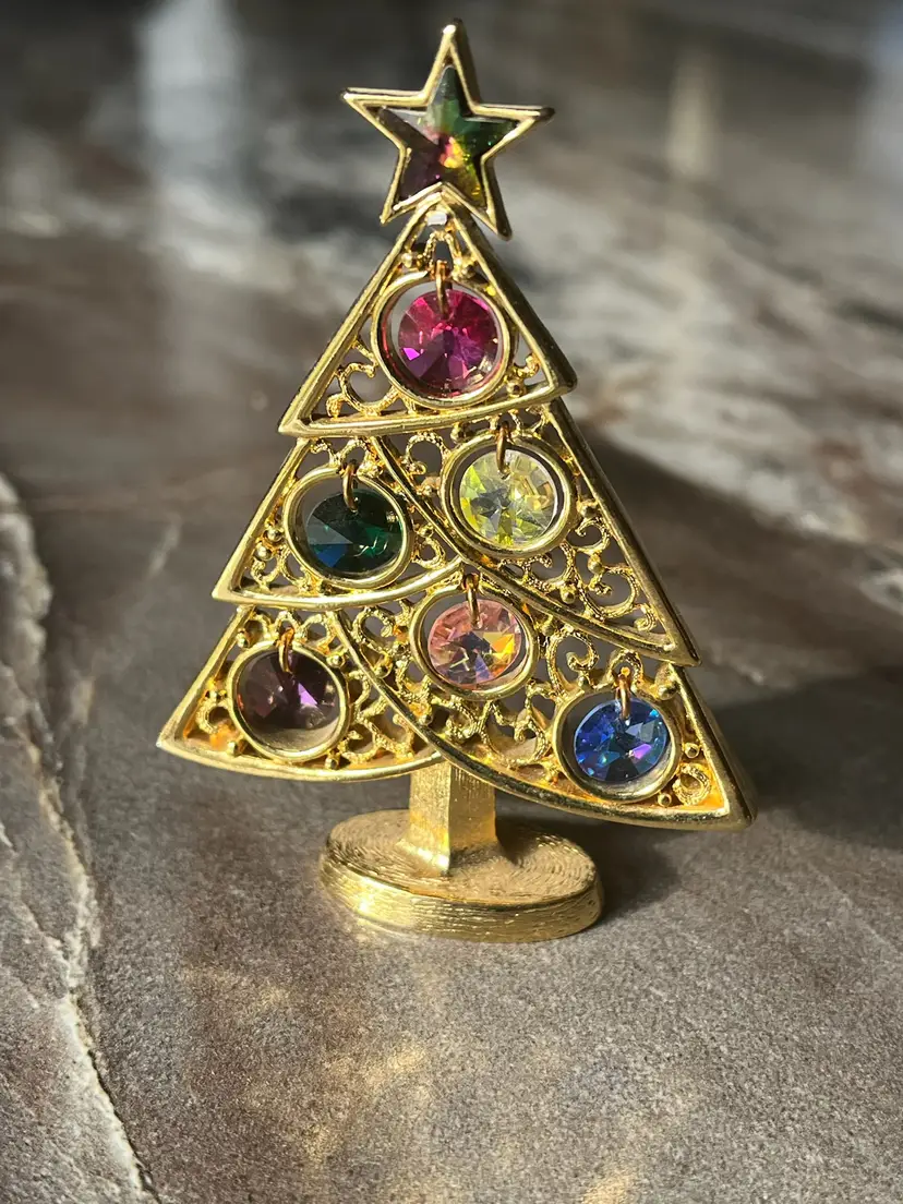 A three inch standing tree figurine. Two inches wide, Decorated with multi-color plastic crystals. Preowned. Excellent condition. A nice size for a small place, work, desk, kitchen shelf, stocking stuffer or a gift for a teacher, boss, etc.