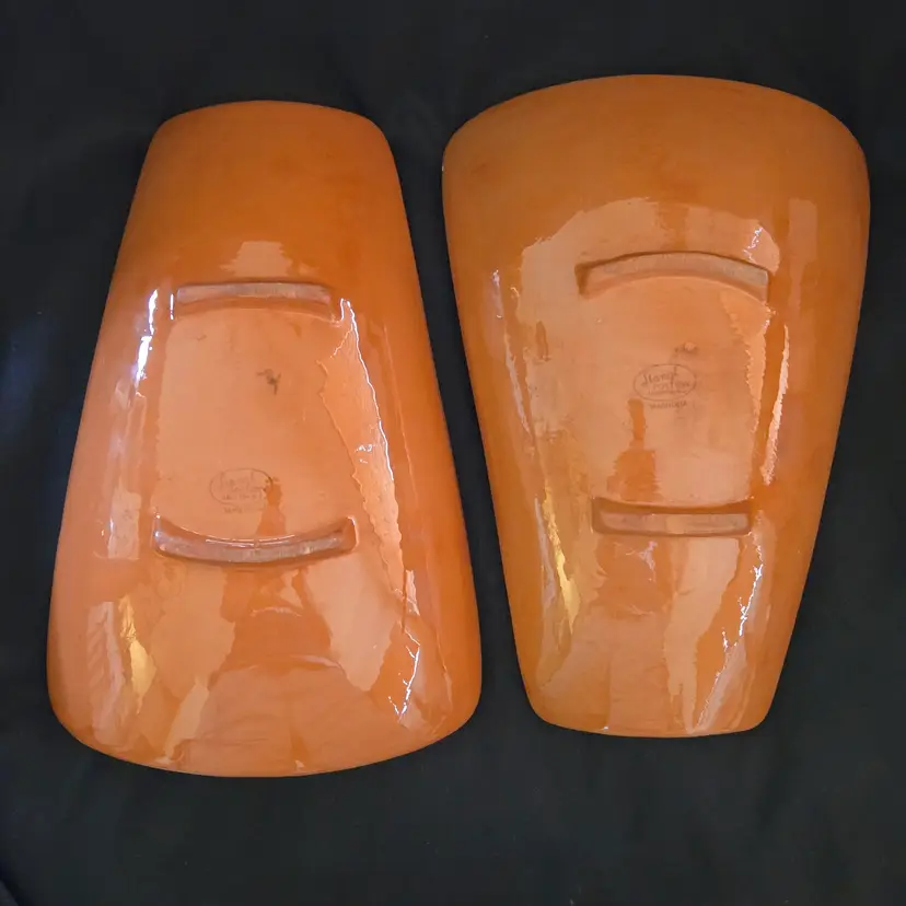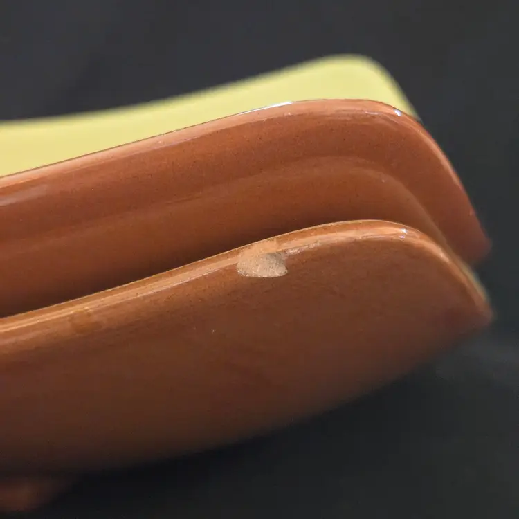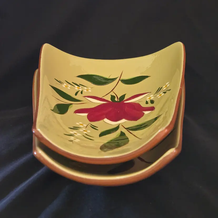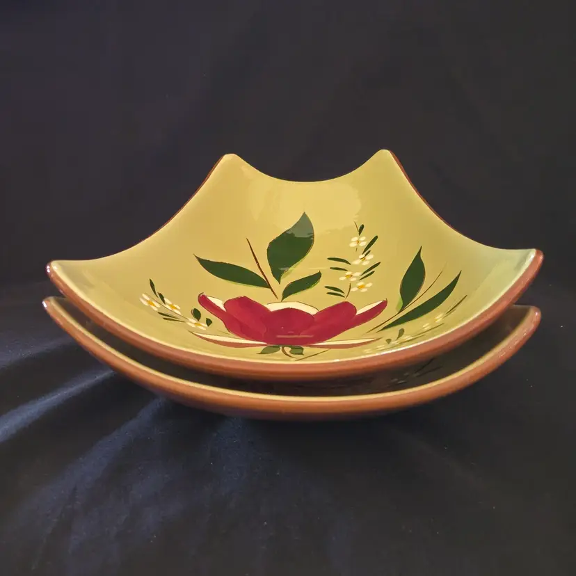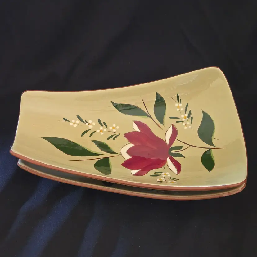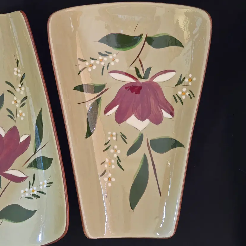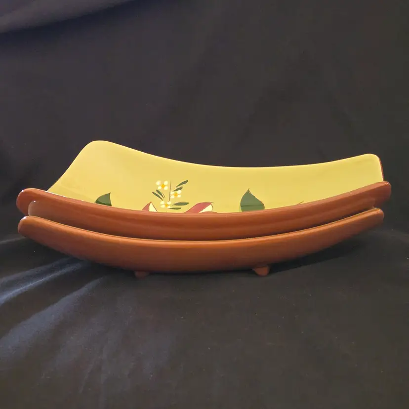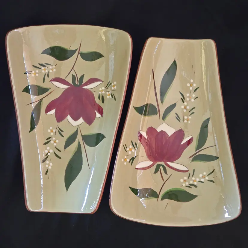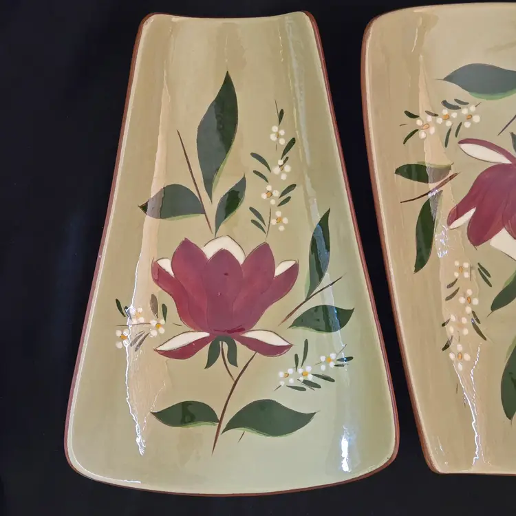 Stangl Pottery Ceramic MAGNOLIA Relish Dish 11¼" x 7½" at widest - set of 2 Vintage. Used condition with one of the dishes having a chip along the edge, manufacturer flaws including dirt in the glaze. Please view all the photos and please ask any questions prior to purchase when possible.