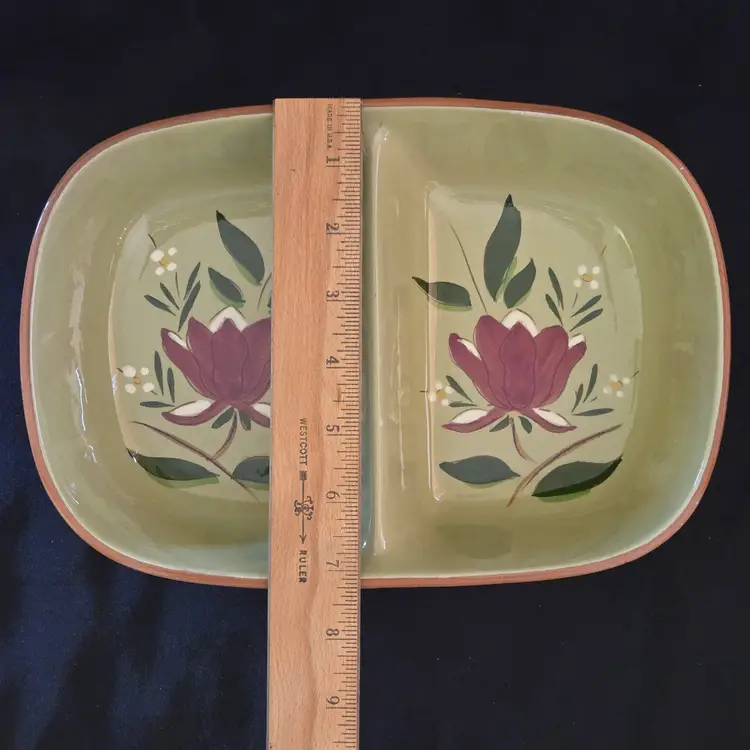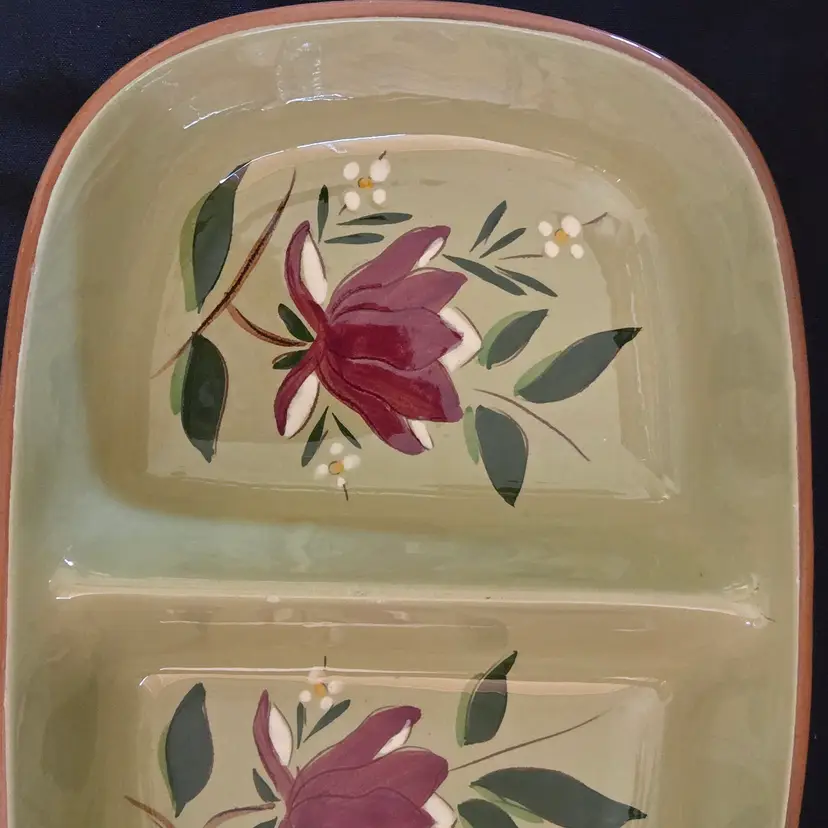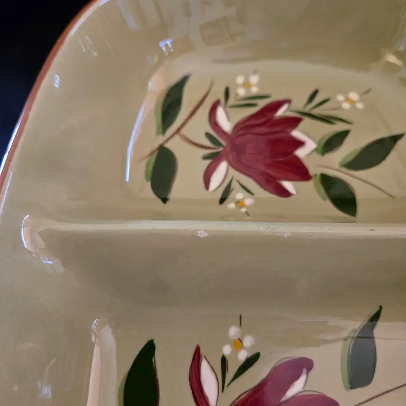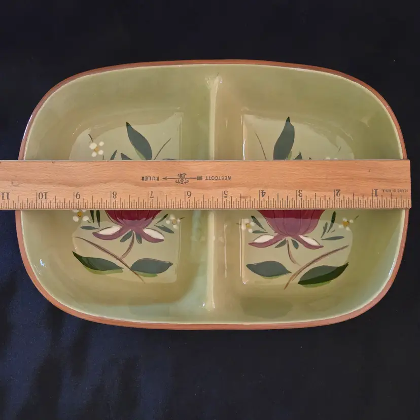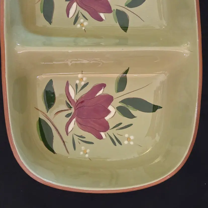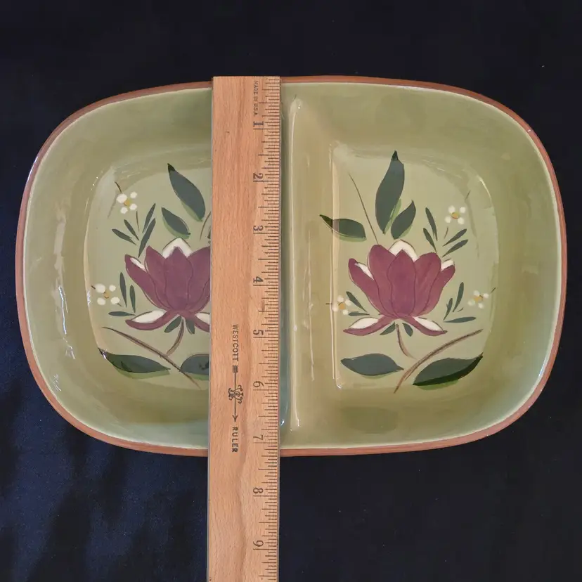 STANGL POTTERY MAGNOLIA Divided Serving Bowl Dish two-sided hand painted Vintage. Size is 7¼"×10⅝" approximately. Used condition with some fleabites and a scratch otherwise no extensive signs of use. Please view all the photos and please ask any questions prior to purchase when possible.