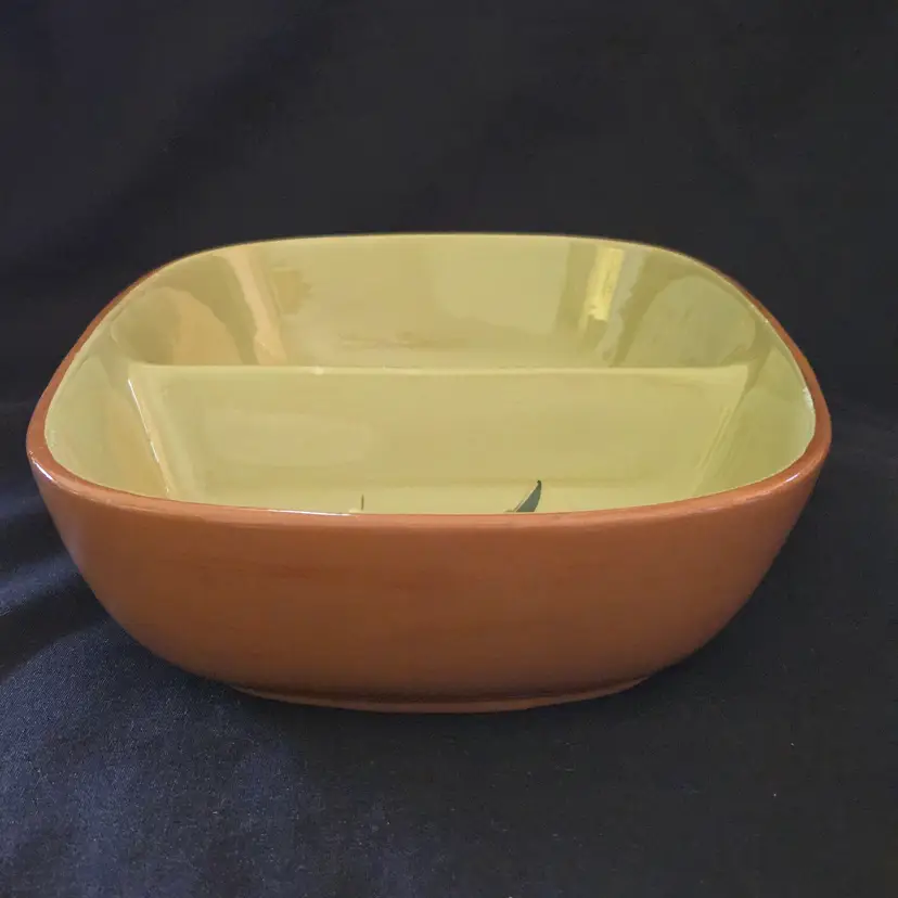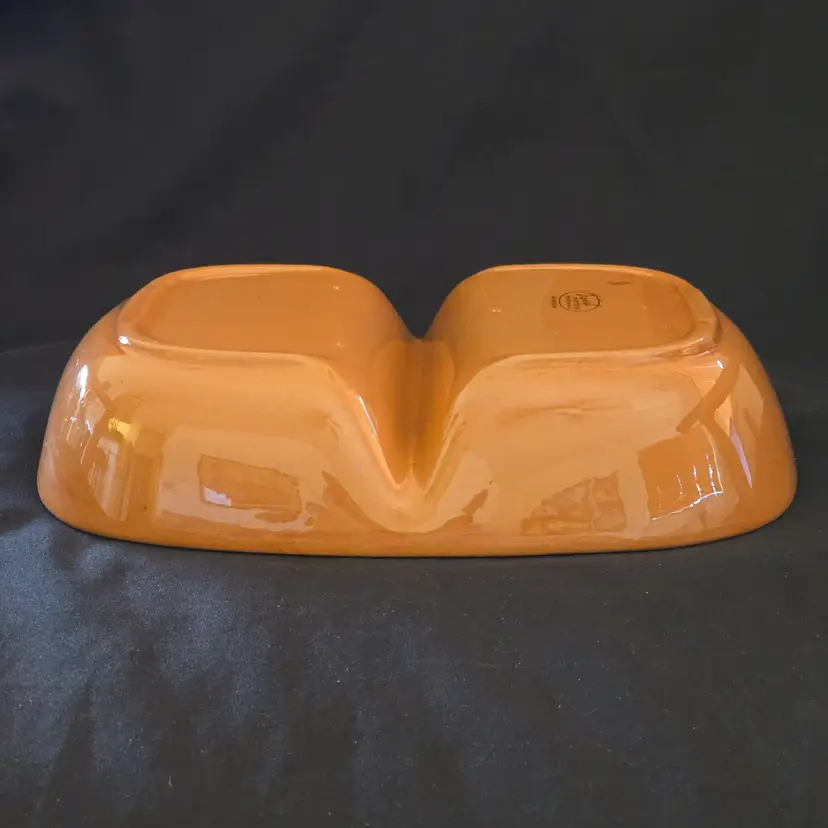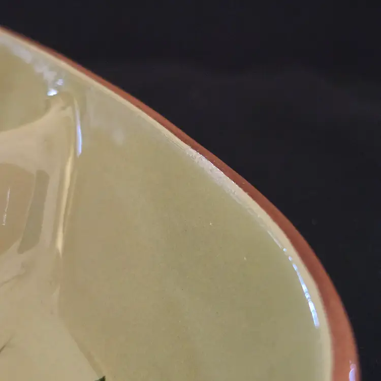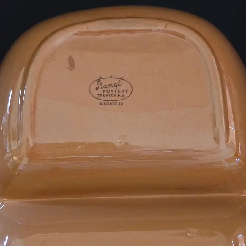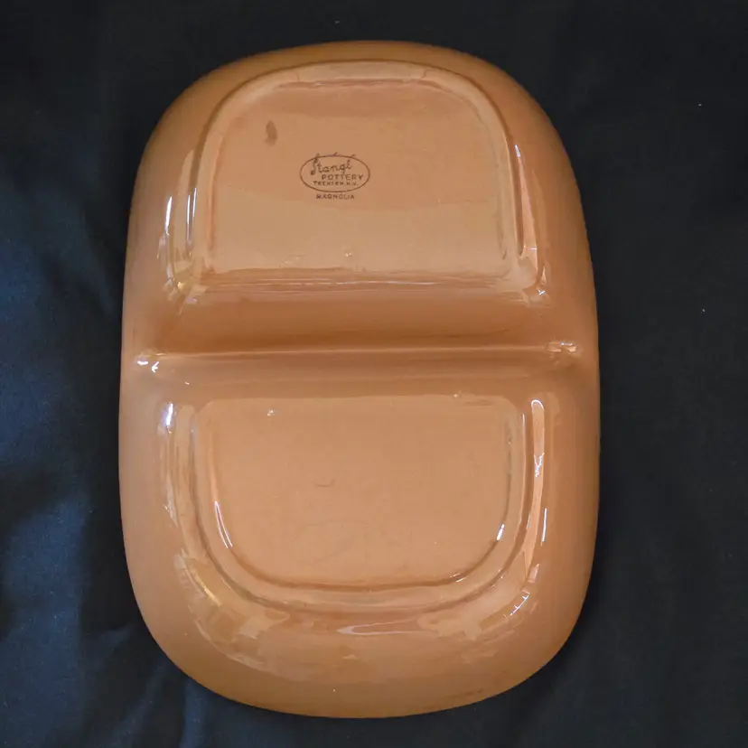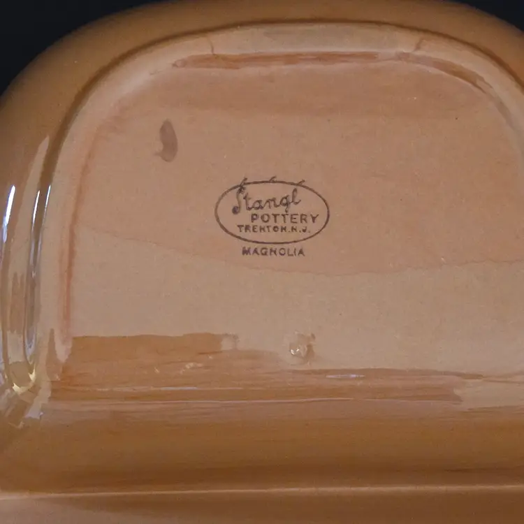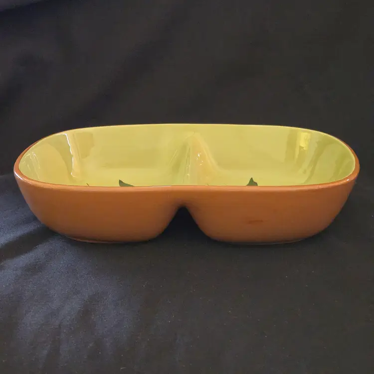STANGL POTTERY MAGNOLIA Divided Serving Bowl Dish two-sided hand painted Vintage. Size is 7¼"×10⅝" approximately. Used condition with some fleabites and a scratch otherwise no extensive signs of use. Please view all the photos and please ask any questions prior to purchase when possible.