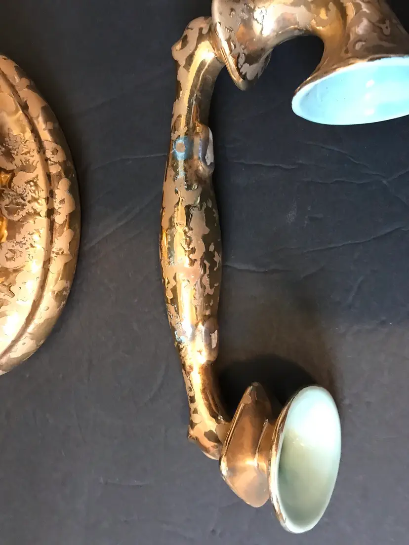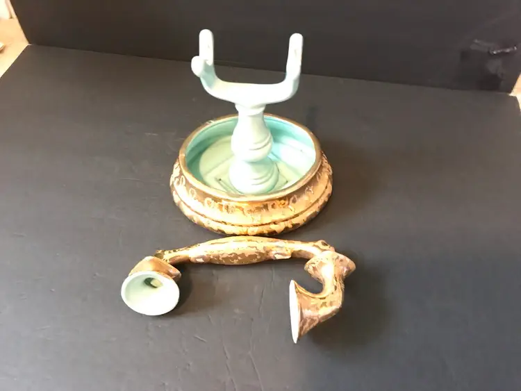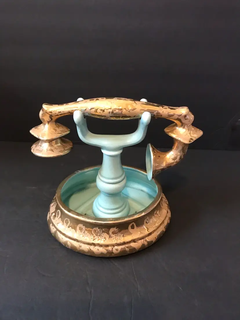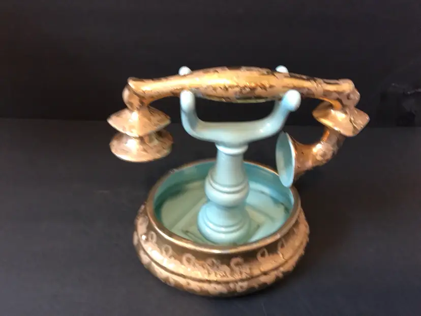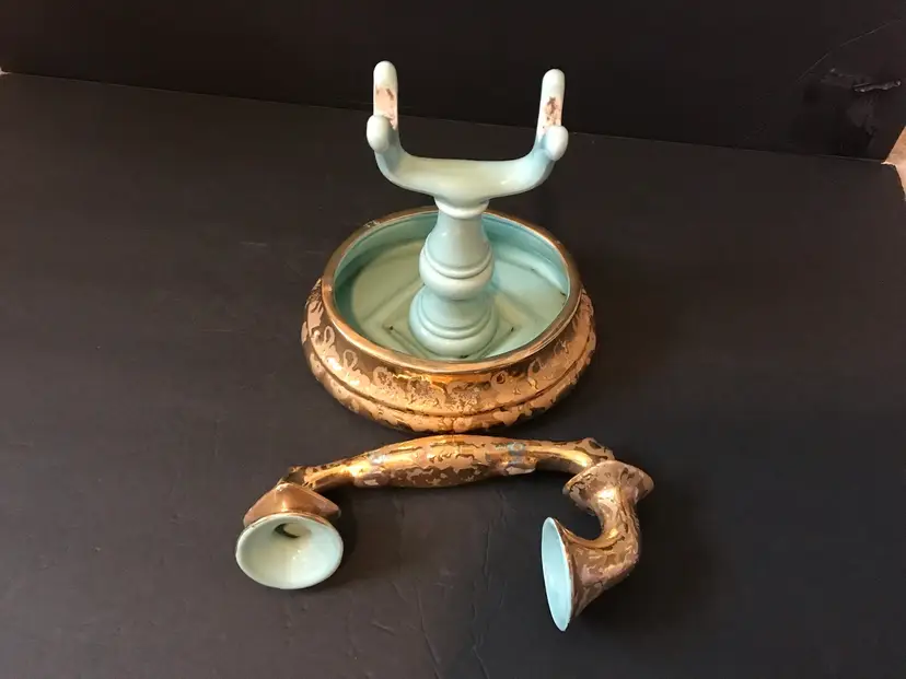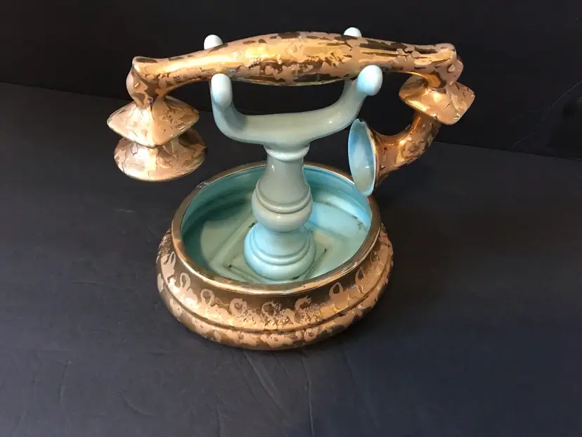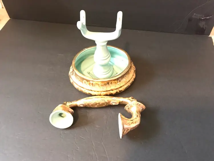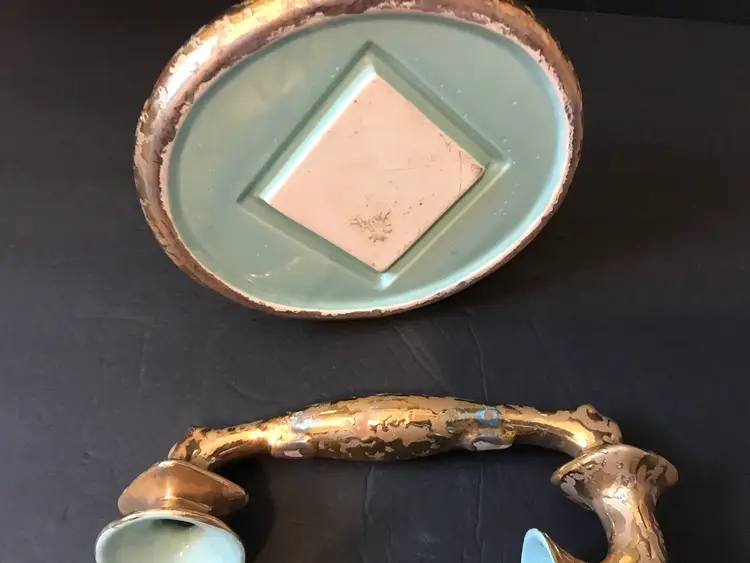 No chips or cracks Measuring 8" tall x 9" wide. Good light use and wear as shown, see photos… I can’t find one this color. I found them totally covered in the weeping gold just like this just no blue. I was told it might be a pottery not stangl. I could not verify that either so I am putting this disclaimer on here because while I believe it is stangl but I can’t find that color anywhere.