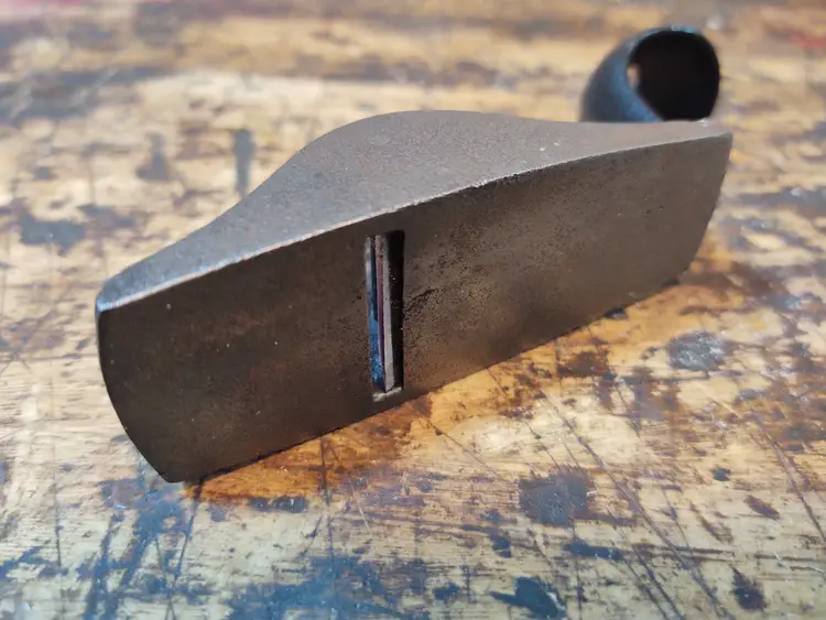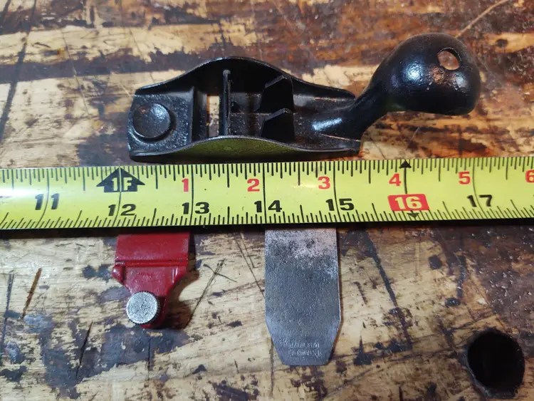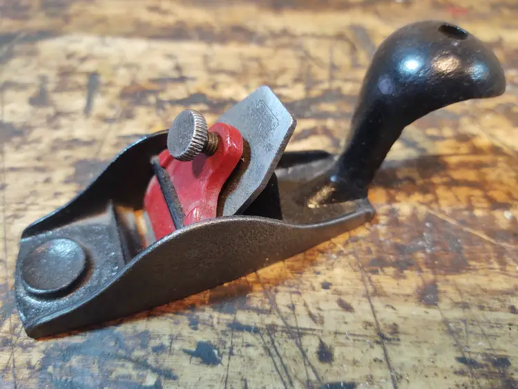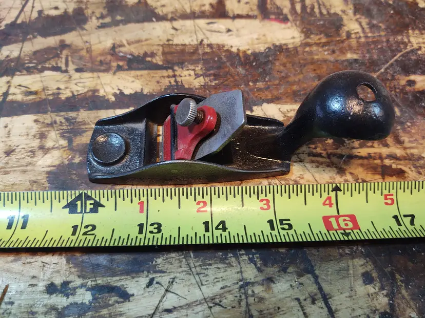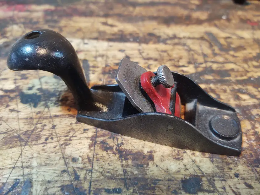 Stanley #100 Squirrel tail Block Plane . The Stanley #100 Squirrel Tail Block Plane is a diminutive, palm-sized hand plane specifically designed for fine work, model making, and pattern work. Its most distinguishing feature is the curved, "squirrel tail" handle at the rear, which provides better control and comfort than standard small block planes. . Key Specifications & Features Length: 3 ½ inches. . Blade Width: 1 inch. . Weight: Approximately 3/8 lb (about 150g). . Iron Angle: Standard angle (not low angle like many specialized block planes). . Adjustment: It is a non-adjustable plane; the blade is held in place by a simple lever cap and a thumb screw. Depth and alignment must be adjusted manually by tapping the iron. . Ergonomics: Features a circular depression at the toe for your index finger and the signature "squirrel tail" handle that fits into the palm. . Historical Information Production Years: Manufactured from 1898 to 1958. . Finish: Early models were "japanned" (a black lacquer finish) all over. . Wartime Changes: During WWII, the lever caps were often painted red instead of being japanned. . Evolution: Later models (post-1920) typically have "Stanley" embossed on the toe; the very first models did not have the model number embossed at all. . . . (My #100-032223-3)