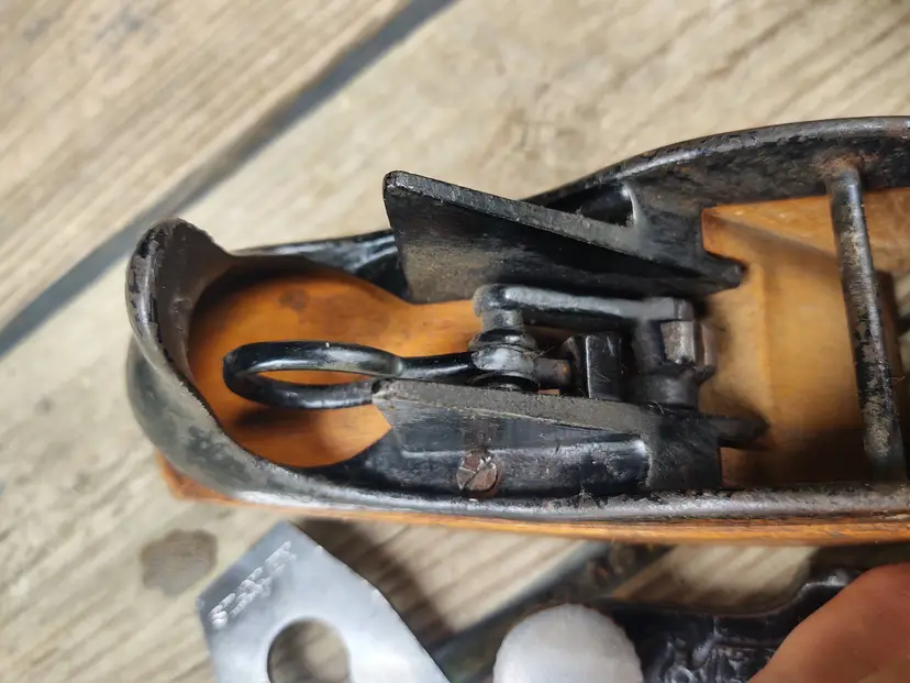 Stanley’s made the “Liberty Bell” planes in two steel bodied models, the No. 104 and 105 and five transitional-style wood and metal framed models, the No. 122, 127, 129, 132 and 135. Stanley sold these planes for approximately 42 years, discontinuing them in 1918. The steel bodied planes had a cast iron core riveted to a steel frame for extra strength and possibly weight. Although the steel frame on the Liberty Bells was strong, it had a tendency to oxidize and many examples are found heavily rusted and pitted. One unique feature of this series is its special two-piece cutter screw with a notch engaging the adjustment lever. Cutters from these planes cannot be used in Stanley’s Bailey planes. One rare Type I plane is known with a unique difference in the cast iron core. From the front knob boss, two ribs come forward at a 450 angle to the front corners of the plane.