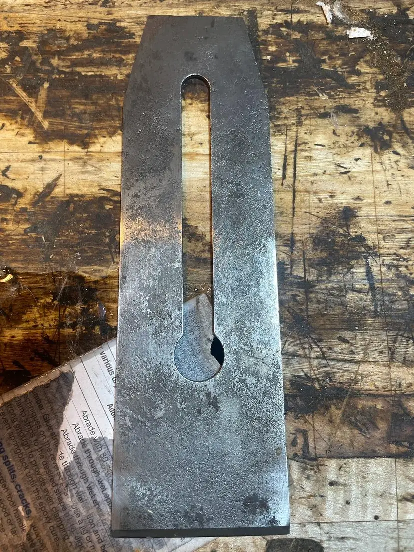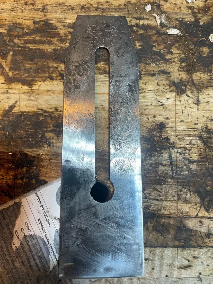 Stanley 2 3/8" Blade The back had some pitting and someone in the past took a grinder to it. I’ve worked most of it out. It’s not perfect but it’s completely serviceable.
