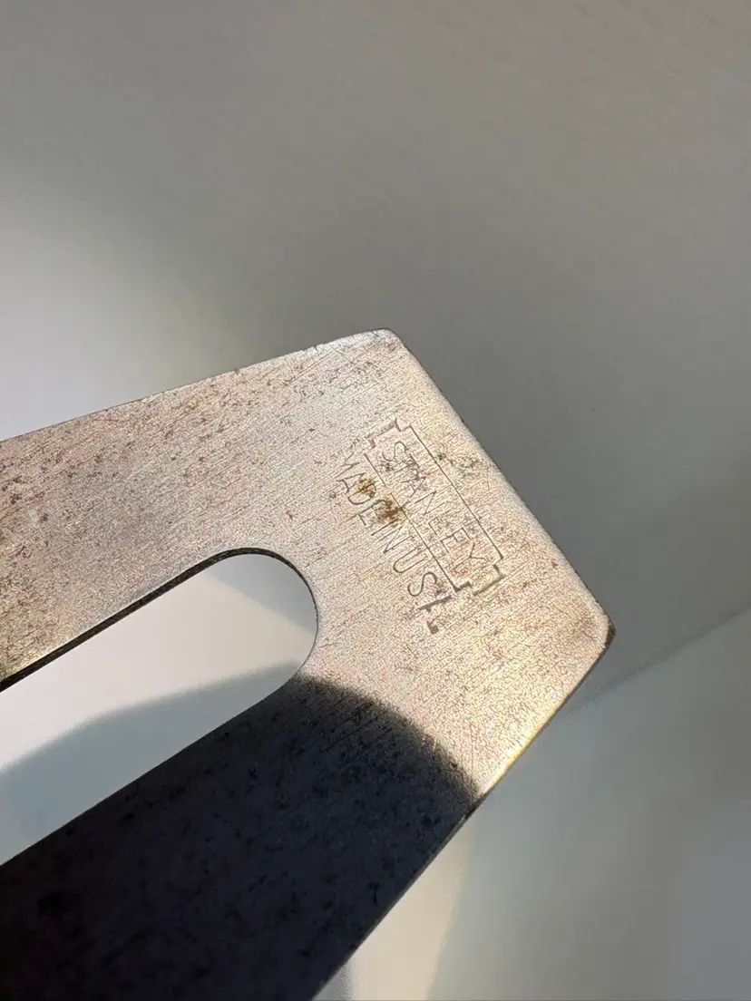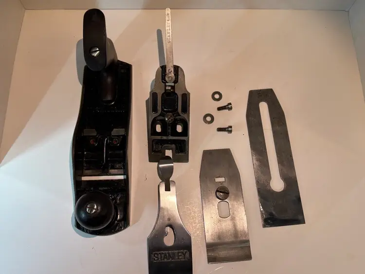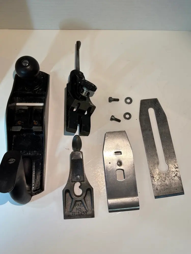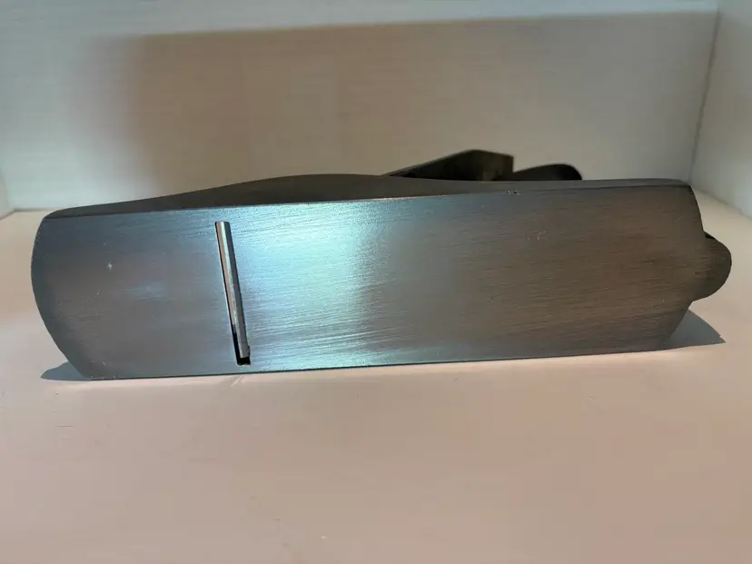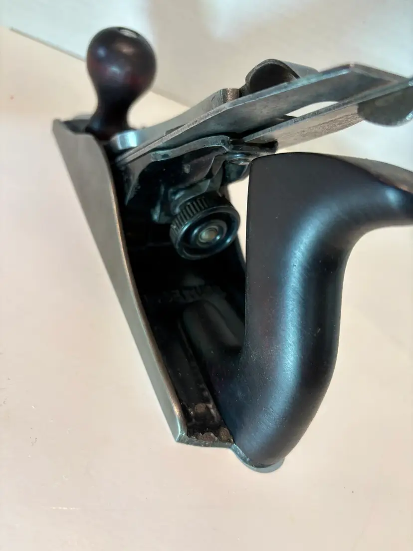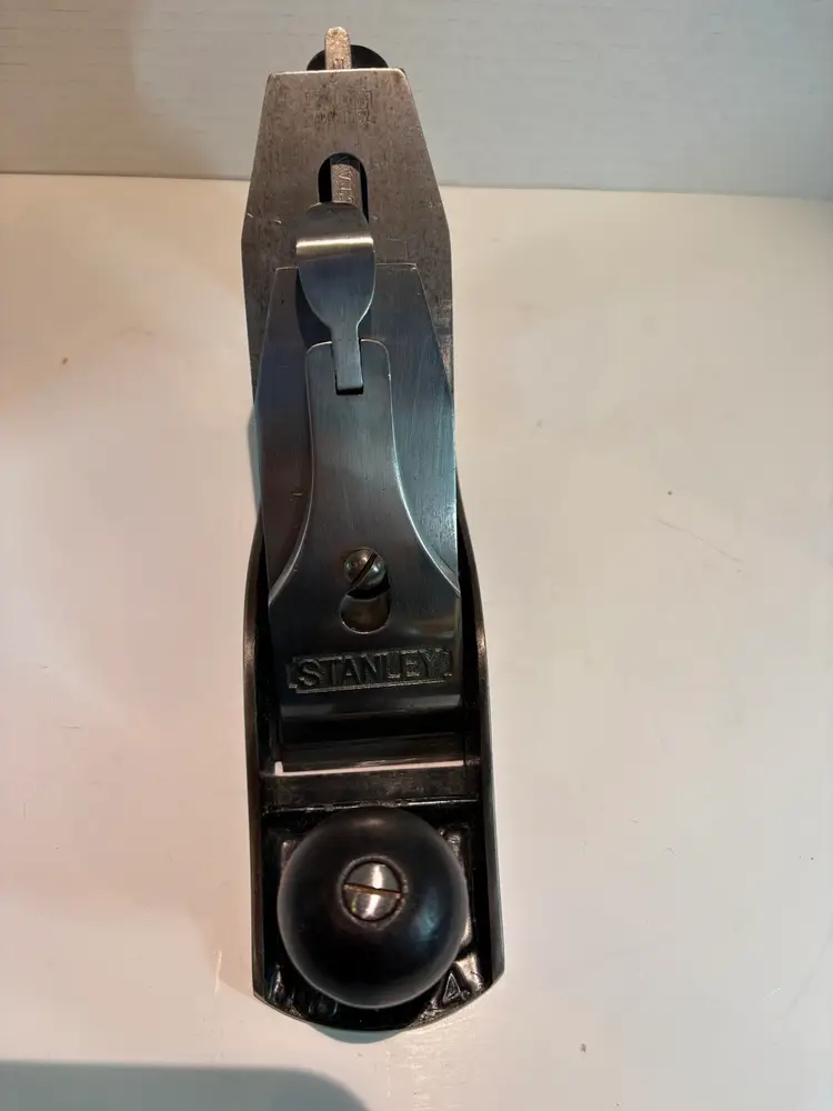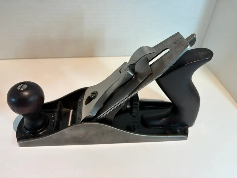 Stanley Bailey No 4 smoothing plane. WWII era type 17. Very clean, sharp and tuned. Bottom flattened. Lever cap is shiny. This plane is ready to make shavings. Tote is beech, knob is hardwood. Varnish on them was shot so I redid them a deep red. The depth adjuster is gutta percha (hard rubber) and is in excellent shape. It does not have the frog adjustment screw - which is common for the war production planes.