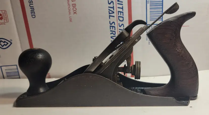 Up for sale is a nice Stanley #4 type 11 Hand Plane. It has the 3 patent dates behind the frog and the small brass adj. nut. This one has a smooth bottom and I have lapped it flat. The rosewood tote and knob show their original patina and are crack free. The Japanning was pretty spotty, so I stripped it off and re-Japanned it using Stanley's original factory recipe. This plane has a brand new Stanley Victory iron and I have sharpened the iron and it is ready to go to work. There is a very small chip out of the left rear side, look at the pictures for detail. Really nice 115 year old plane.