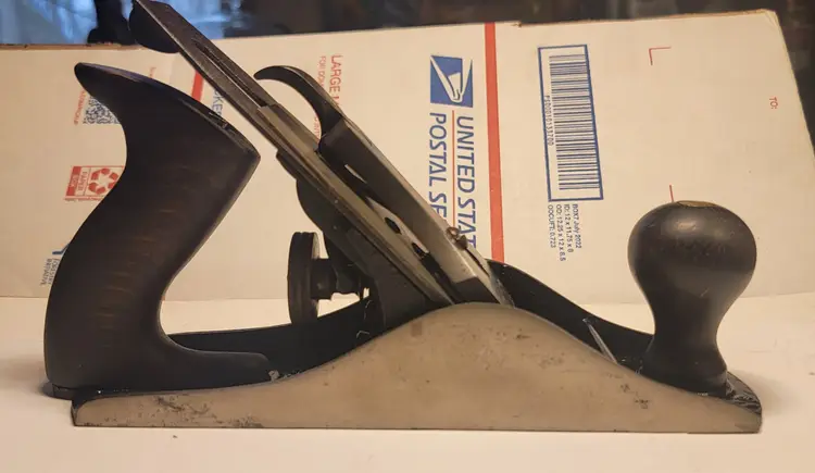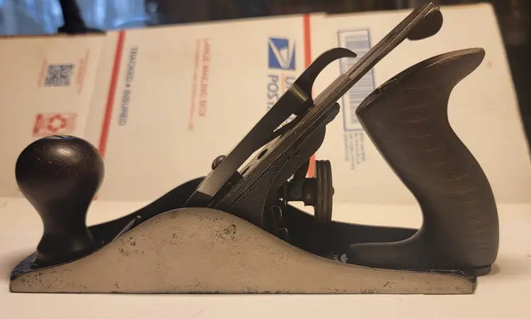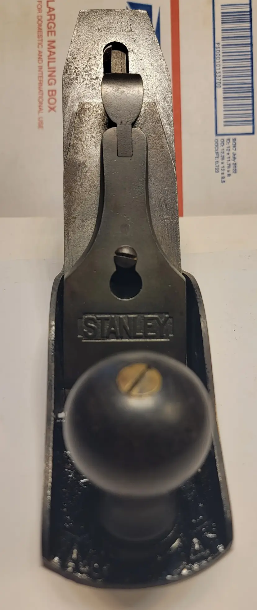 Up for sale is a nice Stanley #4 type 16 hand plane. This one has a smooth sole. I have re-Japanned it using Stanley's factory recipe and baked it 5 times on low heat to set the Japanning. I have lapped the sole and it is flat, didn't have to do much. I have also sharpened the iron going through the grits up to 8000. This plane has some pitting on the sole but that will not hurt the performance of the plane. The tote and knob are crack free and in great shape. The plane has a lever cap from an eariler model, typical Stanley, and has the BB logo on the iron.