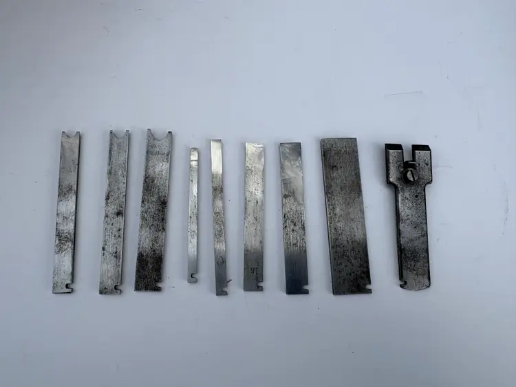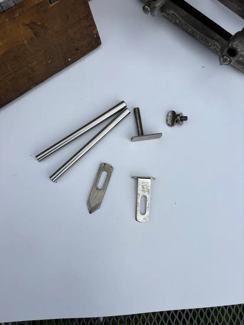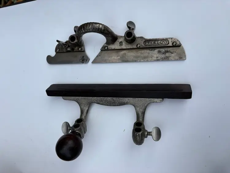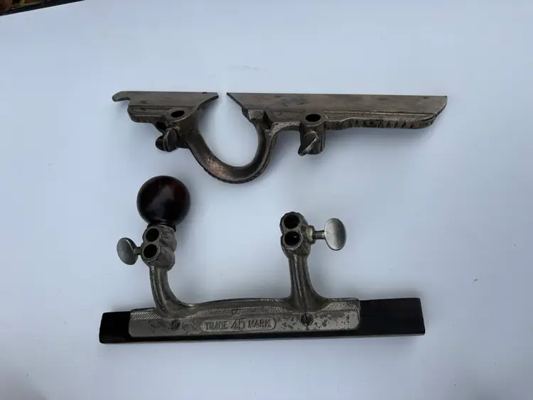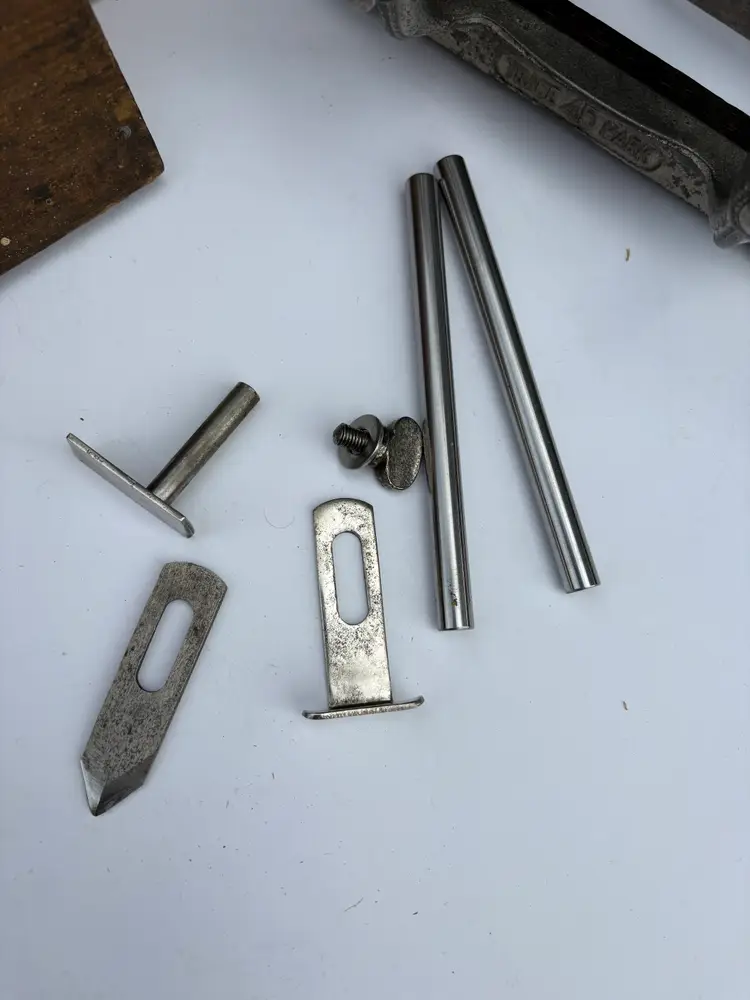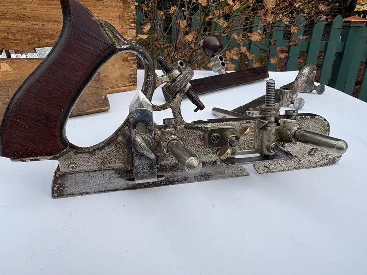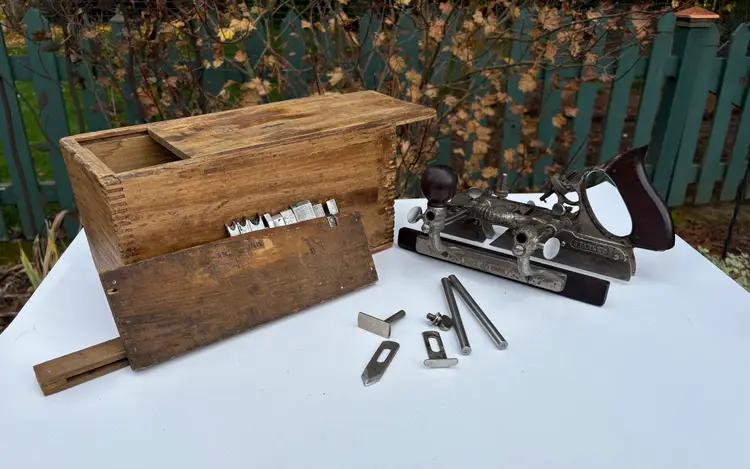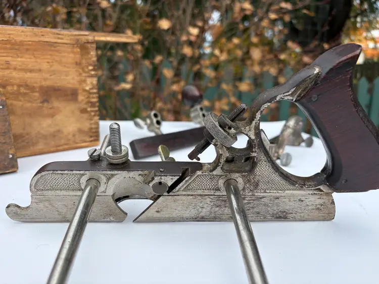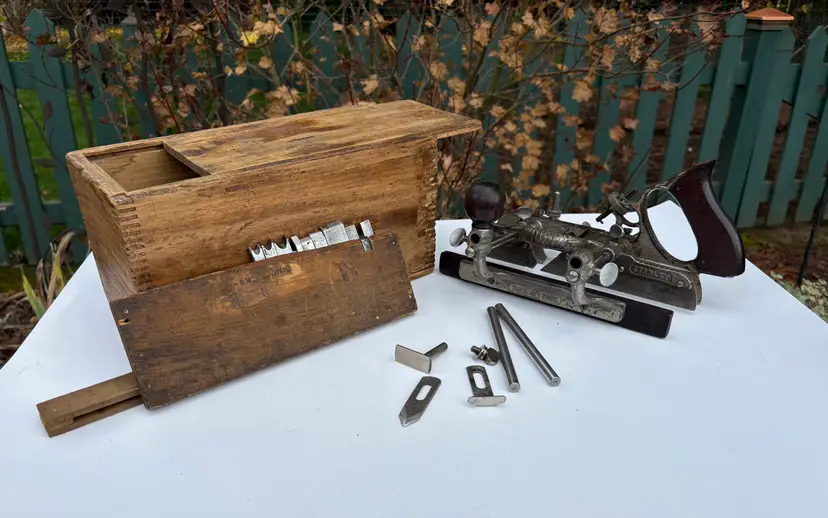 Stanley 45 combination plane from 1910-1914 - a type 11 in the 45 type study. Includes skate, rosewood fence, small depth stop, slitter iron and it's depth stop and nine additional irons. This was my user 45 but it is time to find it a new home. Rosewood knob has good threads. Most of the irons are sharpened and the rest should sharpen up fine. Has an original box which I think is chestnut. The long rods are original. The short rods are modern drill rods that work fine but are a slightly smaller diameter than original ones.