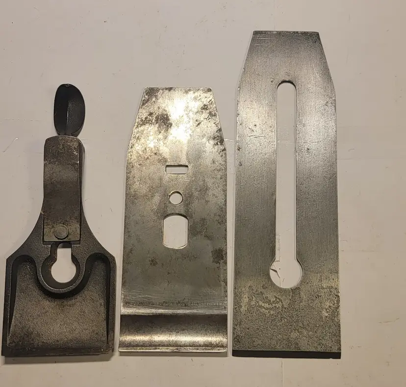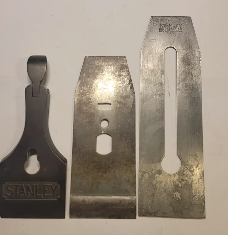 Up for sale are some 2 1/4 inch plane parts for a Stanley # 5 1/2 and 605 1/2 planes. the T logo iron is type correct for Stanley 605 1/2 types 4,5, and 6 and for Stanley 5 1/2 types 10 and 11. The lever cap would be type correct for the 605 1/2 types 7,8, and 9 and type correct for Stanley #5 1/2 types 13,14, and 15. The chip breaker would would be the same for all types. These parts would fit any 5 1/2 and 605 1/2 planes. There is a very small chip on the lever cap. The iron is 7 3/8" long, so no sharpened much if at all. Message me with any questions or if you want more pictures.