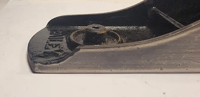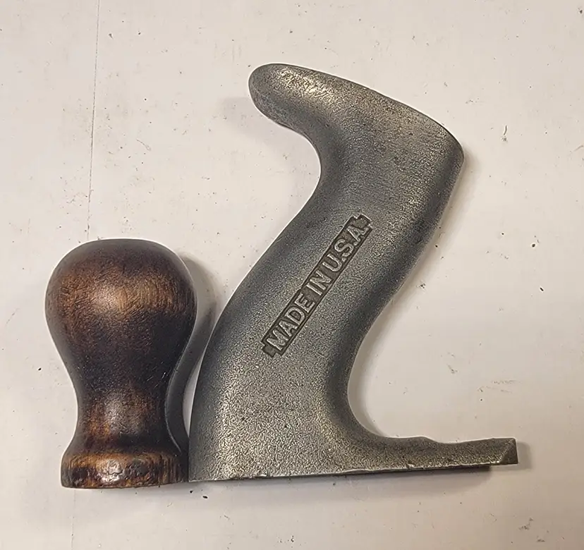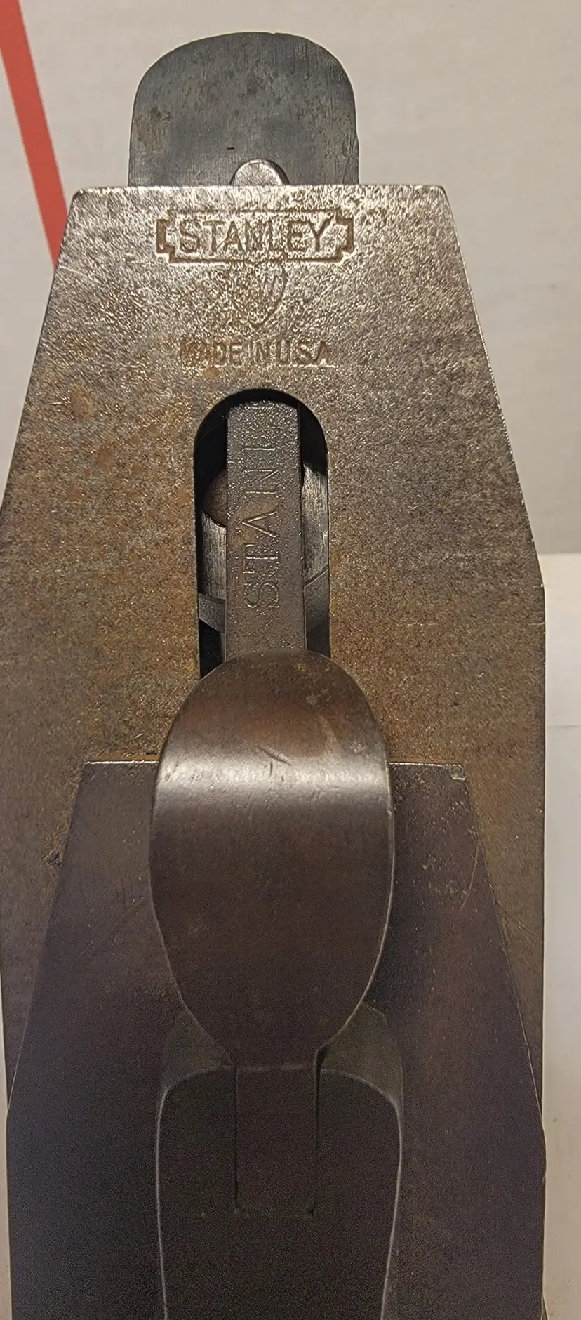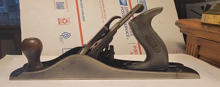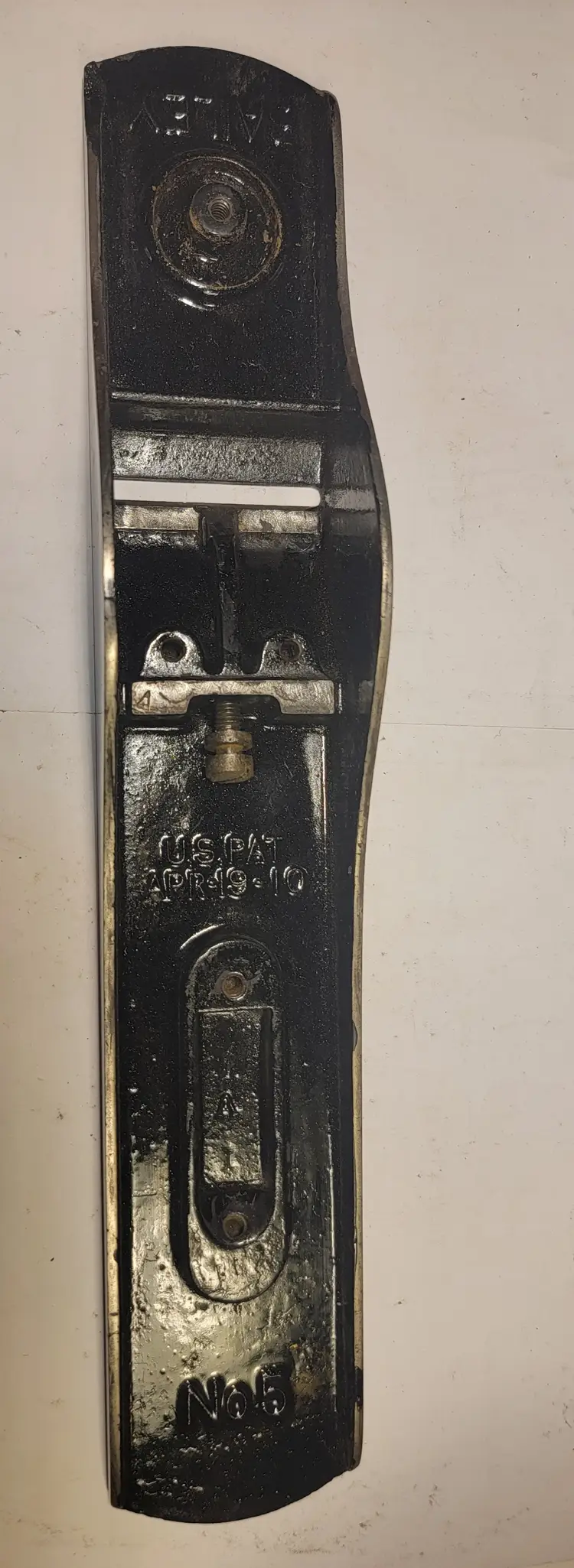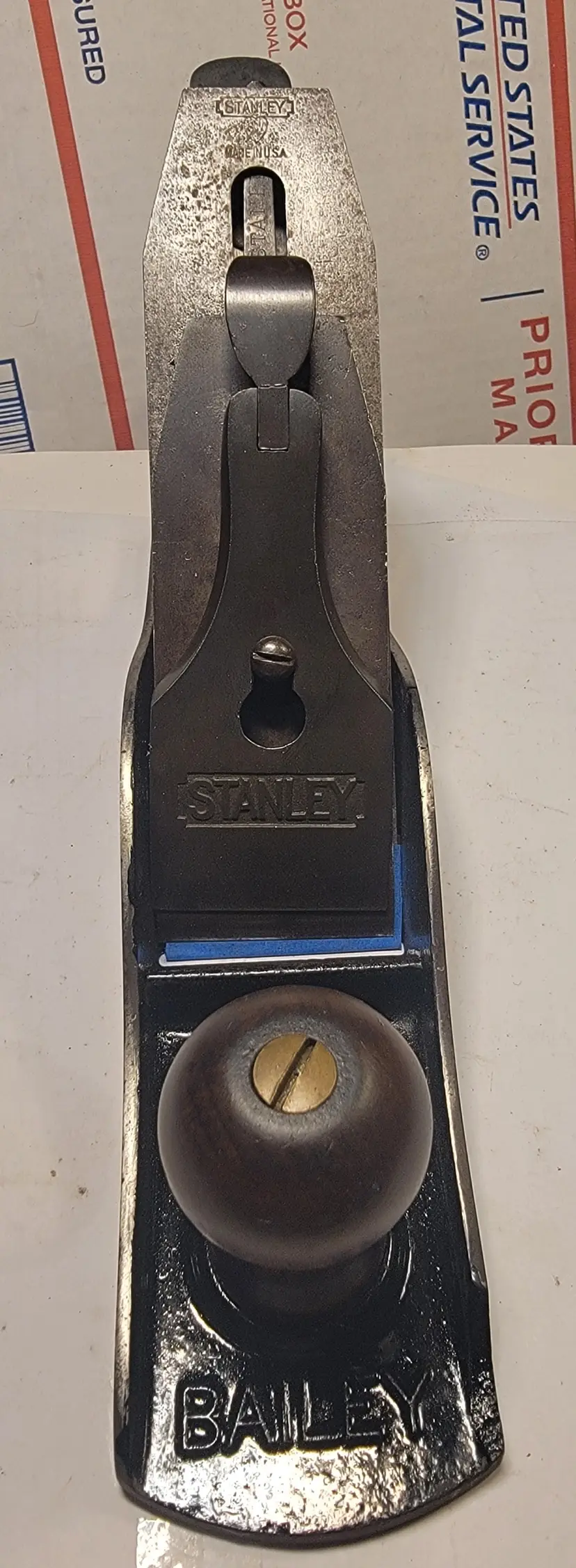 Up for sale is a nice Stanley #5 type 14 hand plane . Has the raised ring for the front knob, and the 1 patent date behind the frog. The Japanning was very spotty on it so I strippedd it off and re-Japanned it using Stanley's original factory recipe and baked it 5 times on low heat to set the Japanning. I have also flattened the sole and sharpened the iron going through the grits up to 8000. It has the AA sweetheart iron. As you can see it has Stanley's Alumimun tote on it . The front knob is in great shape no cracks. There are a couple of issues with the plane, both cosmic. There is a chip on the left side up by the toe. There is also a small crack on the left side just before the heal. This plane will make a great user and I have discounted the price I'm asking taking the damage into account.
