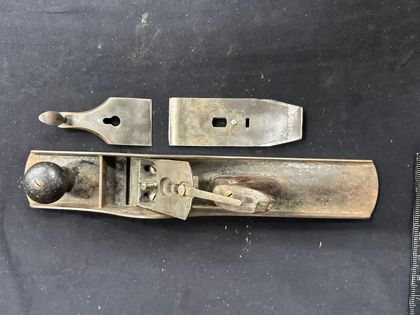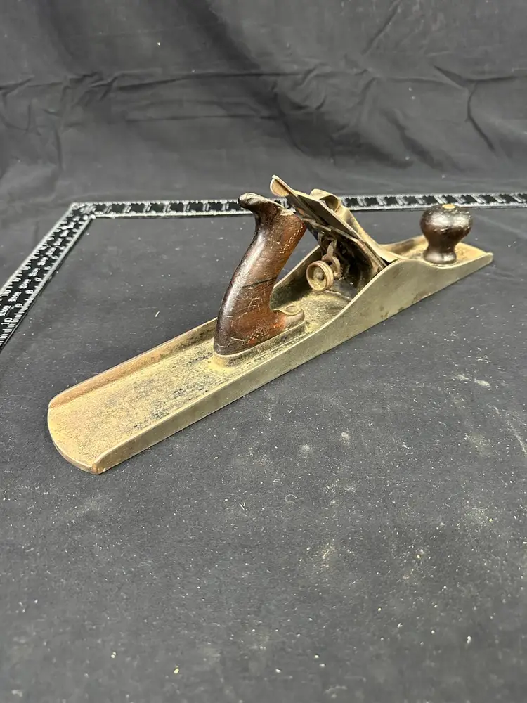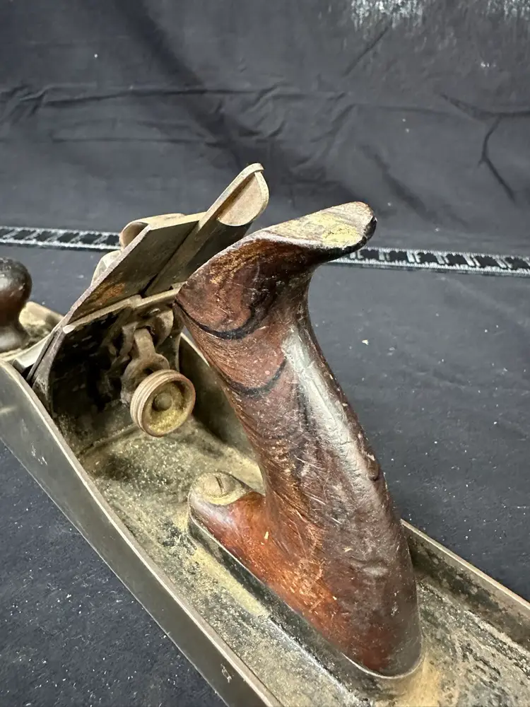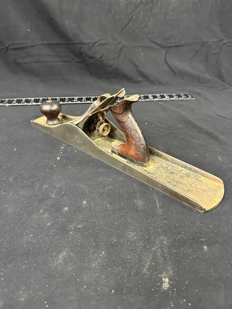 Stanley #6 fore plane in good worker condition. This is a very early example with the lower front tote. This plane comes from a collection of planes used in a hand tool woodworking school where it was in daily use. The blade on this plane is sharpened with a large camber to facilitate quick and heavy stock removal allowing for higher speed flattening of larger surfaces. There is a chip in the top of the rear tote but it is solid. There is a small amount of pitting on the sole near the mouth but it does not affect the use. To reduce shipping costs the front tote will be removed for shipping.