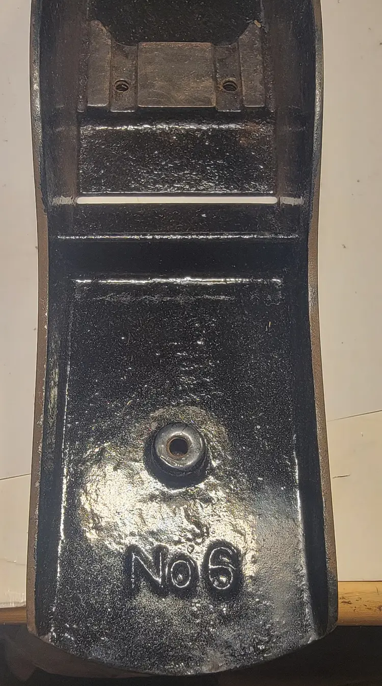 Up for sale is a nice Stanley #6 type 8 hand plane. This one has the corrugated sole and it is flat. The Japanning was very spotty on it so I stripped it off and re-Japanned it using Stanley's factory recipe and baking it 5 times on low heat. I have also sharpened the iron going through the grits up to 8000 and it is razor sharp. The rosewood tote and knob are crack free. The knob has some beautiful two toned stripes. The frog has the B casting mark on it and the 1 patent date on the lateral adj. lever, however the lever cap has the S casting mark usually seen on the type 7. This is typical Stanley using up old parts on newer type planes, you have to remember Stanley had nothing to do with typing these planes.