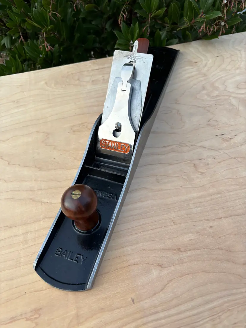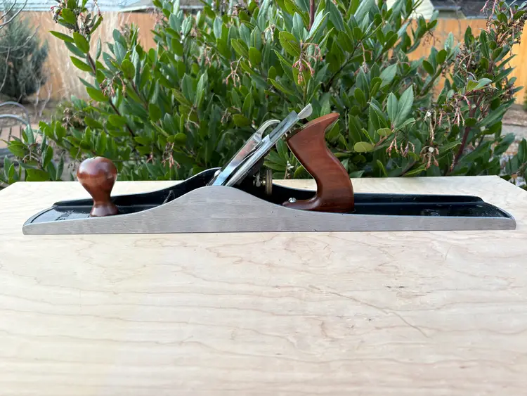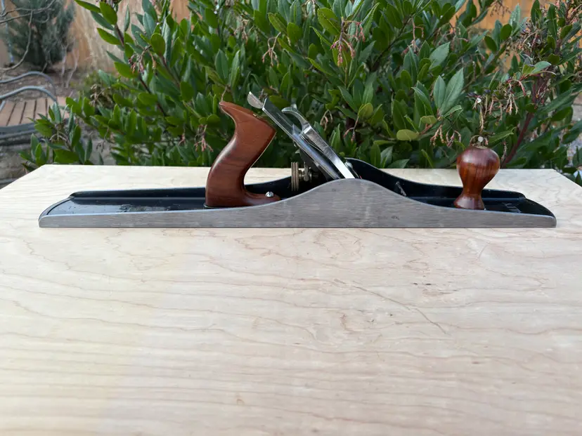 Stanley No 7 jointer plane. 22 inches long with a 2 3/8" wide Hock iron. Type 19 era (1948-1961). Knob and tote are later replacements. They are walnut and look brand new. Plane is in excellent shape overall. Lever cap is very bright and shiny. Iron is sharp and the plane is ready to work. The Hock iron is 3/32 thick, about 6 7/8" long, out of box length is 7", and is marked 98A which I think indicates its O1 steel.