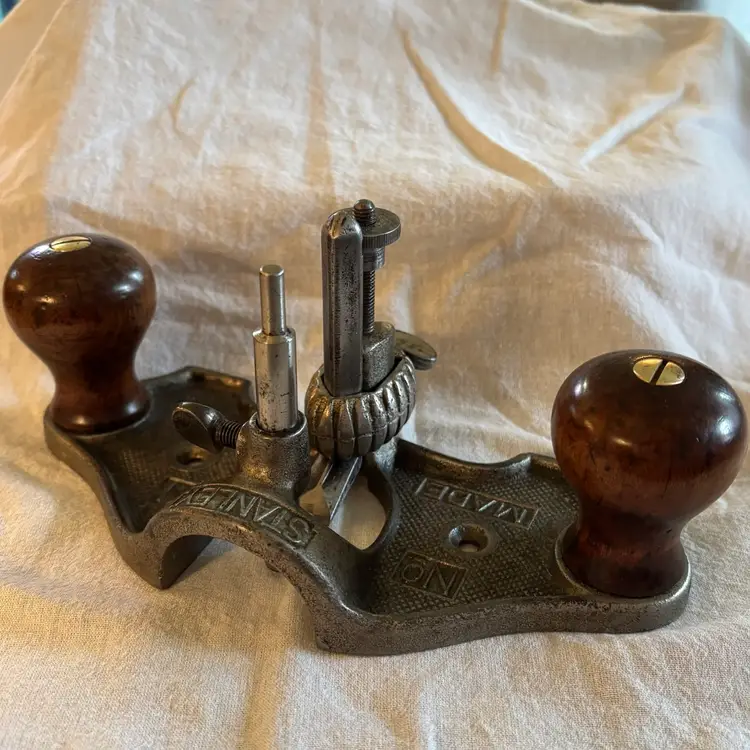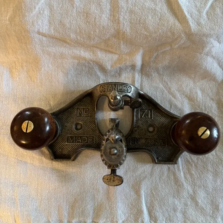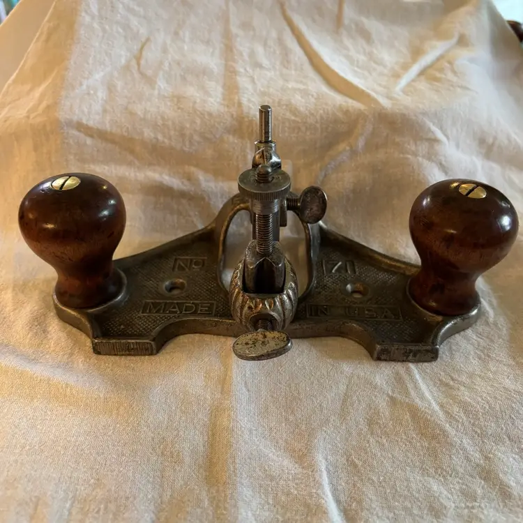 This listing is for a Stanley no. 71 router plane. The entire plane has been de-rusted and had a thin layer of paste wax applied to all metal surfaces. The cutter has been flattened and brought up to a 1000 grit edge. The 2 knobs have been cleaned, sanded, re-stained, & finished with shellac.