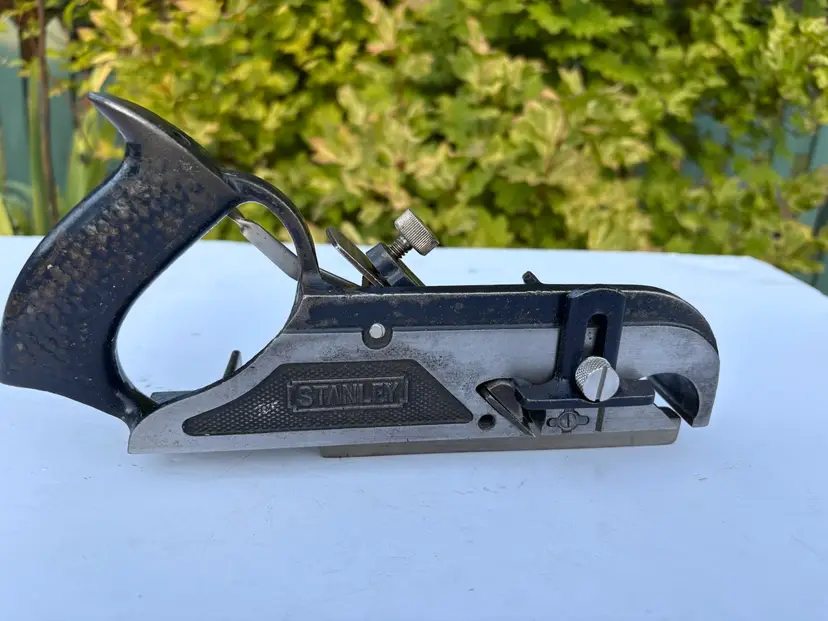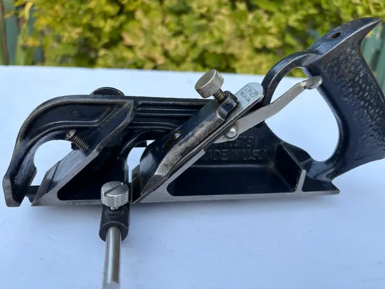Stanley No 78 duplex rabbet plane with the depth stop, fence and nicker/spur. This is the midnight blue one but other than color is the same as black one it replaced. Cleaned, flattened the bottom and sharpened the iron. Ready to make shavings.