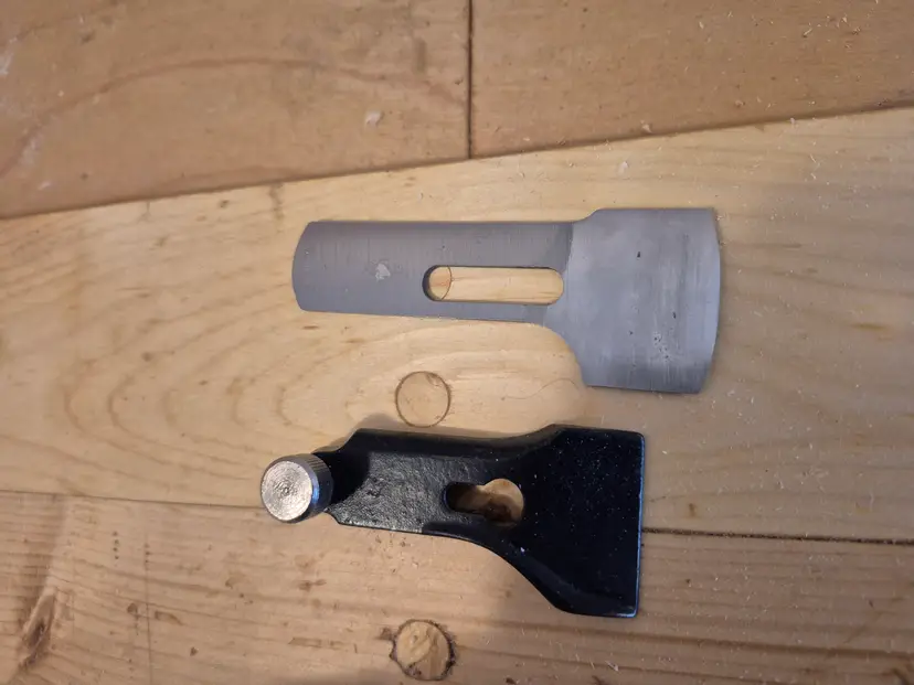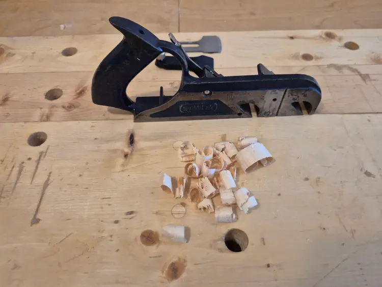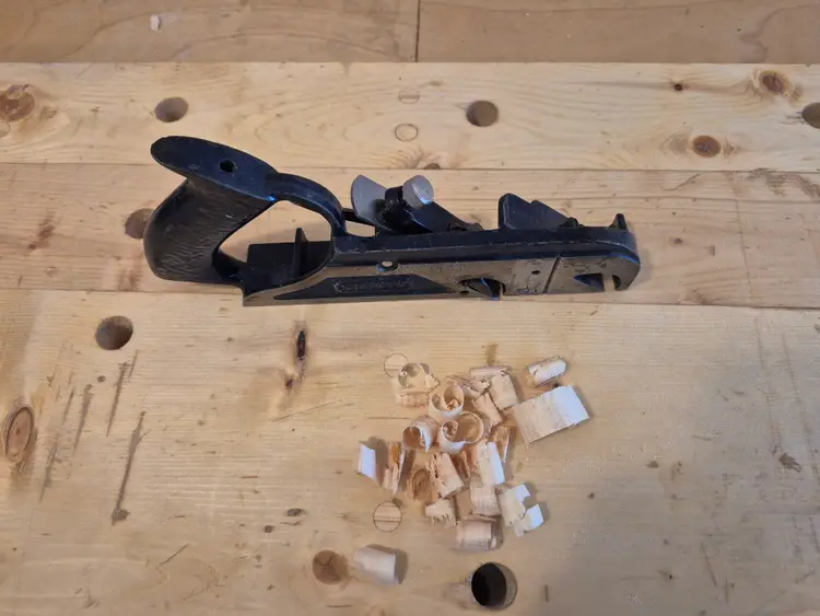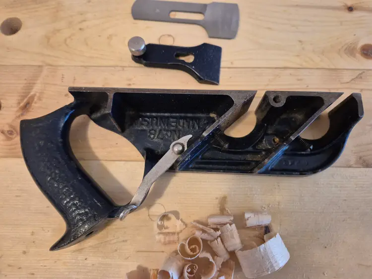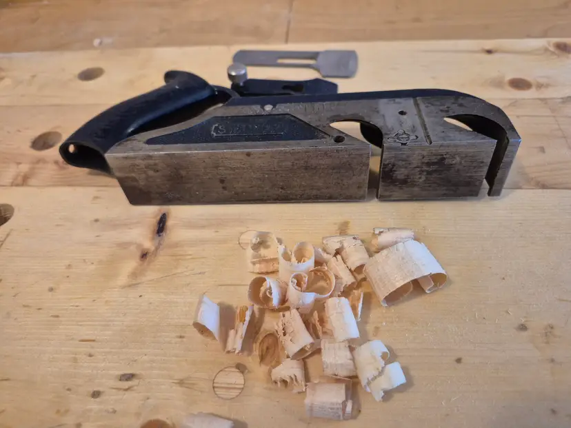 This is a vintage Stanley #78 which has the blade heavily cambered for scrub work. I converted it based on a recommendation by Paul Sellers that the narrow width of the 78 better matches the size of traditional scrub planes and I have to say he was right, it works great! This thing takes nice deep cuts, is great for quickly trimming down edge grain or traversing board grain when thicknessing.