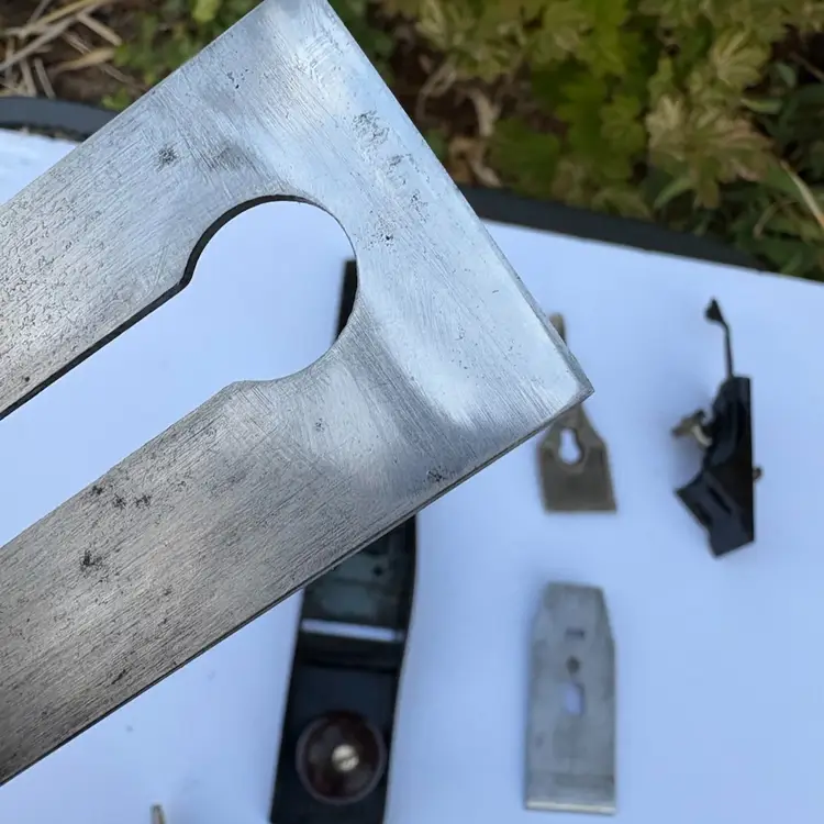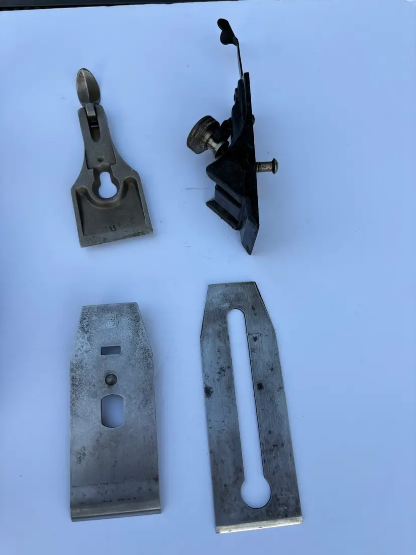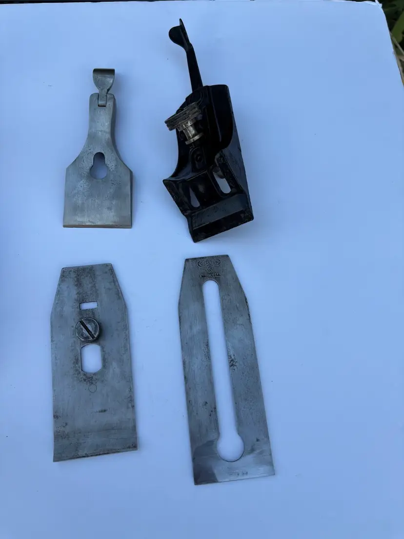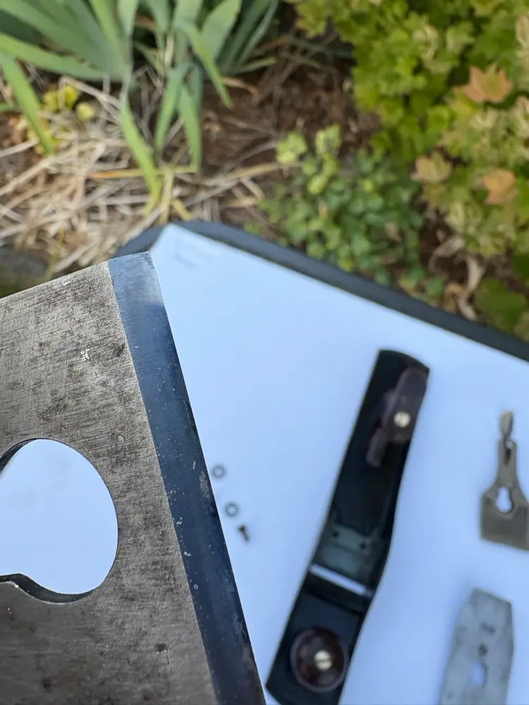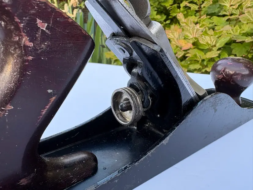 See the pictures. Knob and tote are hardwood. They have scuffs in the top coat, but no cracks or repairs. A previous owner painted it black, it was a grey-green. The paint itself is fine, but they did paint the lateral, the adjuster knob and frog - without removing the frog first. I removed the paint from the adjuster. When assembled the paint job looks okay.