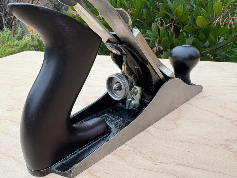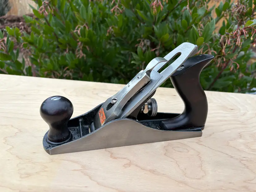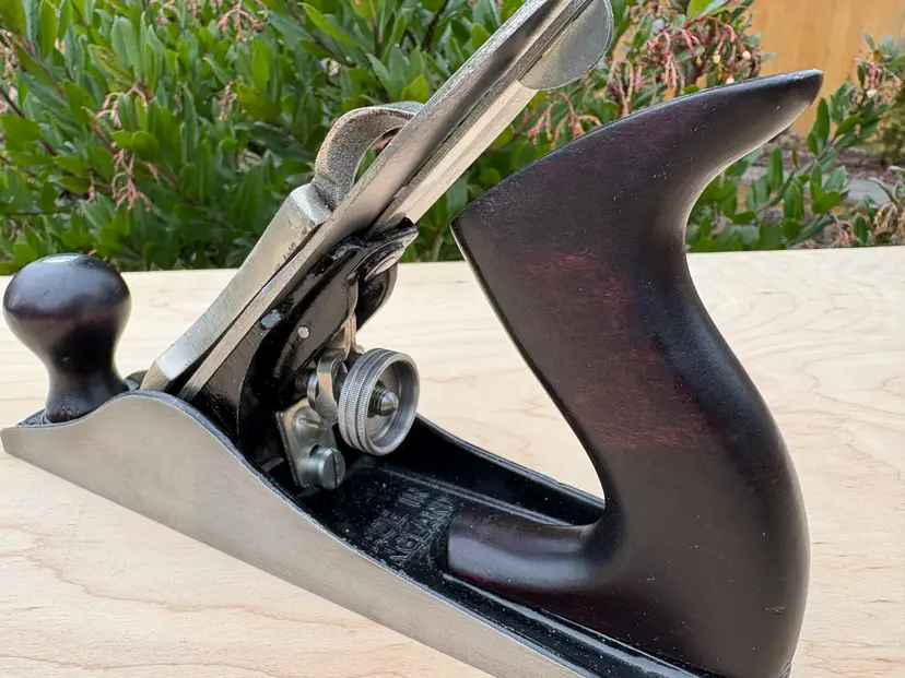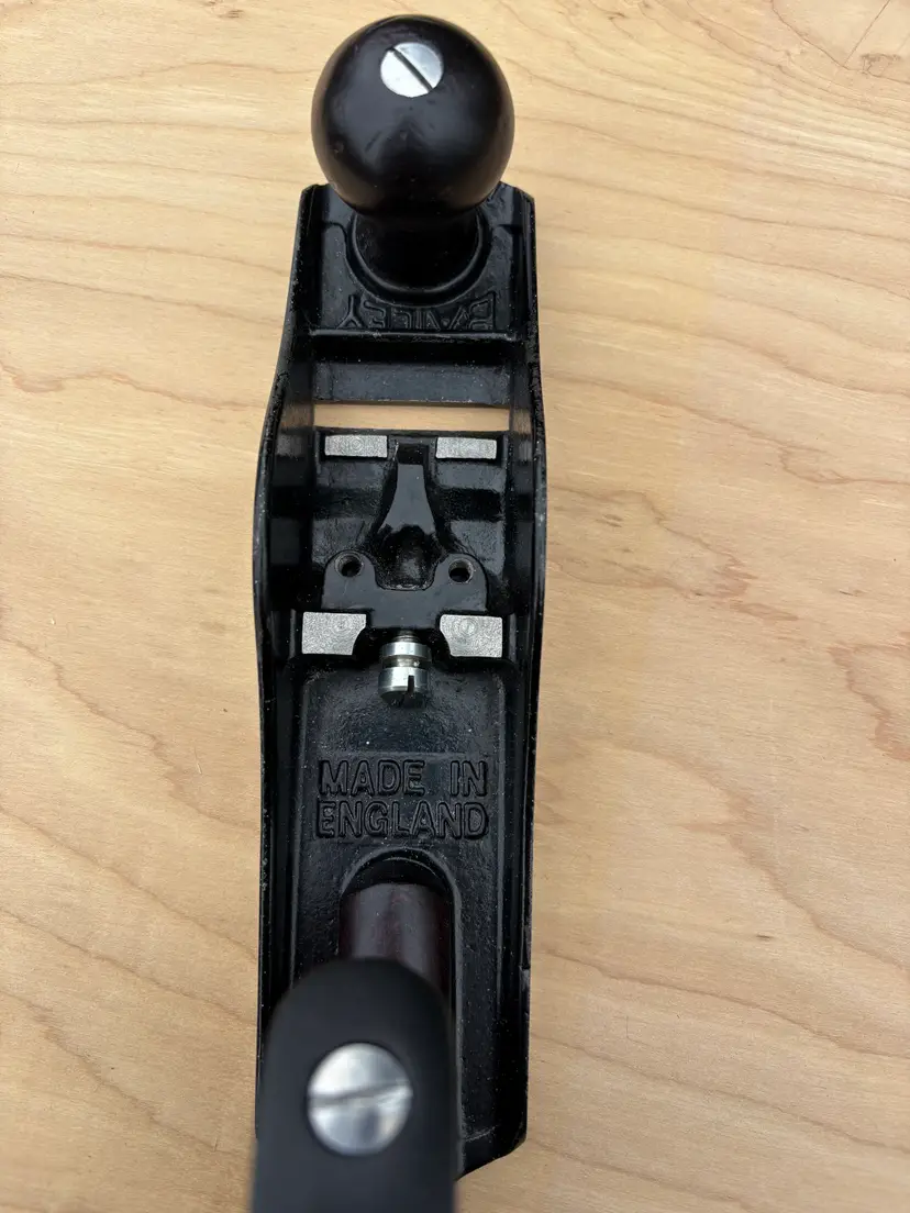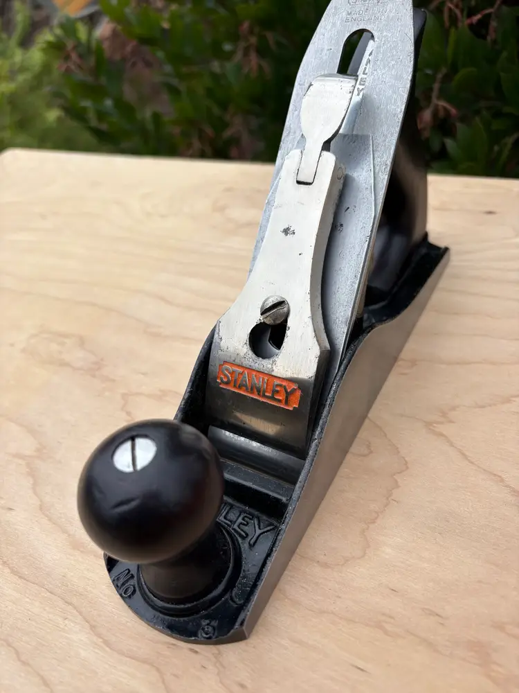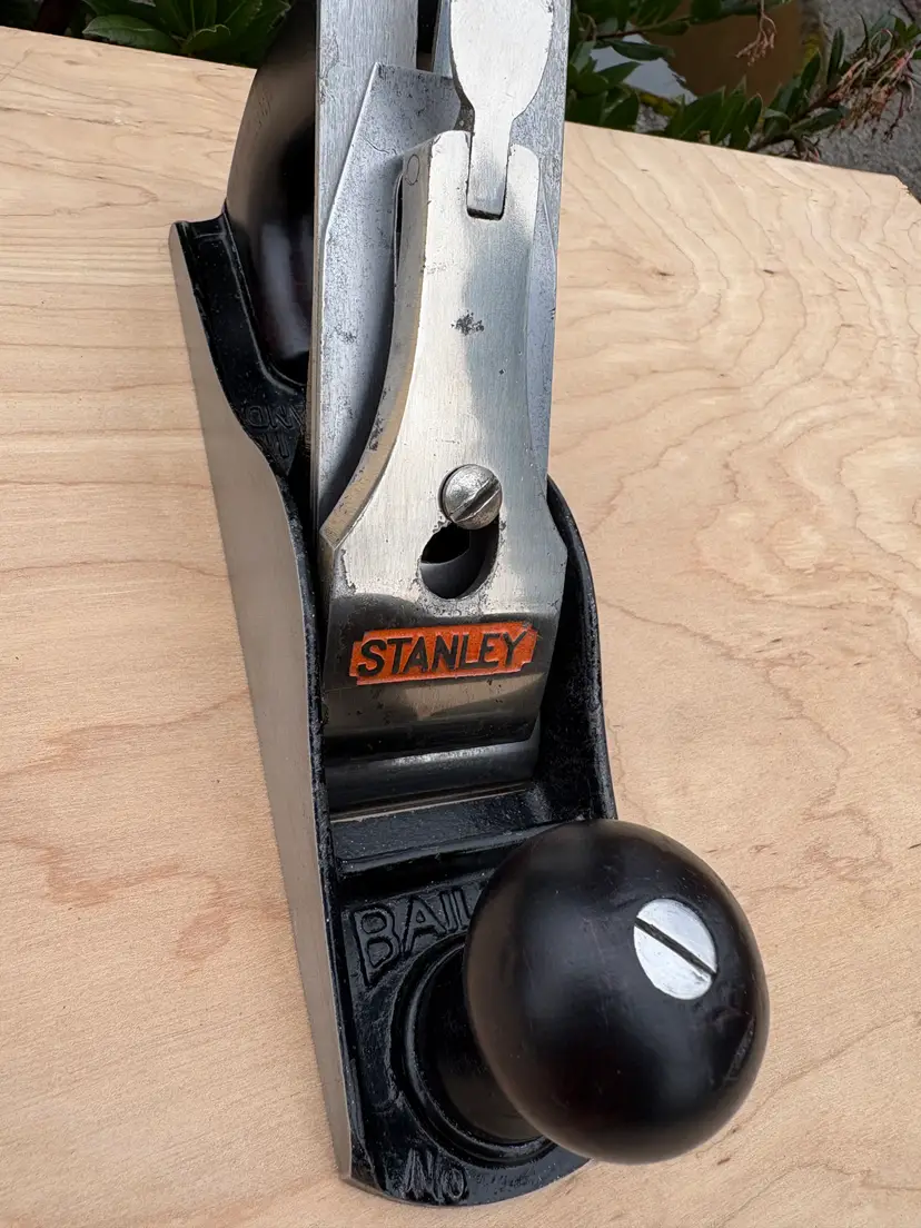 Stanley Bailey No 3 smoothing plane. Made in England. 1 3/4" wide iron. Cleaned, iron sharpened and bottom flattened. Ready to make shavings. I redid the hardwood tote and knob a deep red after removing a horrid bright green paint job. Being made in England it does not follow the standard type study. The body has the arched buttress frog receiver design same a US type 19. Nuts for the tote and knob are aluminum. I added a steel depth adjuster to match. Has the frog adjustment screw and the split adjustment yolk. All screws and threading are the same as US Stanley planes.