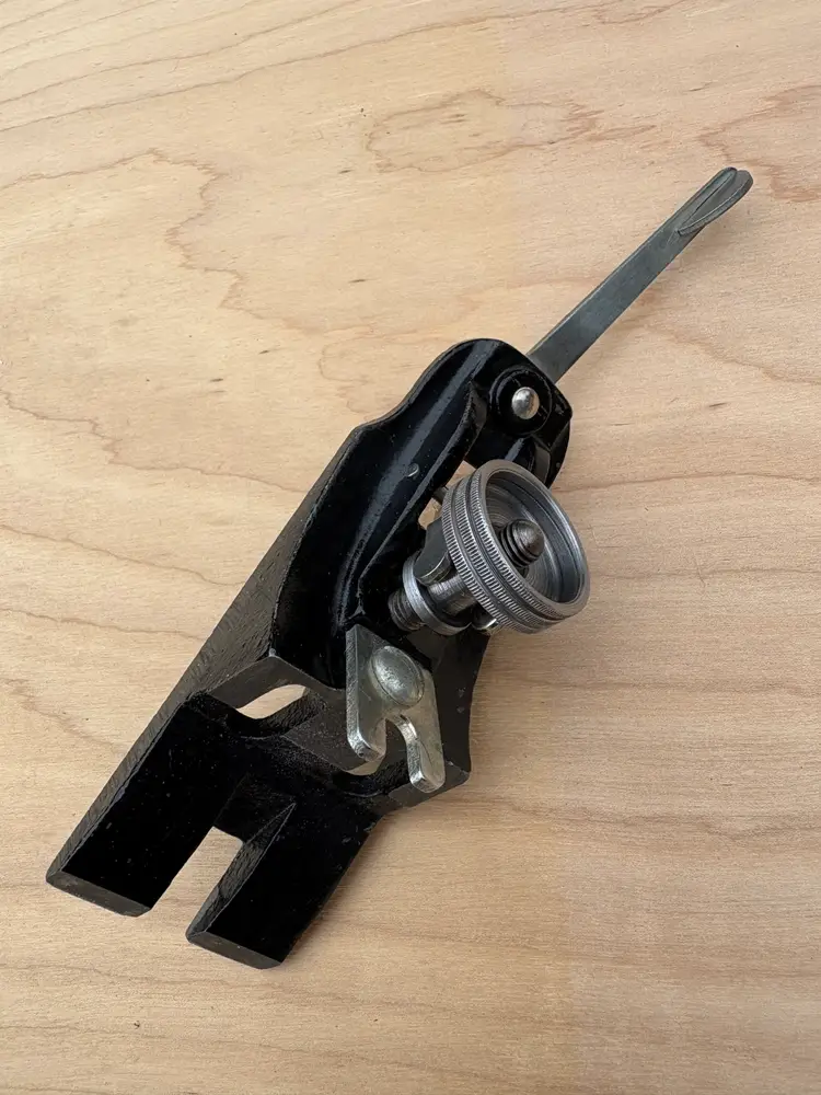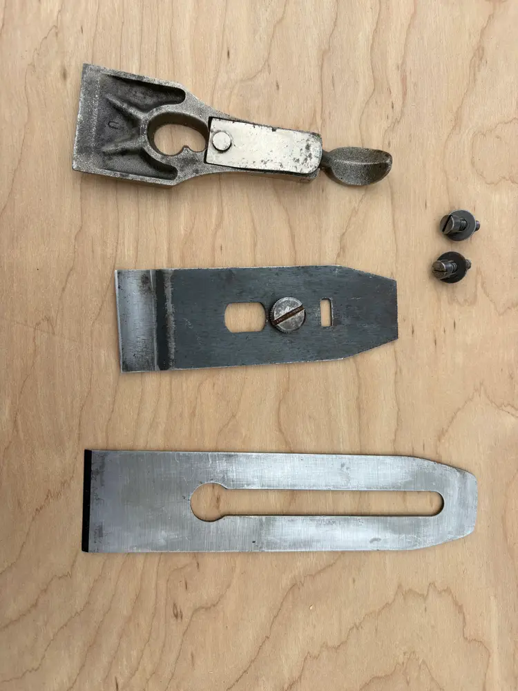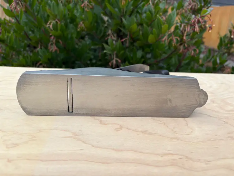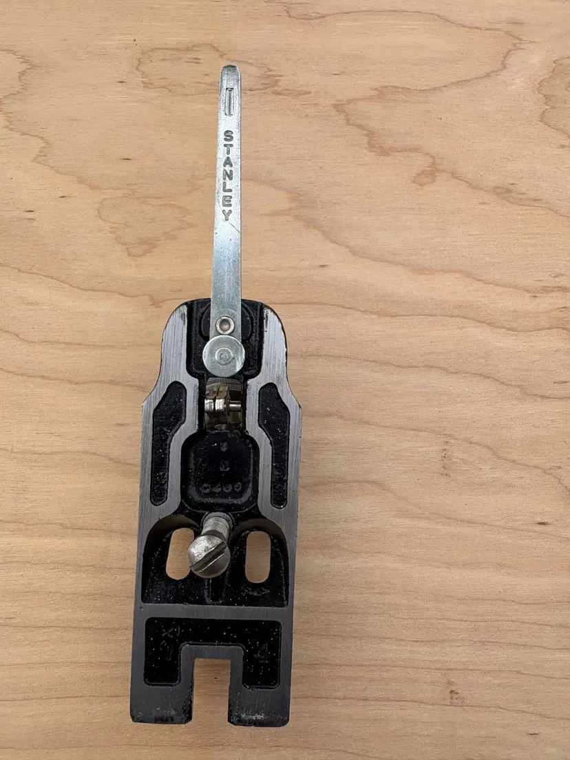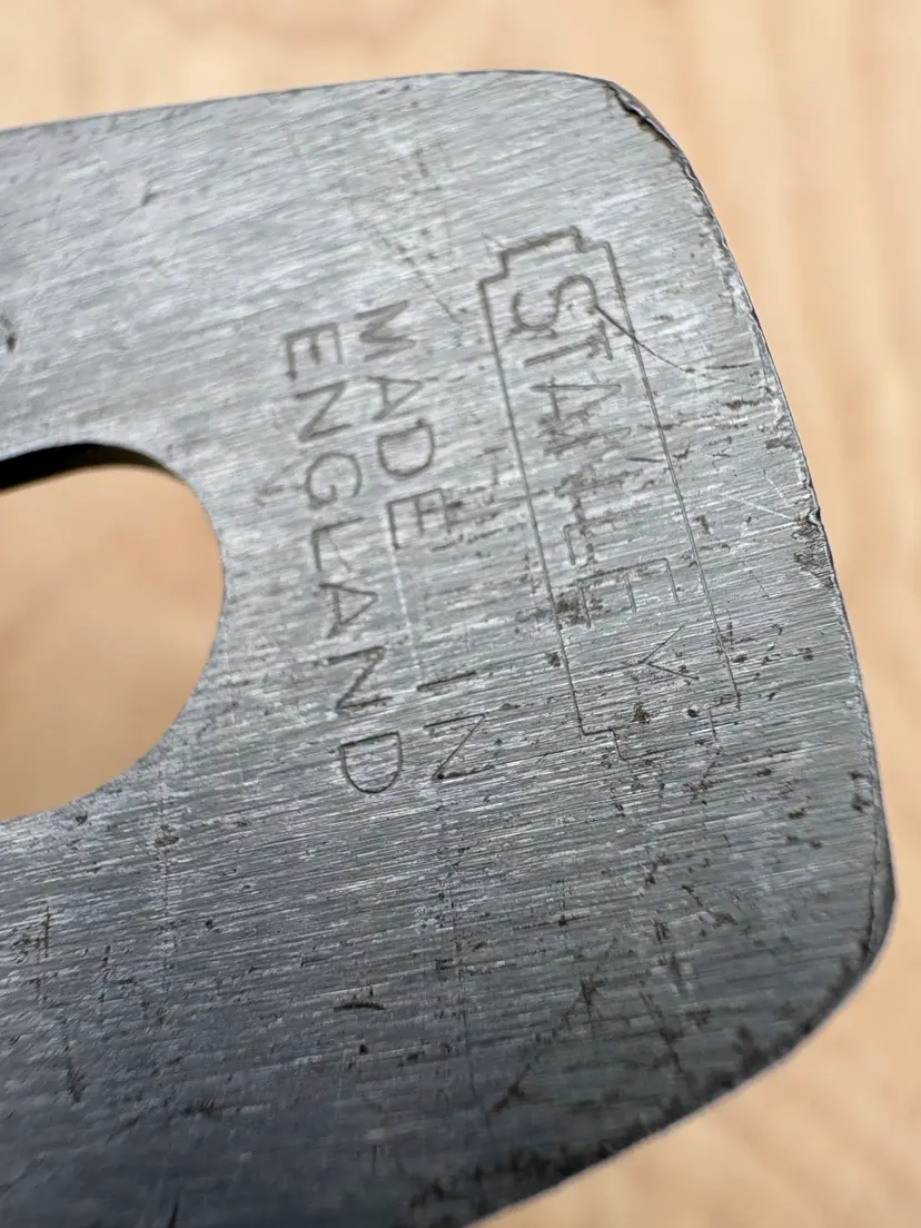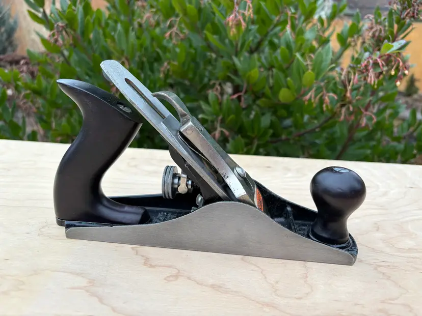 Stanley Bailey No 3 smoothing plane. Made in England. 1 3/4" wide iron. Cleaned, iron sharpened and bottom flattened. Ready to make shavings. I redid the hardwood tote and knob a deep red after removing a horrid bright green paint job. Being made in England it does not follow the standard type study. The body has the arched buttress frog receiver design same a US type 19. Nuts for the tote and knob are aluminum. I added a steel depth adjuster to match. Has the frog adjustment screw and the split adjustment yolk. All screws and threading are the same as US Stanley planes.