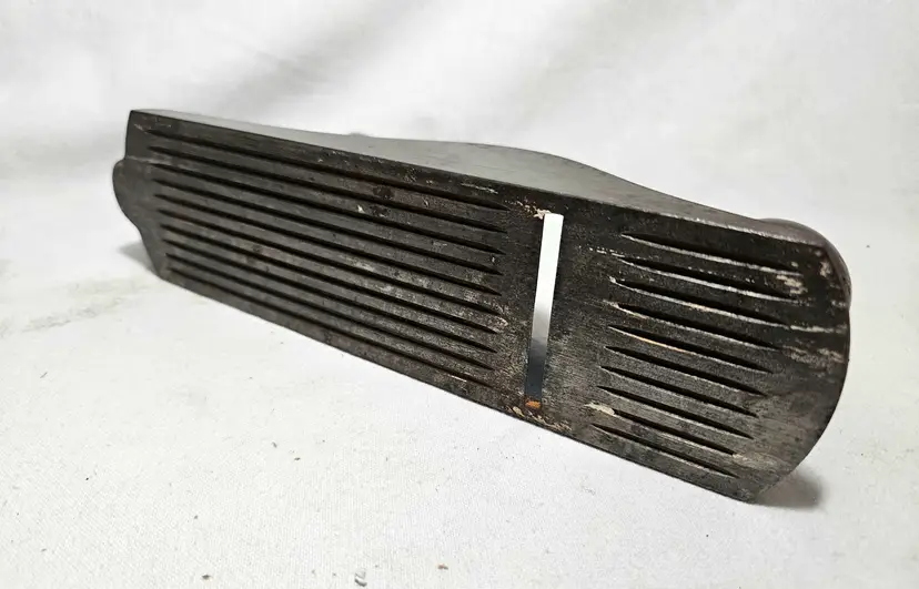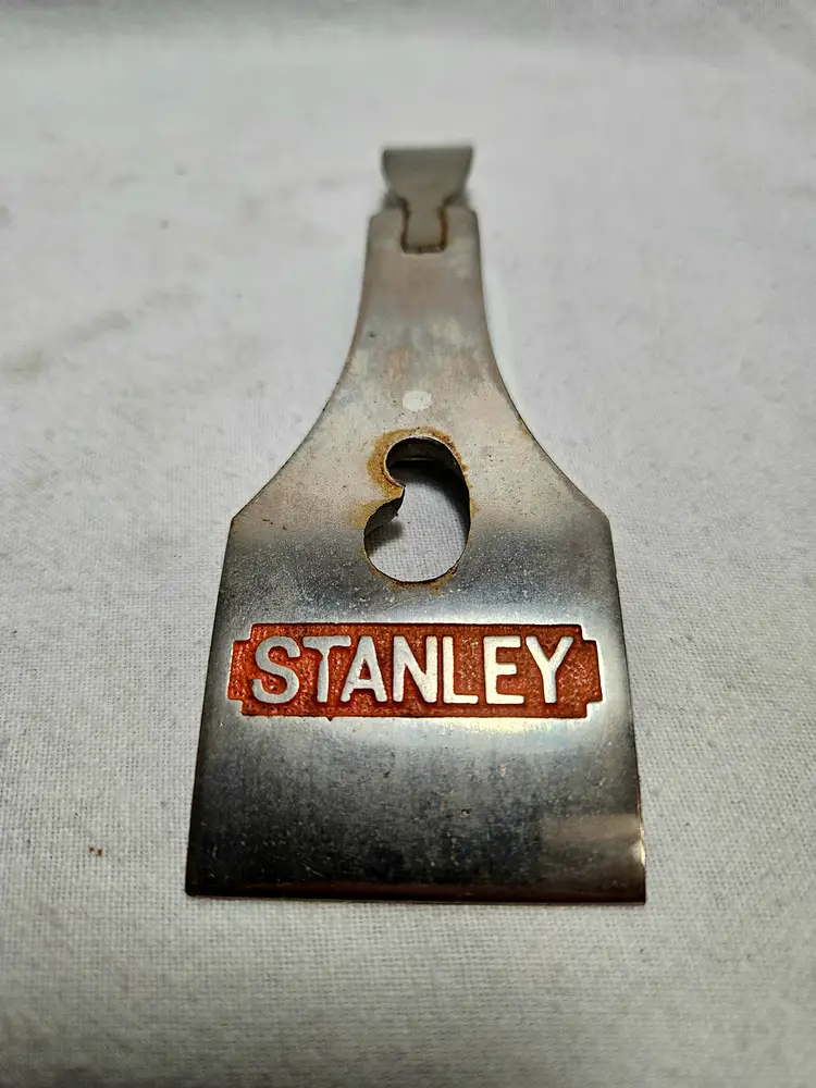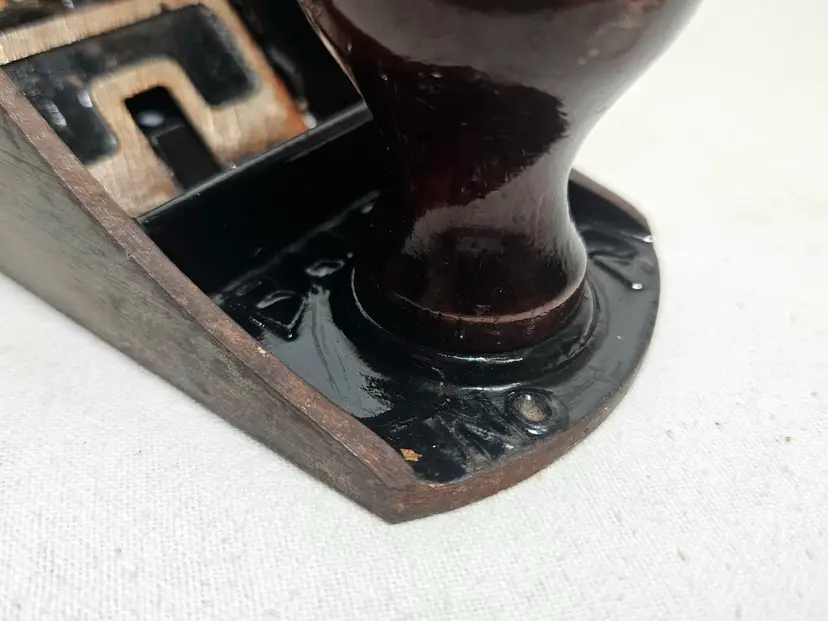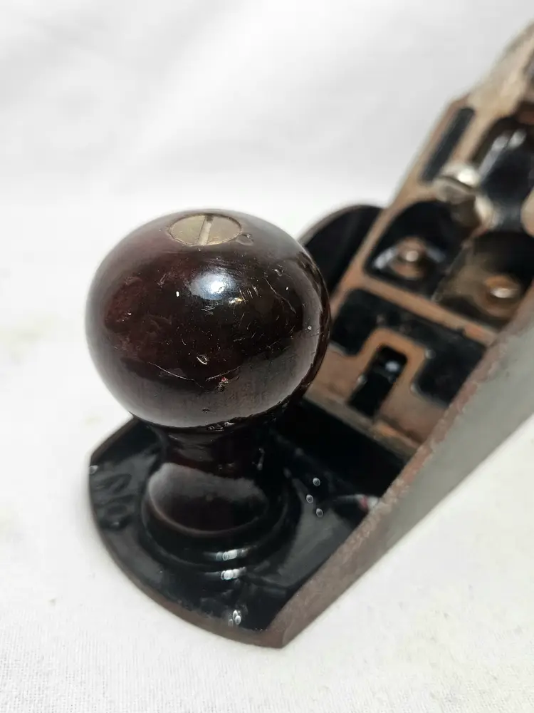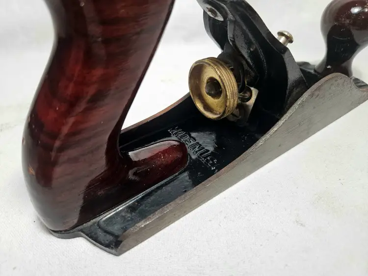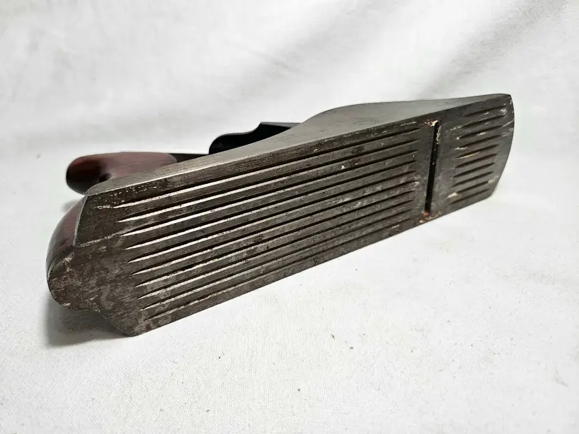 Corrugated smoother in fine condition. Slight surface rust from sitting. Japanning is excellent, full coverage and still shiny. Wood tote and knob have no issues with original finish. Bright orange paint outlining the Stanley logo on the lever cap. No apologies on this one. Probably used once and put away on the shelf.