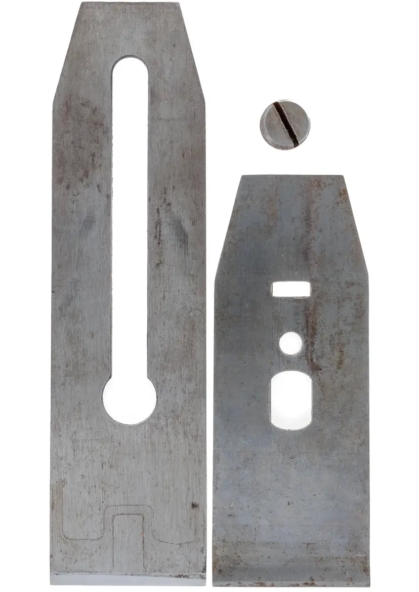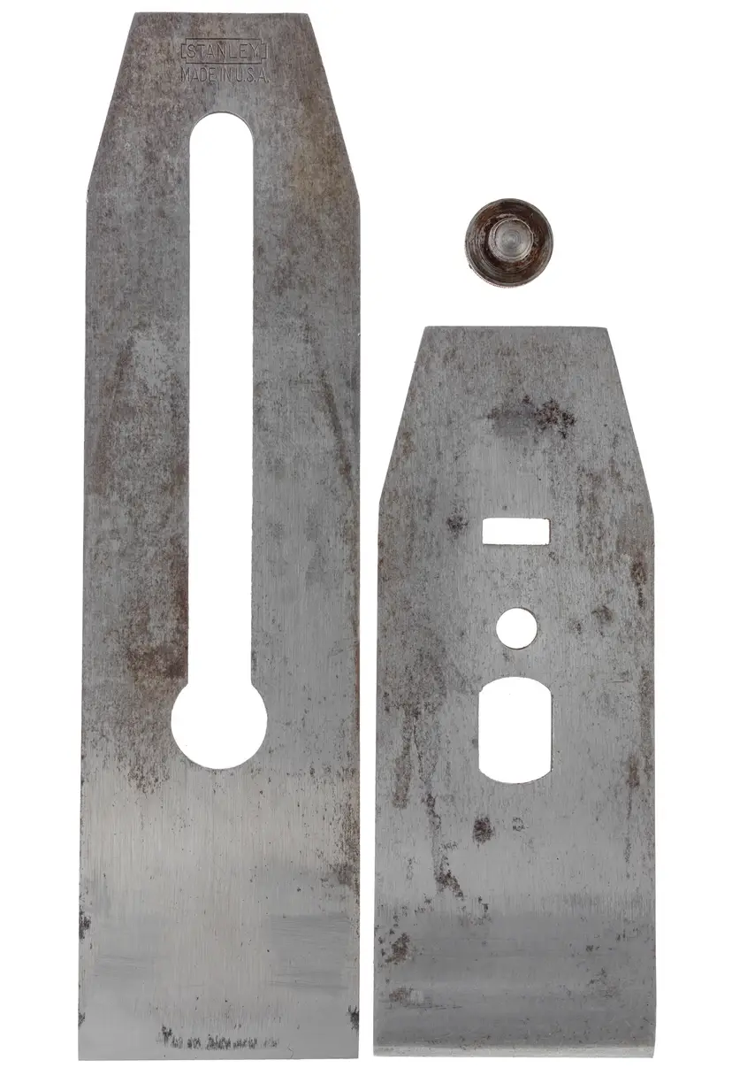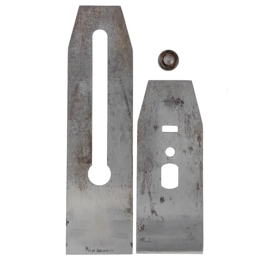 A nice sharp 2" wide double iron for Stanley's metallic bench planes. It will fit all metallic stanley planes that require a 2" wide iron with the standard bailey style cap iron. It has the "BB" trademark, as well as a 1936 date code stamp. The bevel has been sharpened, and the face has been flattened with an extra course diamond plate; final honing will be left up to the new owner. 7-3/8" long.