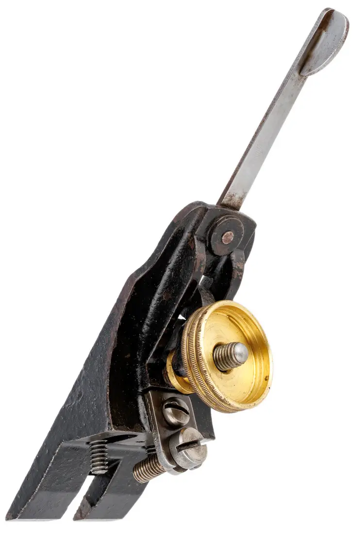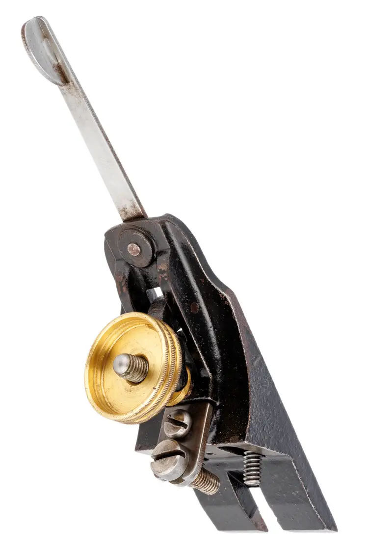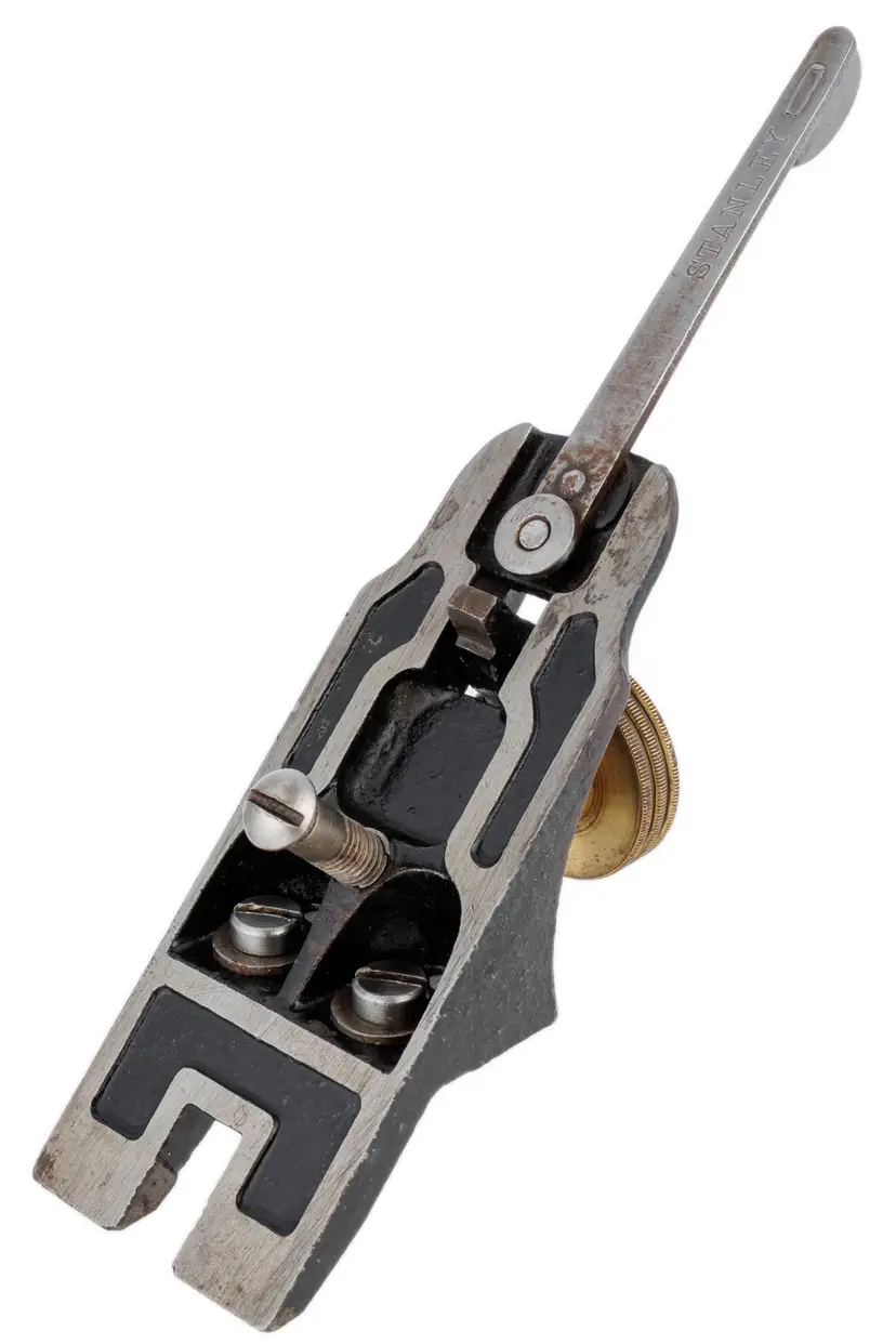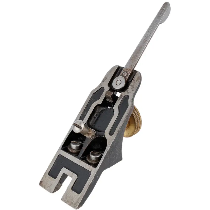 A Good Plus frog assembly for Stanley's vintage No. 3 and No. 5-1/4 metallic bench planes. This one is a type 16, used from 1933 to 1941. It has no damage. A solid user original replacement for a damaged frog. Includes all parts of the frog shown (complete). 1-3/4" wide.