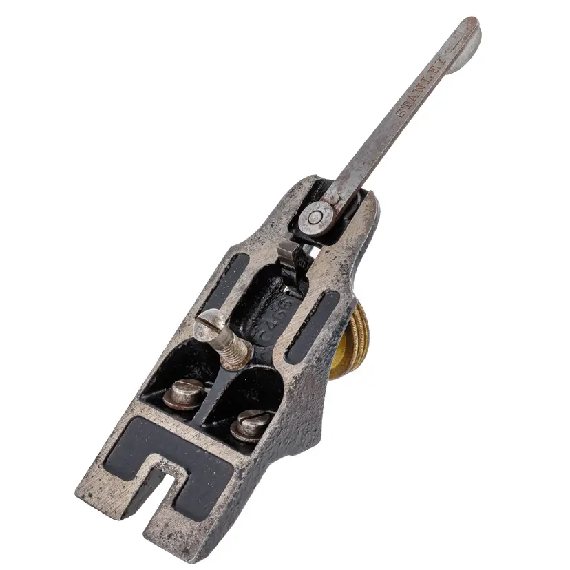 A Good Plus frog assembly for Stanley's vintage No. 4 and No. 5 metallic bench planes. This one is a type 16, used from 1933 to 1941. It has no damage. A solid user original replacement for a damaged frog. Includes all parts of the frog shown (complete). 2" wide.