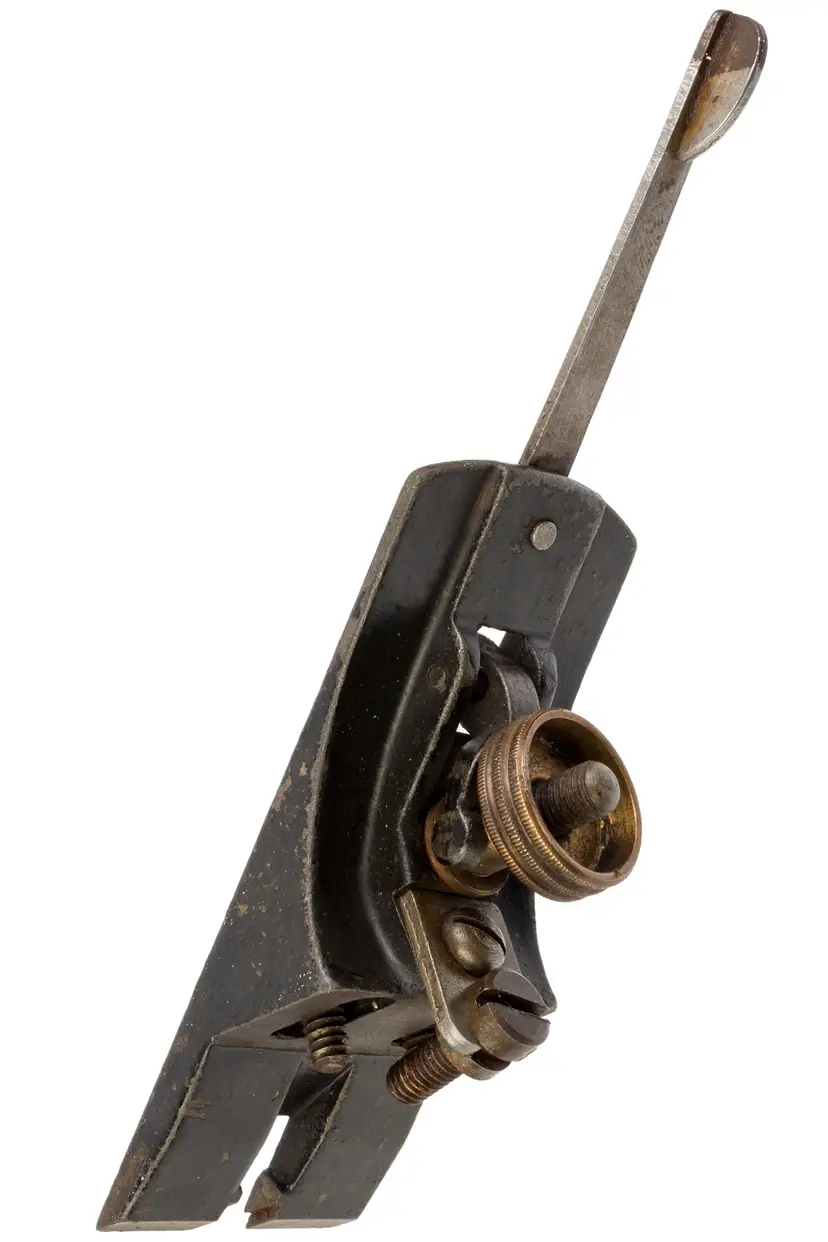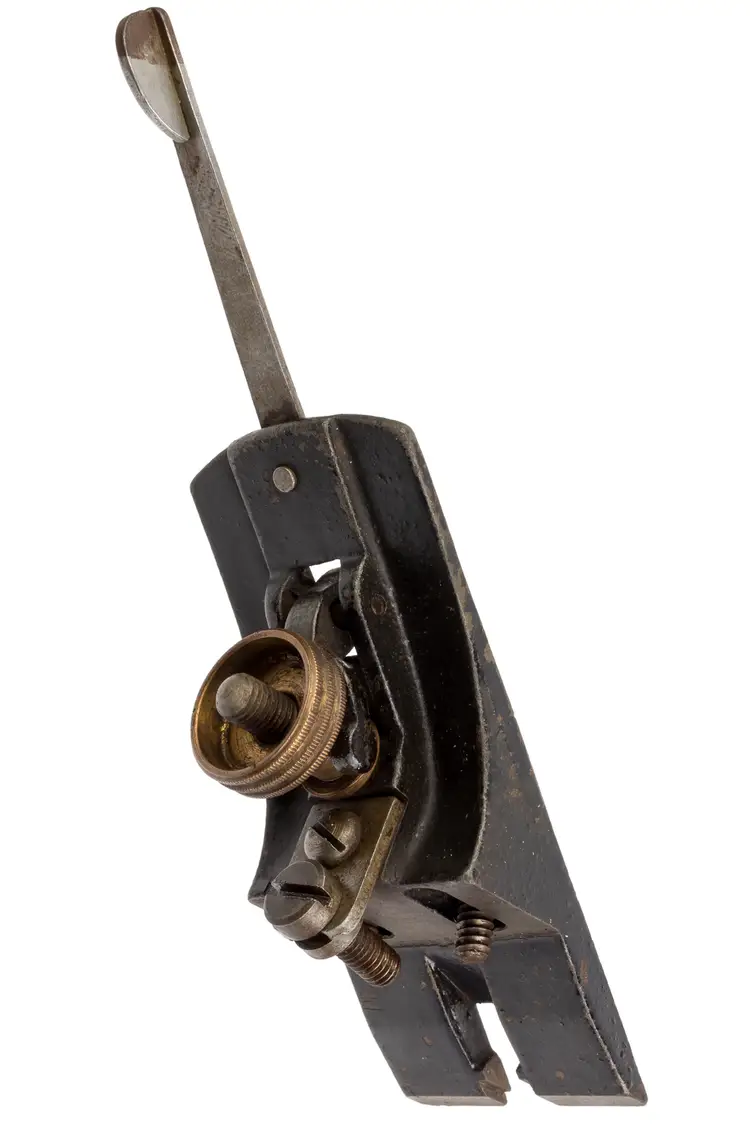 A Good Plus replacement frog assembly for Stanley's No. 3, and 5-1/4 hand planes. It is 1-3/4" wide and is the style of the type 11-16 era, although it has the small brass depth adjust nut which is specific to the type 11 planes. There is no damage or functional issues and it works perfectly.
