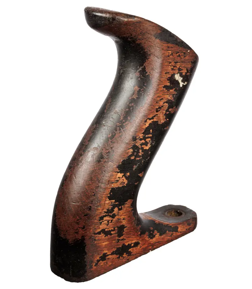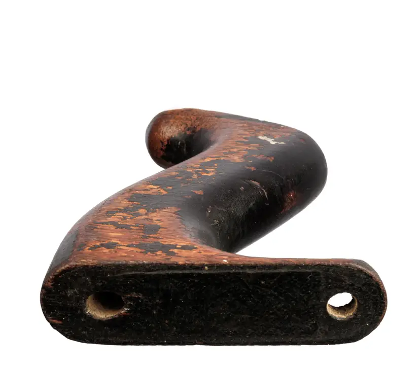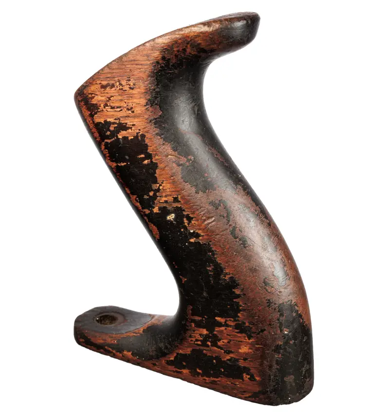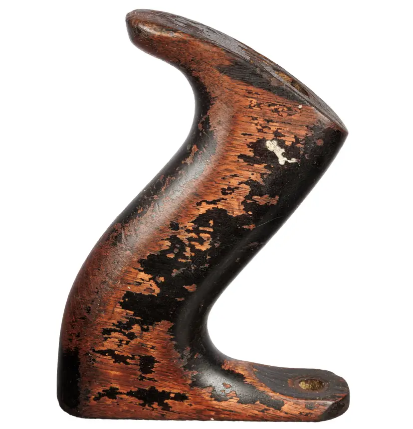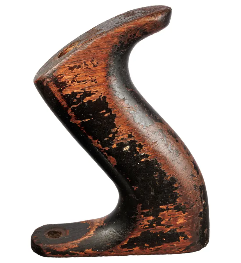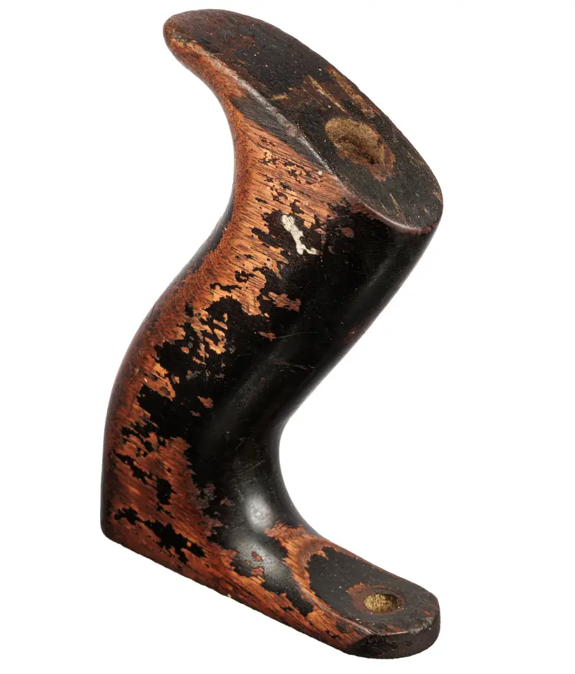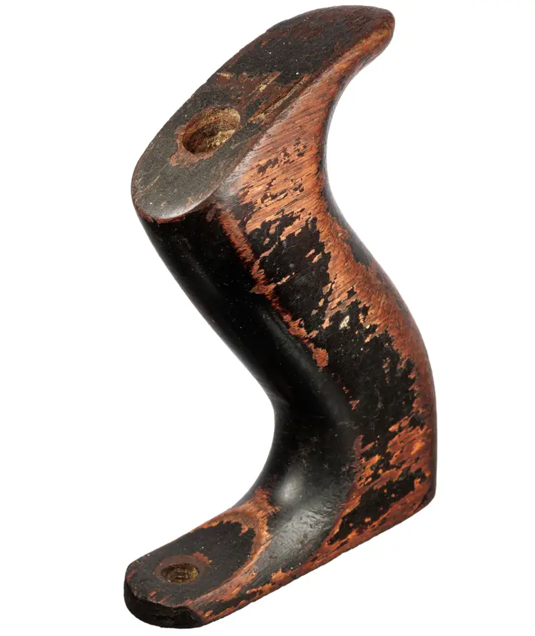 A solid useable handle for stanley's vintage Type 18 hand planes. It was donated from a type 18 plane and is not rosewood, but a hardwood with a black finish. It is the larger size which fits plane numbers 4-1/2, 4-1/2C, 5, 5C, 5-1/2, 5-1/2C, 6, 6C, 7, 7C, 8, 8C. There is moderate wear in the finish but no damage, and it does not include the original screws.