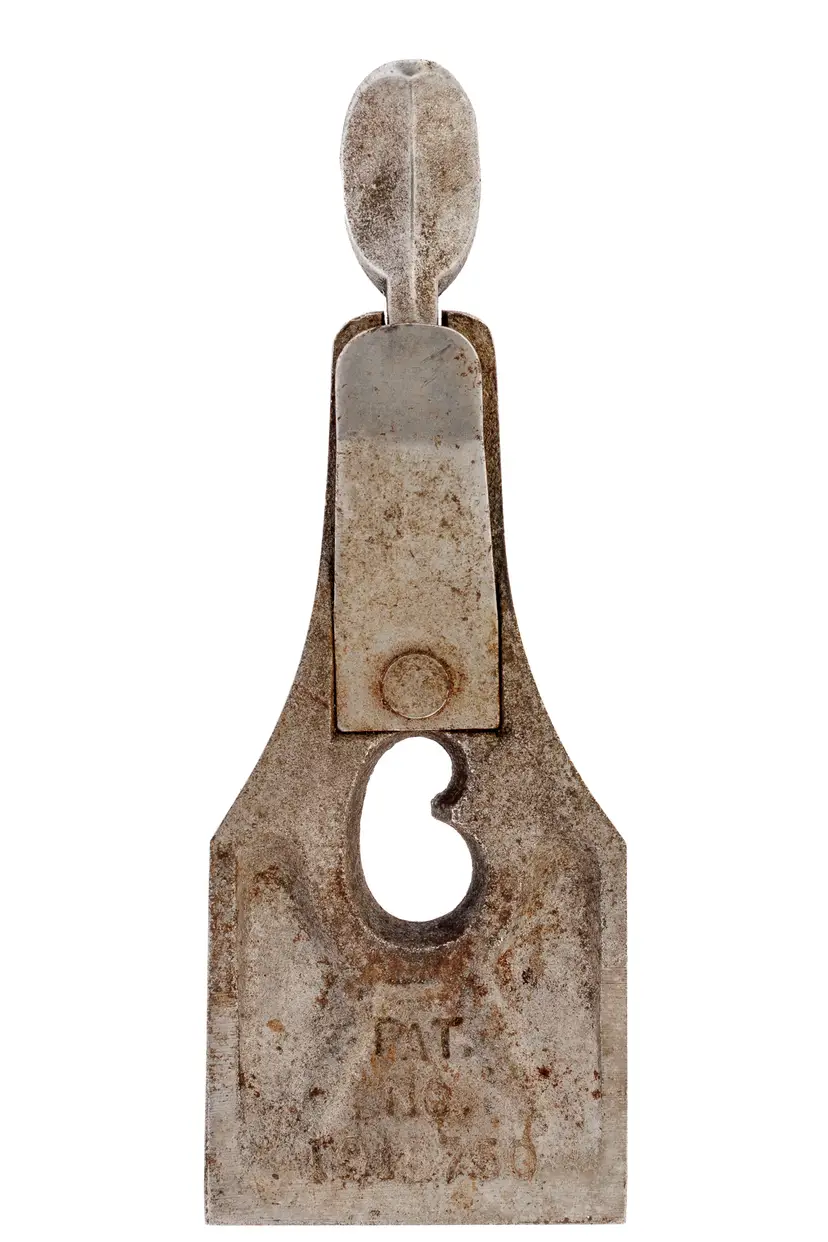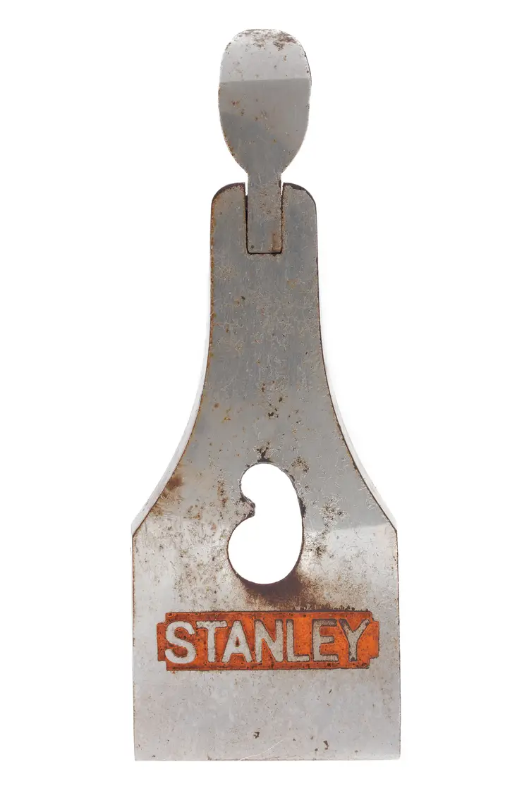 A solid 2" wide replacement lever cap for Stanley's No. 4 and No. 5 metallic bench planes. It has some wear in the original nickel plating. It was donated from a type 16 plane and has the patent number for the kidney-shaped hole in the recess. It will also work fine with types 17-19 as the specs are the same - only the markings (and, in some cases the finish) would be different.