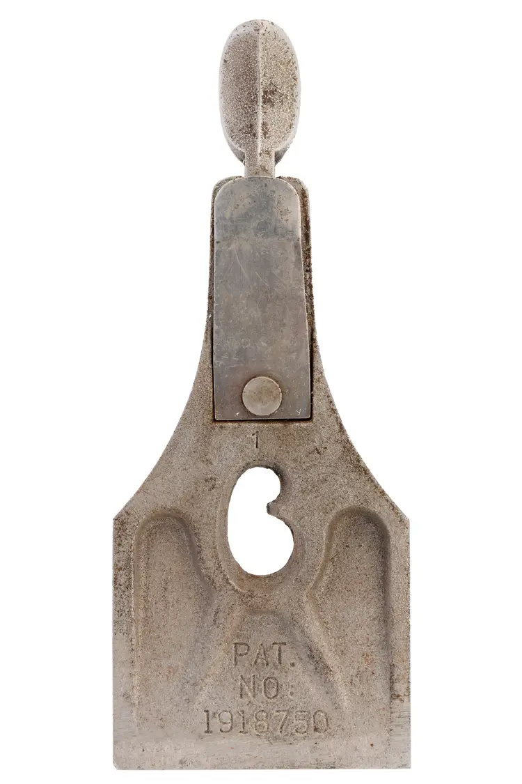A Good Plus 2-3/8"" wide replacement lever cap for Stanley's No. 4-1/2, 5-1/2, 6, and 7 metallic bench planes. It has minor wear in the original nickel plating, as well as some surface scuffs. It was salvaged from a type 16 plane and has the patent number for the "kidney" shaped screw hole in the recess. It will also work fine with types 17-19 as the specs are the same - only the markings (and, in some cases the finish) would be different. One corner has a very tiny chip.
