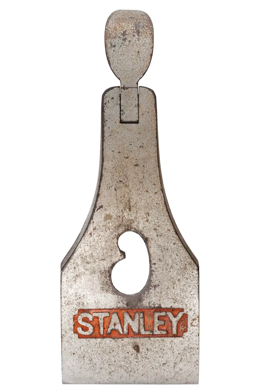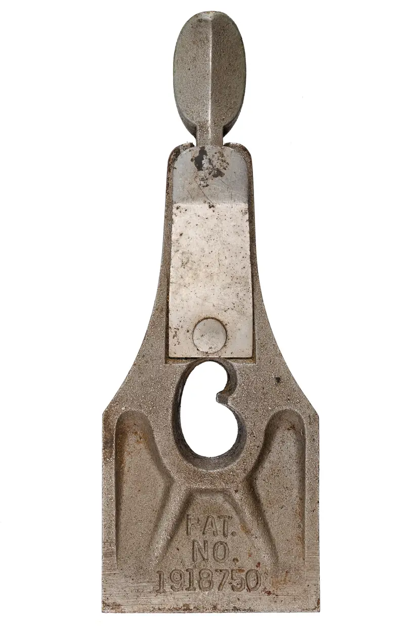 A solid 2" wide replacement lever cap for Stanley's No. 4 and No. 5 metallic bench planes. It has some wear in the original nickel plating. It was donated from a type 16 plane and has the patent number for the kidney-shaped hole in the recess. It will also work fine with types 17-19 as the specs are the same - only the markings (and, in some cases the finish) would be different.
