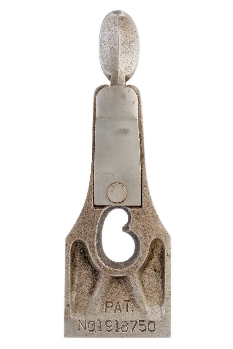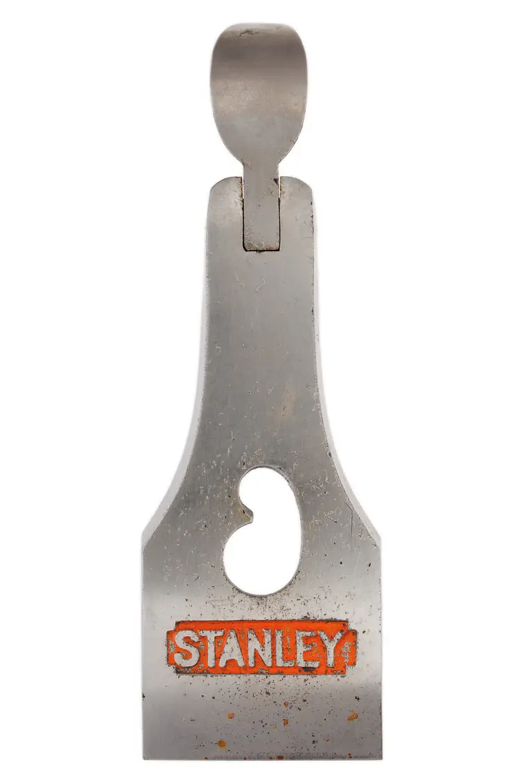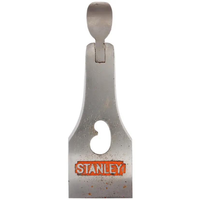 A solid 1-3/4" wide replacement lever cap for Stanley's No. 3 and No. 5-1/4 metallic bench planes. It has light wear in the original nickel plating, as well as some surface scuffs. It was donated from a type 16 plane and has the patent number for the "kidney" shaped screw hole cast in the recess. It will also work fine with types 17-19 as the specs are the same - only the markings (and, in some cases the finish) would be different.