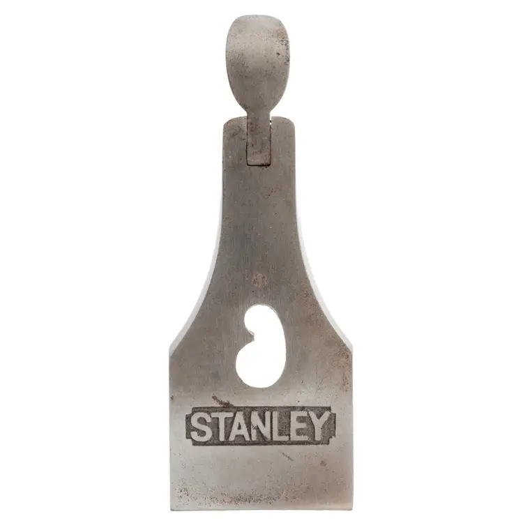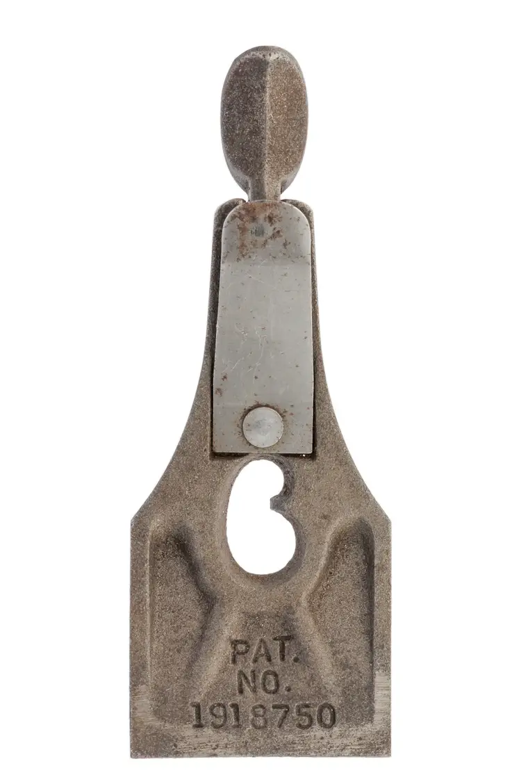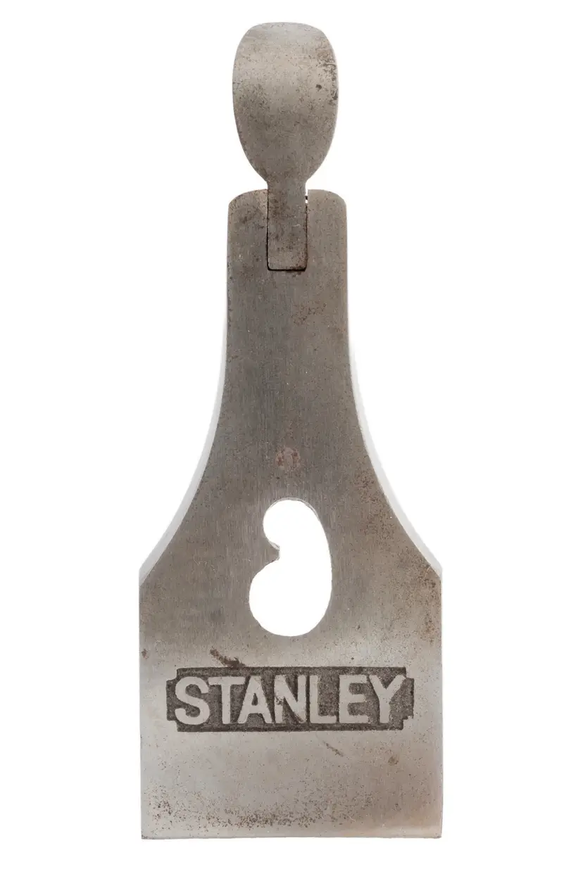 A Good Plus 2" wide replacement lever cap for Stanley's No. 4 and No. 5 metallic bench planes. It was savaged from a type 16 plane and has the patent number for the kidney-shaped hole in the recess. However, it has no infill color in the Stanley notched rectangle, so it may be from a later type 16 or an early type 17.