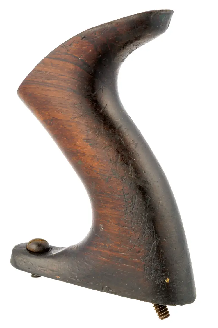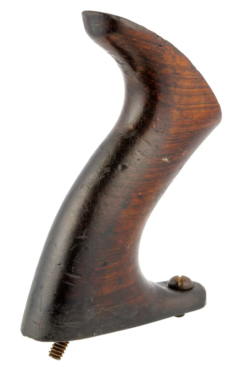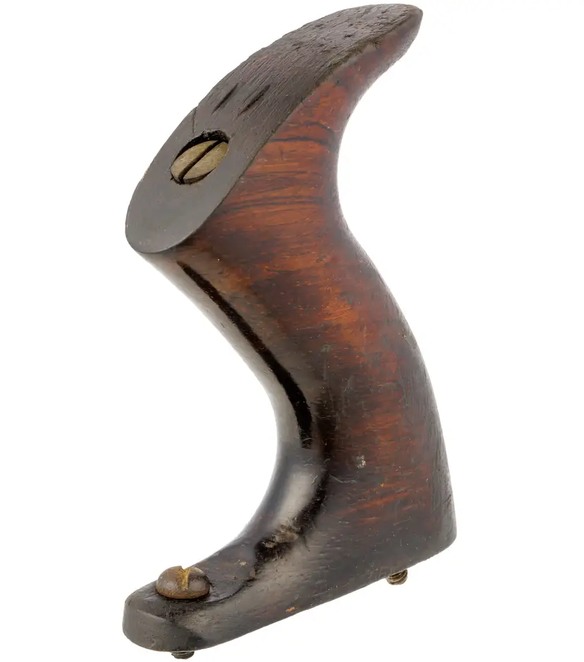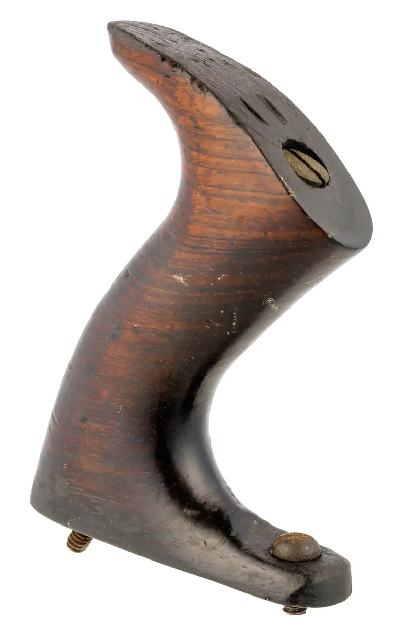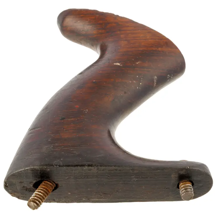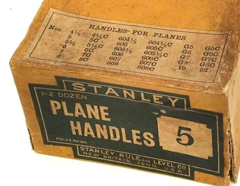 A solid original rosewood handle for Stanley's metallic bench planes. The only apology is a few scratches and 2 dimples in the top of the horn from the lateral adjuster. It is an earlier style used in types 6-9 (1888-1907) but will work with other vintages as well. It is the larger size which fits plane numbers 4-1/2, 4-1/2C, 5, 5C, 5-1/2, 5-1/2C, 6, 6C, 7, 7C, 8, 8C, as well as BEDROCK No's 604-1/2, 604-1/2C, 605, 605C, 605-1/2, 605-1/2C, 606, 606C, 607, 607C, 608, and 608C. It also fits the Gauge versions - G5, G5C, G6, G6C, G7, G7C, G8, and G8C. It also fits the Aluminum versions A5 and A6, Steel version S5, specialty plane No. 10 Carriage Maker's Rabbet Plane, and No. 52 Chute Board Plane. The box in the last photo is for reference only - to show the size planes it fits - and is not included with the purchase.