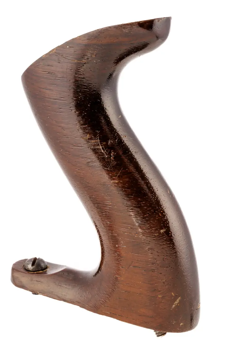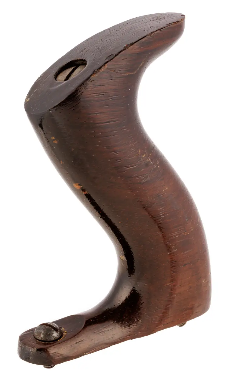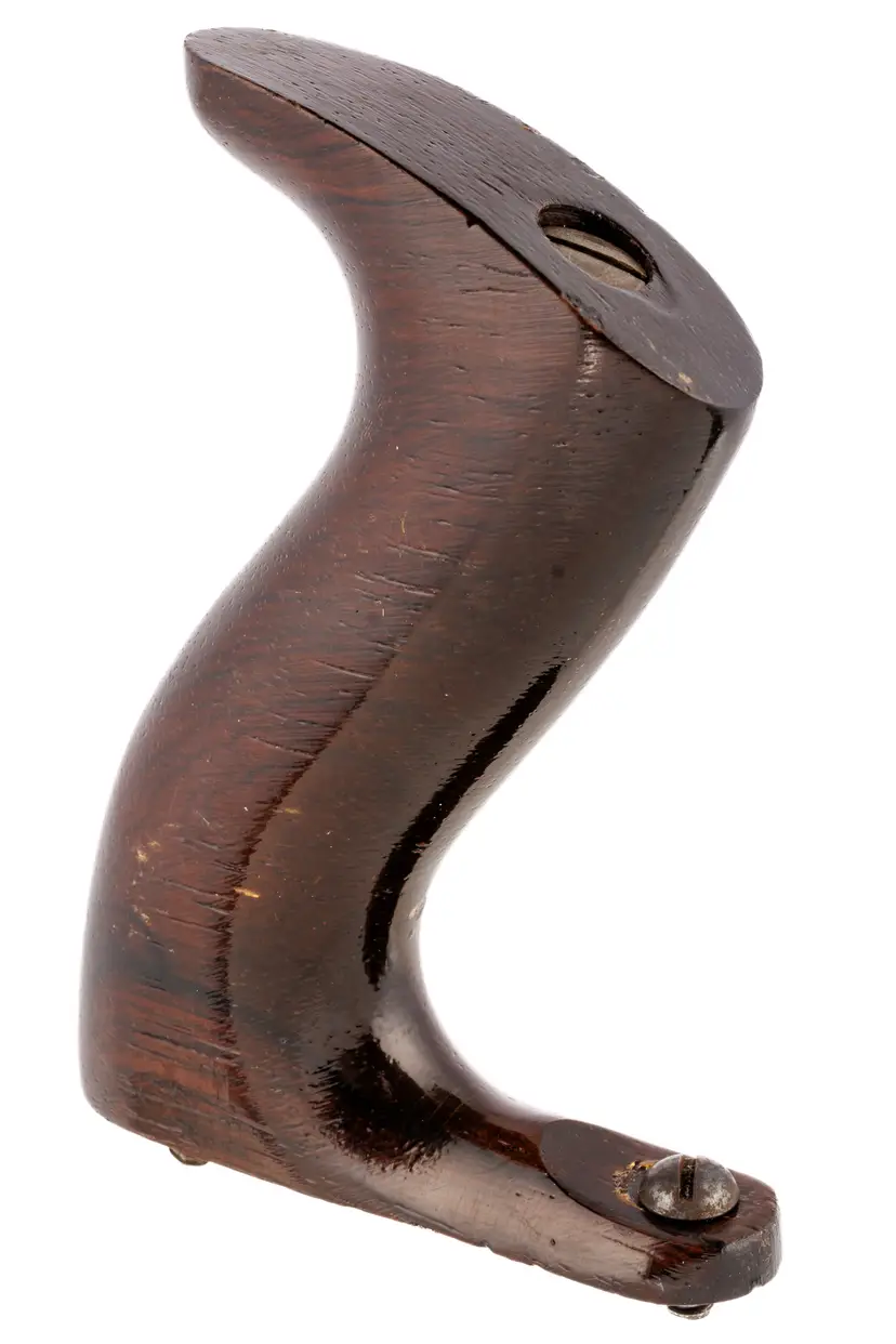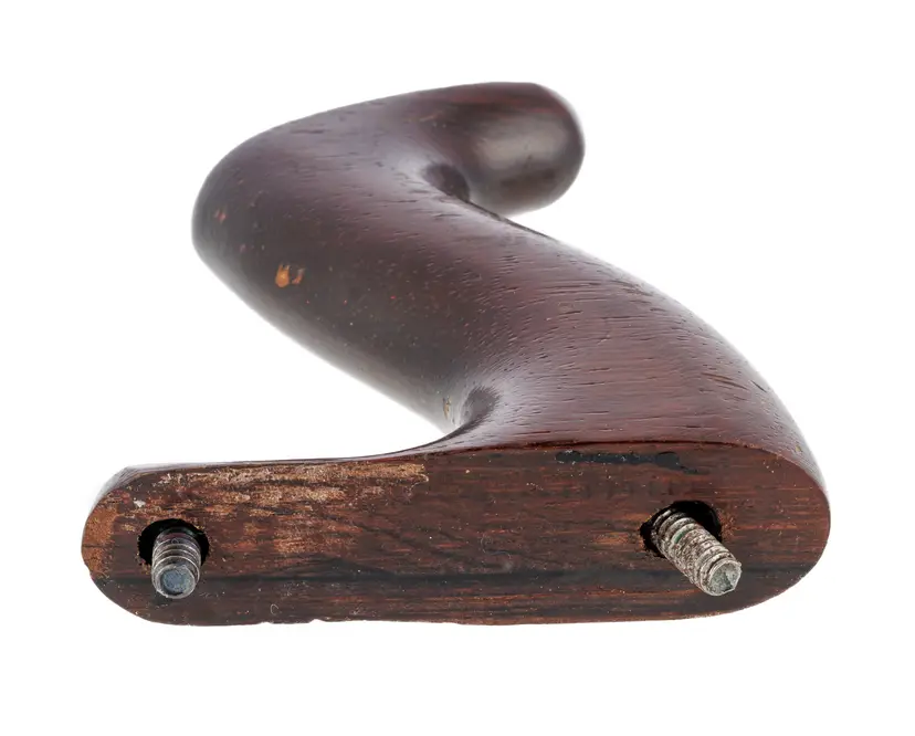 An Excellent original rosewood handle for Stanley's metallic bench planes. It is the style from a type 11 to type 16 (1910-1941), but will work with other vintages as well; salvaged from a type 16 plane. It is the larger size which fits plane numbers 4-1/2, 4-1/2C, 5, 5C, 5-1/2, 5-1/2C, 6, 6C, 7, 7C, 8, 8C, as well as BEDROCK No's 604-1/2, 604-1/2C, 605, 605C, 605-1/2, 605-1/2C, 606, 606C, 607, 607C, 608, and 608C. It also fits the Gauge versions - G5, G5C, G6, G6C, G7, G7C, G8, and G8C. It also fits the Aluminum versions A5 and A6, Steel version S5, specialty plane No. 10 Carriage Maker's Rabbet Plane, and No. 52 Chute Board Plane. The box in the last photo is for reference only - to show the size planes it fits - and is not included with the purchase.