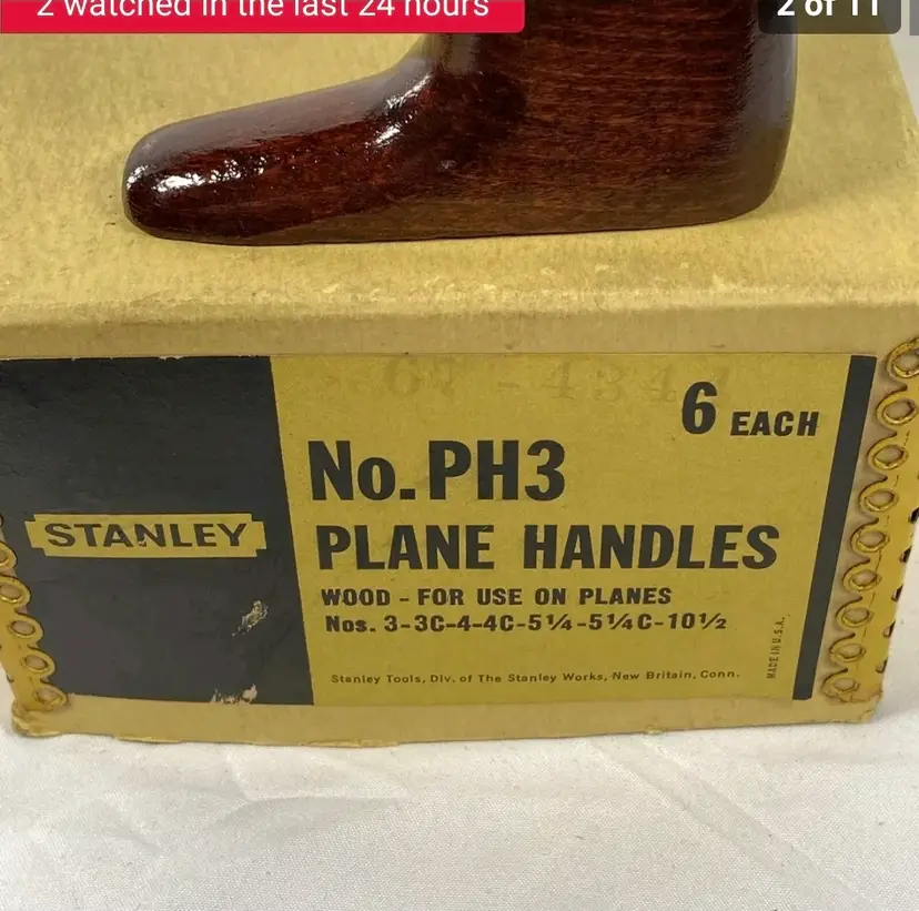 An Excellent rosewood handle for vintage Stanley hand planes. It was donated from a type 16 plane. The last photo is of a box that is not included, but rather to show the sizes of planes that this handle fits - No. 3, 4, 5-1/4, 603, 604, 605-1/4, 10-1/2, 72, 112. Please note that earlier planes had a shorter base - this one is designed to work with the plane bodies that have a raised handle receiver.
