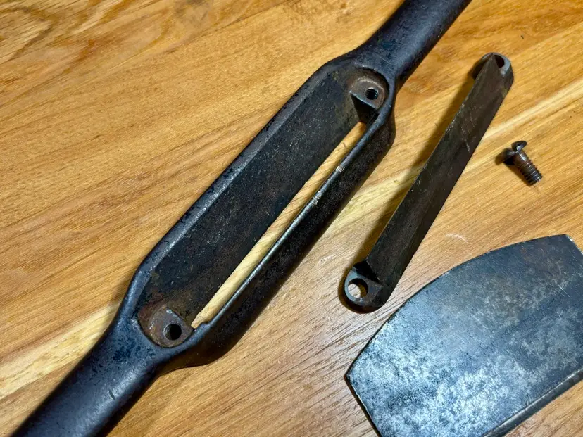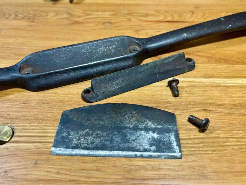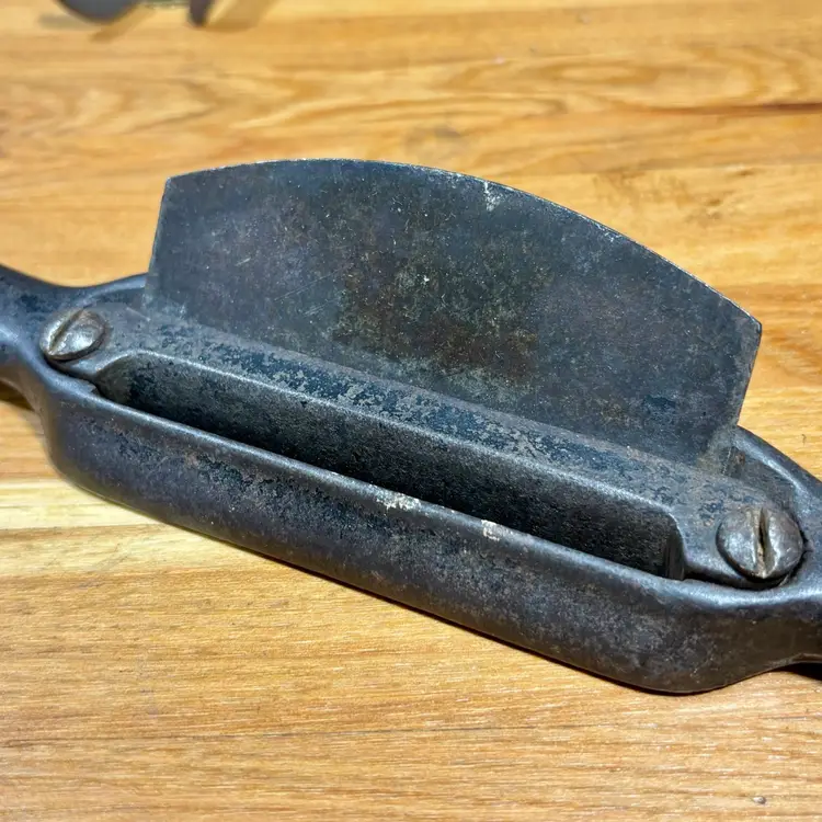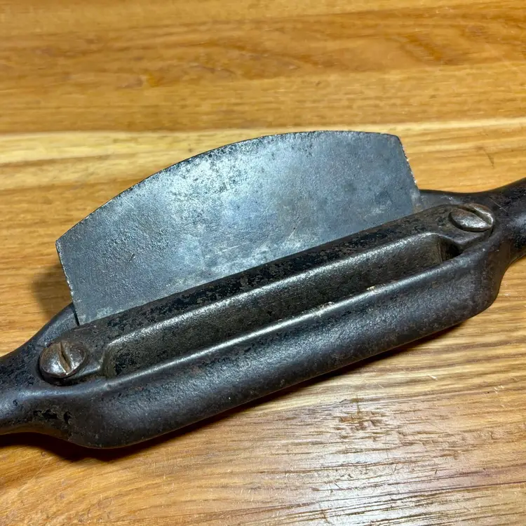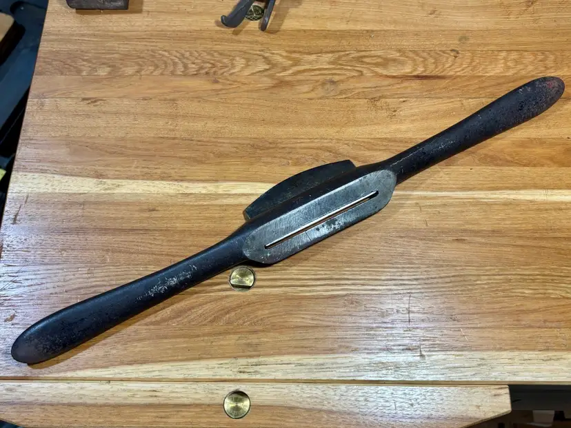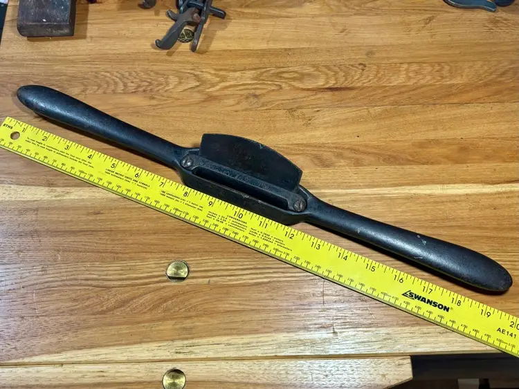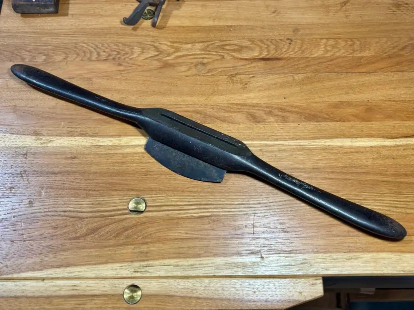 Antique Stanley Rule & Level Co. No. 56-1/2 Cooper's Spoke Shave. Measures approximately 19-1/2" long with a 4" wide blade. Most of the japanning is gone from this spokeshave. Sole and blade are in good shape. The screw heads have been slightly worn from tightening but this is only cosmetic. The blade has a faint trademark remaining and "& Level Co." can be made out. See pictures for details. Let me know if you have any questions.