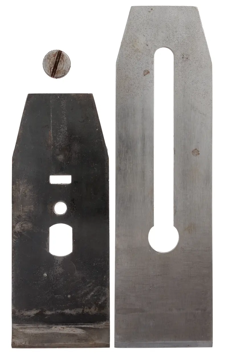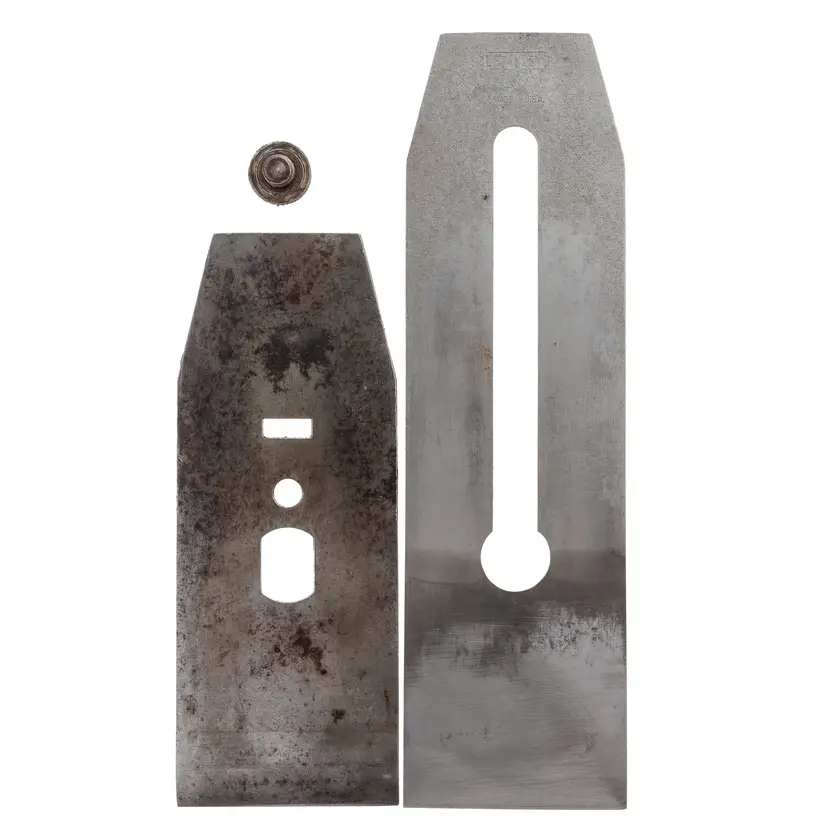 A nice sharp original stanley sweetheart "AA" (1922-1935) double plane iron for No. 5-1/2 and No. 605-1/2 jack planes. It is 2-1/4" wide. It is nice and sharp but may need a final honing for use. There is some pitting at the top but the bevel end is free of defects. Plenty of life left at 7-13/16" long. There is an owner stamp on the inside of the cap iron.