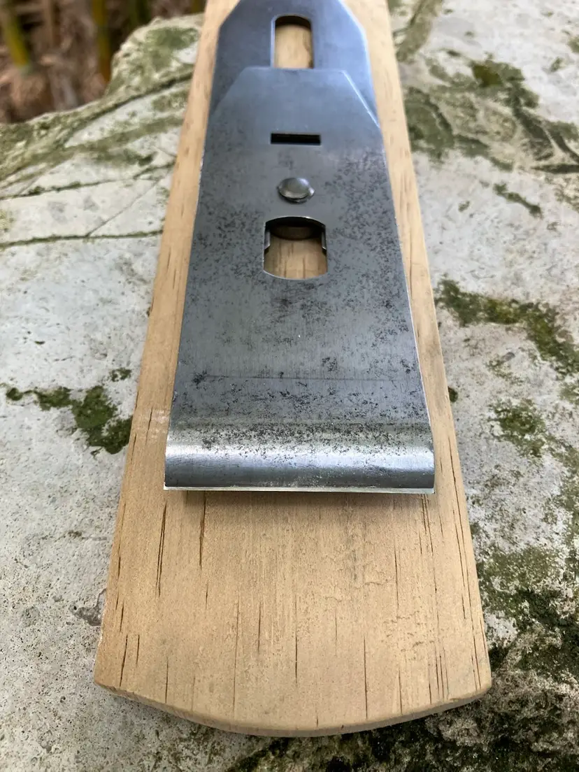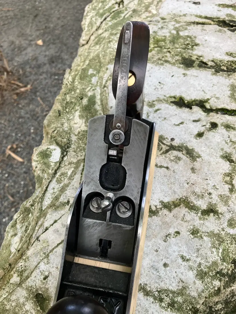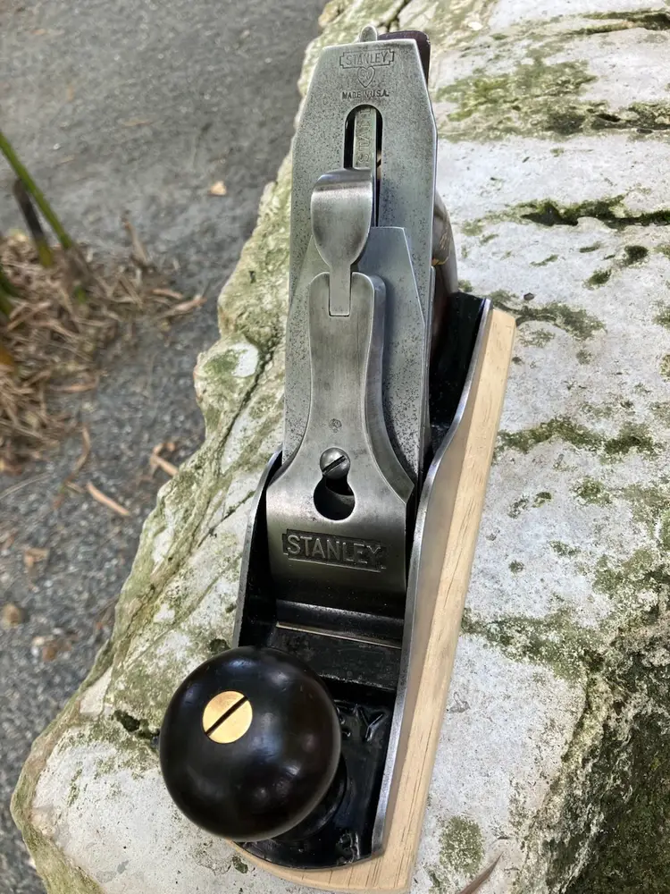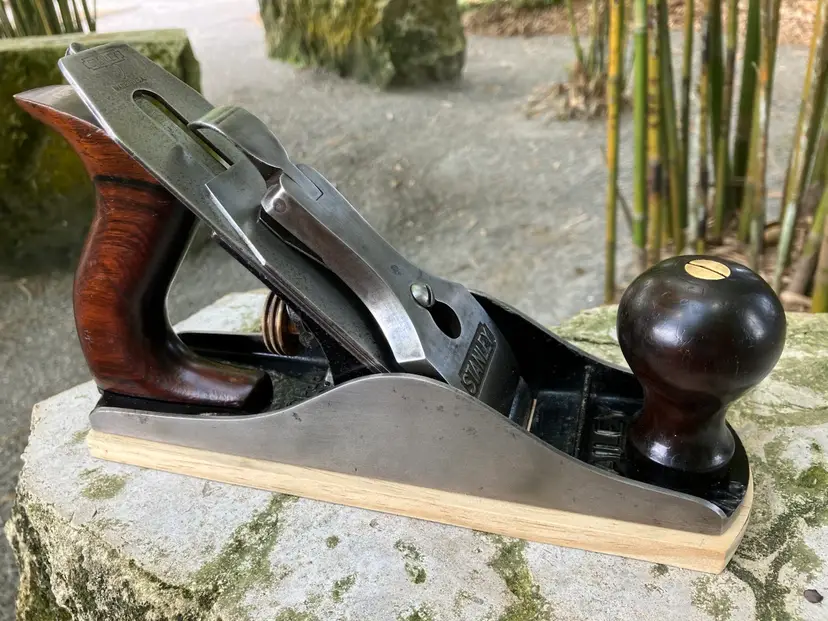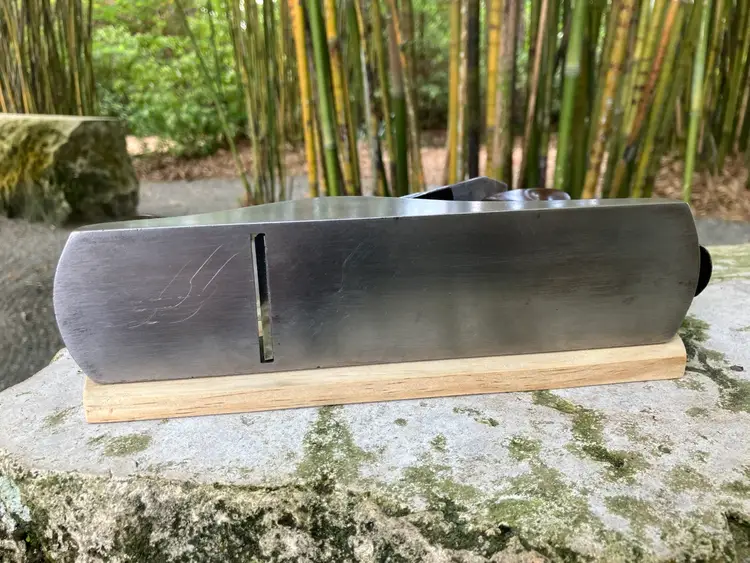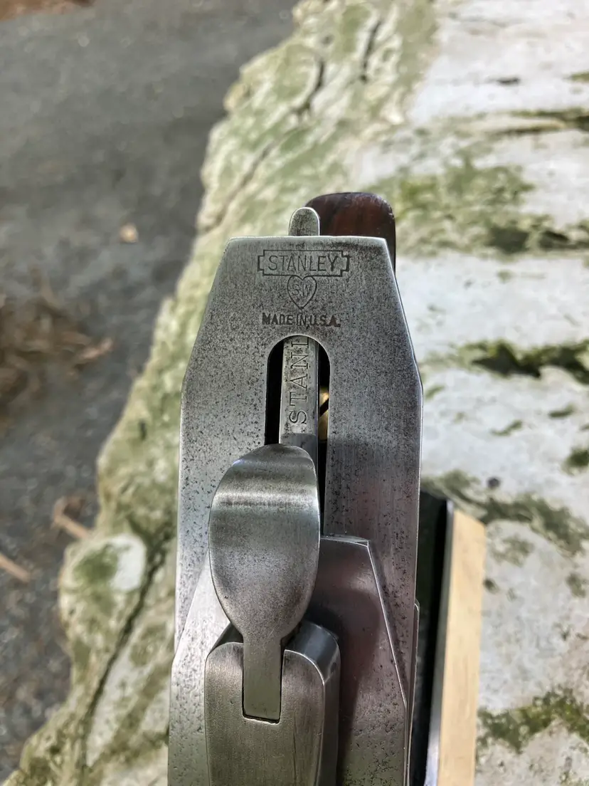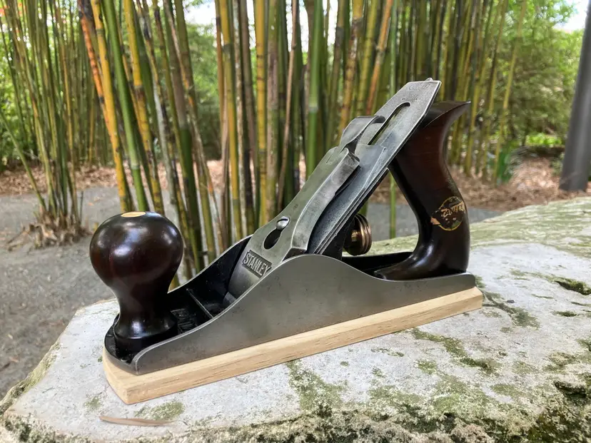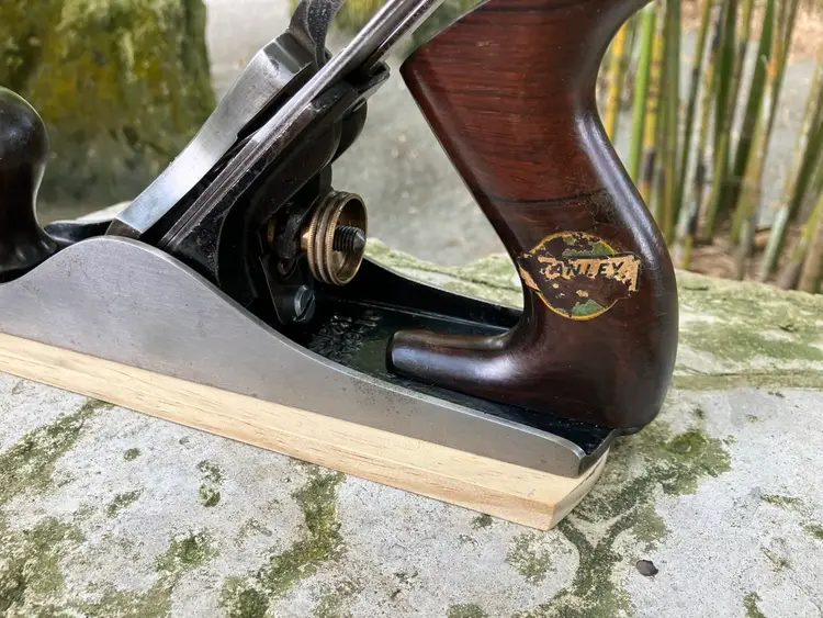 This Stanley No. 3 was already in amazing shape when I received it. Japanning was nearly 100% with barely any surface rust on screws/blade etc. I cleaned up the corrosion and waxed/reassembled. The screws are all in good condition with minimal marring to the heads. Wood is in great condition with almost no dents/dings. Plenty of life left in the blade and everything is in perfect working order. The blade itself was sharpened, though there is a spot behind the edge where the grinder got a little out of hand establishing the bevel.