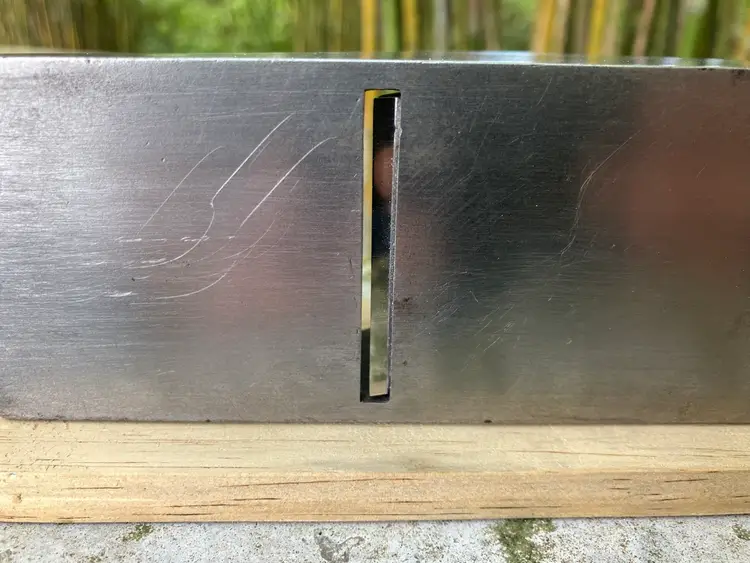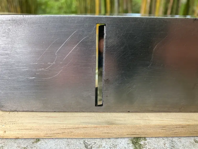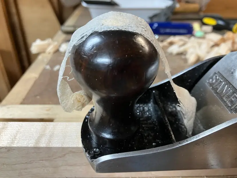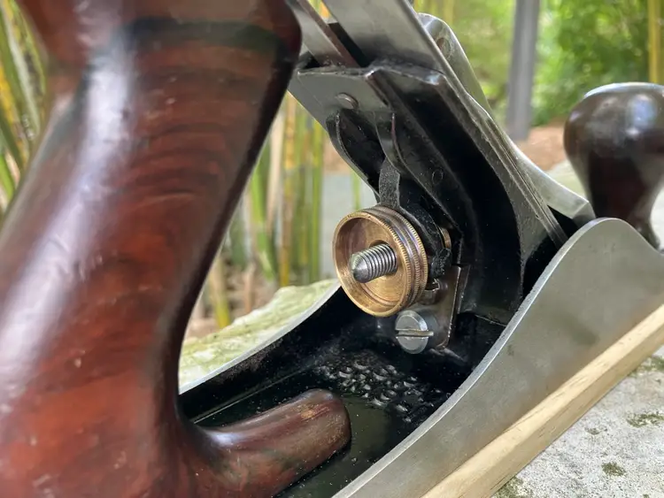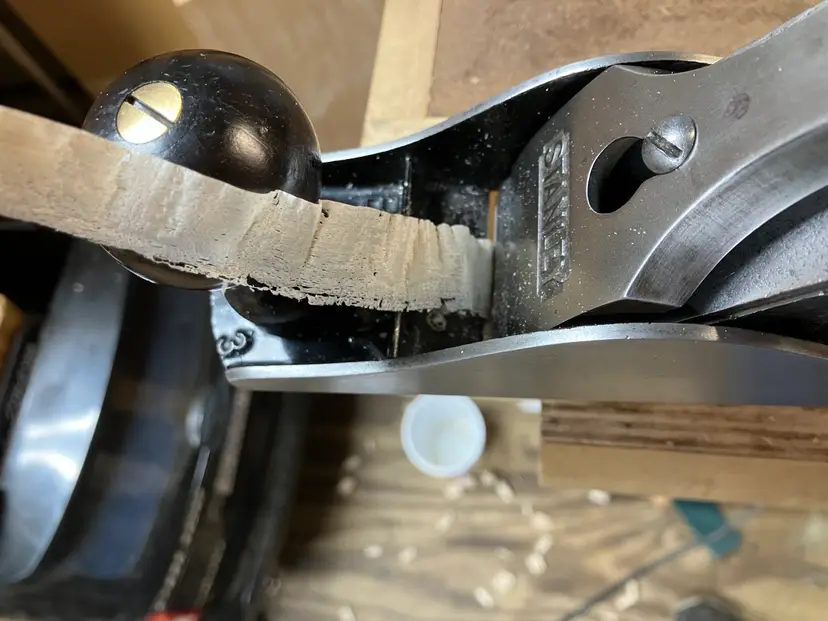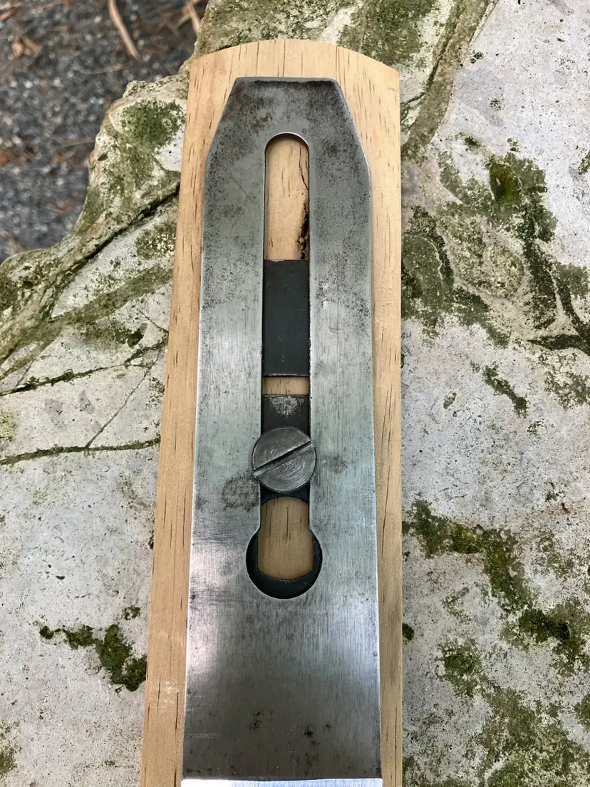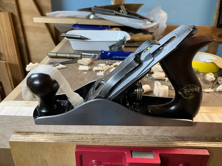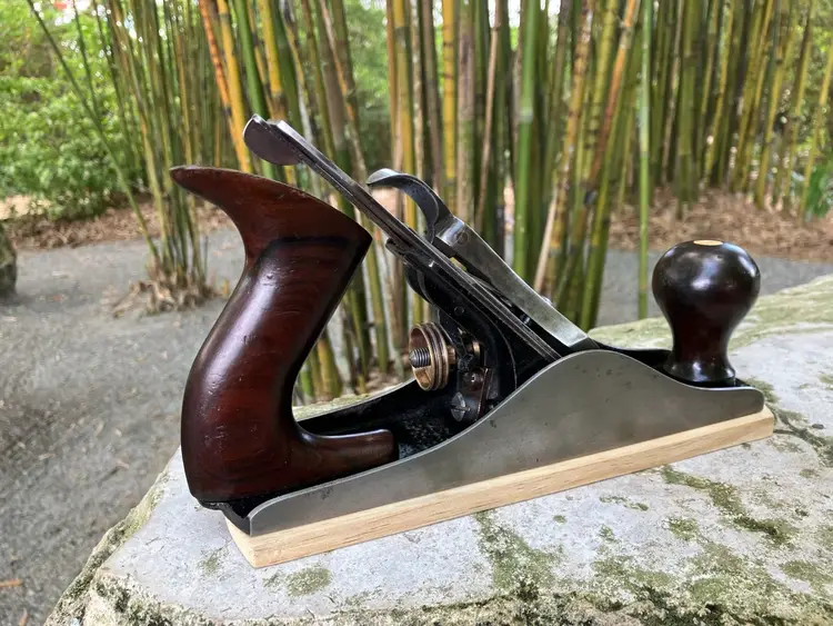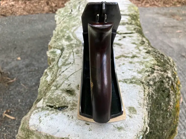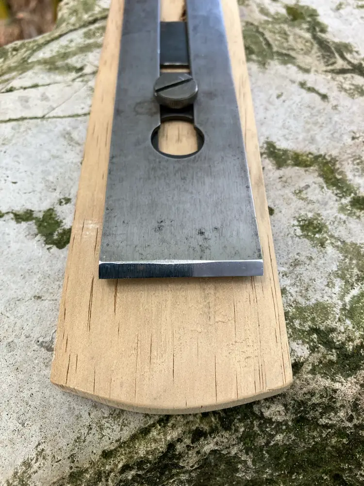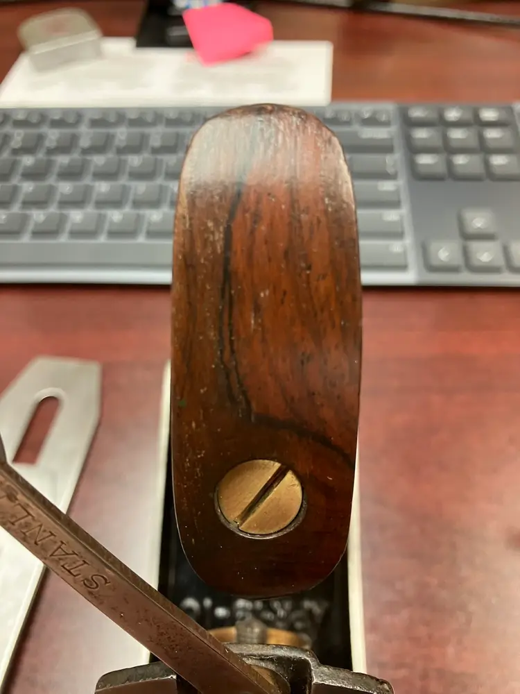 This Stanley No. 3 was already in amazing shape when I received it. Japanning was nearly 100% with barely any surface rust on screws/blade etc. I cleaned up the corrosion and waxed/reassembled. The screws are all in good condition with minimal marring to the heads. Wood is in great condition with almost no dents/dings. Plenty of life left in the blade and everything is in perfect working order. The blade itself was sharpened, though there is a spot behind the edge where the grinder got a little out of hand establishing the bevel.