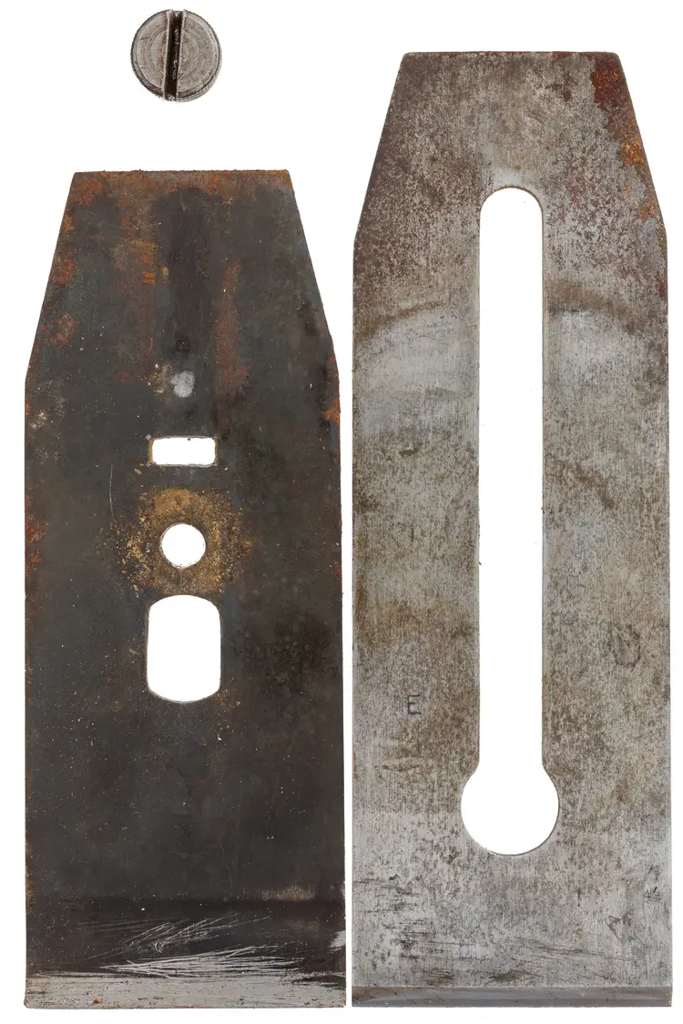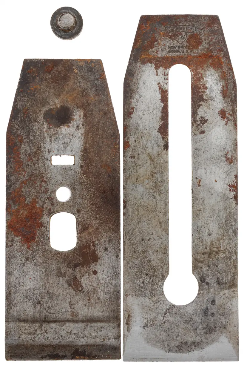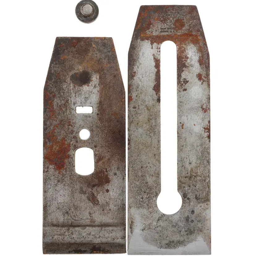 A decent [just sharpened] stanley sweetheart "X" (1919-1920) double plane iron for a No. 5-1/2 and No. 605-1/2. It is 6-3/4" long and has just been sharpened on an extra course diamond plate. Final honing will be left to the new owner.