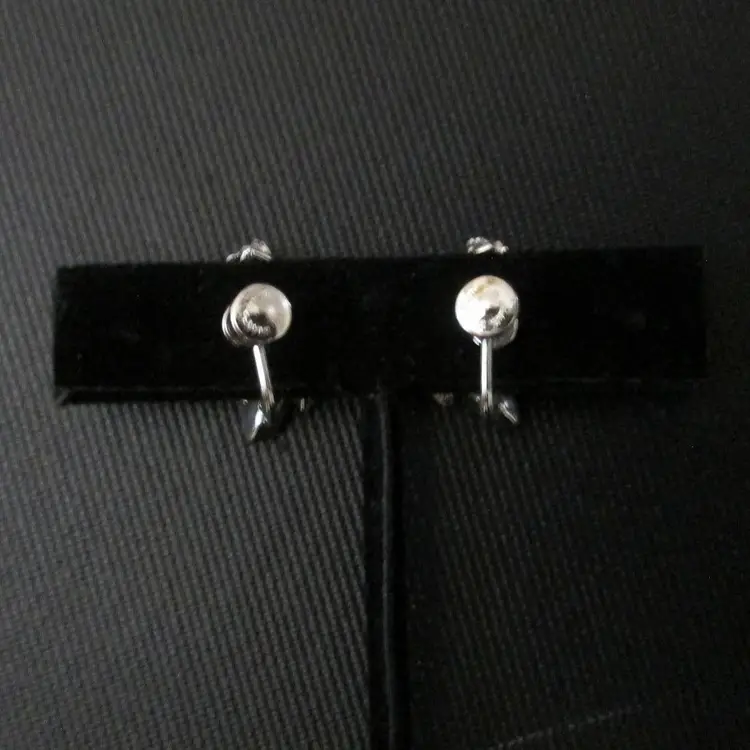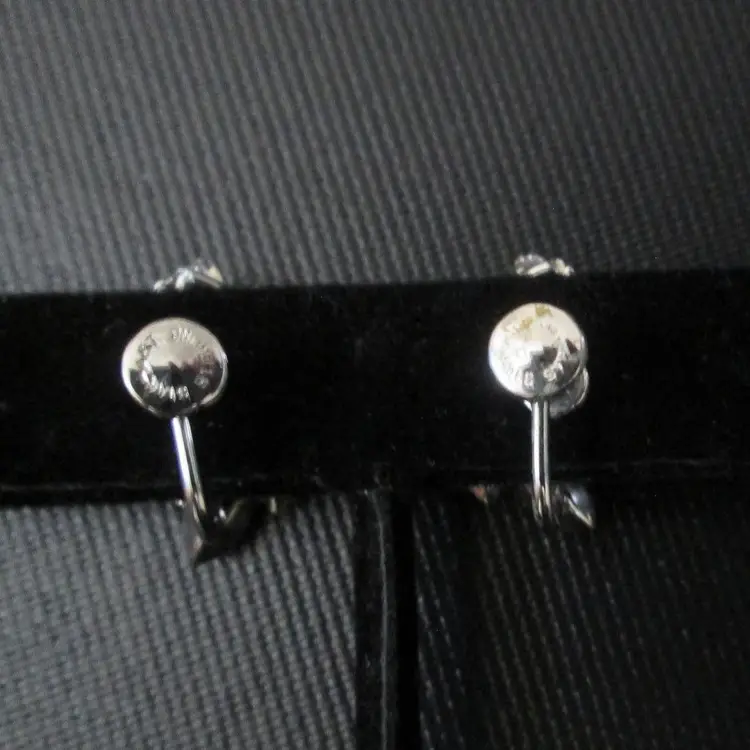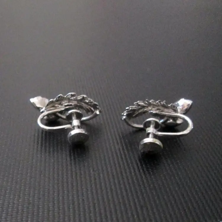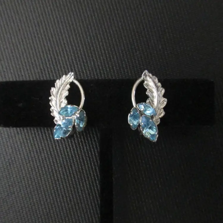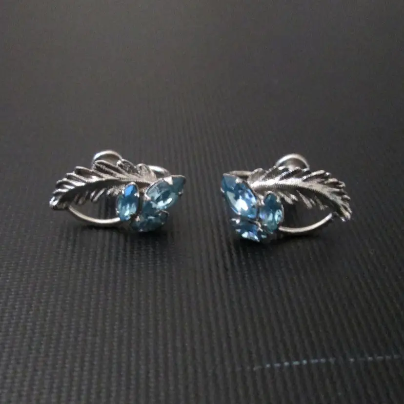 Vintage Star Art sterling silver clip earrings. Leaf design with three ice blue rhinestones. Marked Sterling and signed Star Art on back. Screw back clip style. About 1" long.