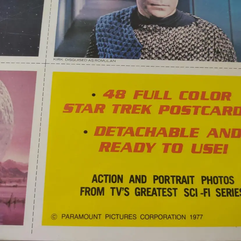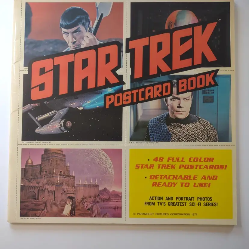 This Star Trek Postcard Book from 1977 is a must-have for any fan of the popular science fiction series. The original large 12" x 12" book contains unused postcards featuring stunning images from the show's space age universe. With a focus on the Star Trek subject matter, this collectible paper ephemera is a unique addition to any collection. Manufactured in the United States, this postcard book is a great piece of vintage memorabilia from the era. It's a non-modified item that's perfect for collectors who are looking for original pieces to add to their collection. Explore the world of Star Trek with these amazing postcards and take your collection to the next level.