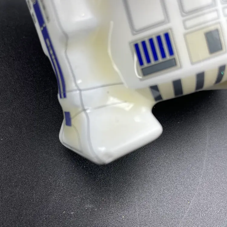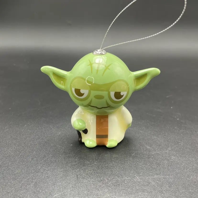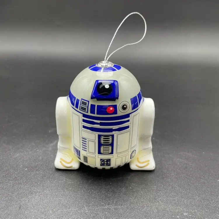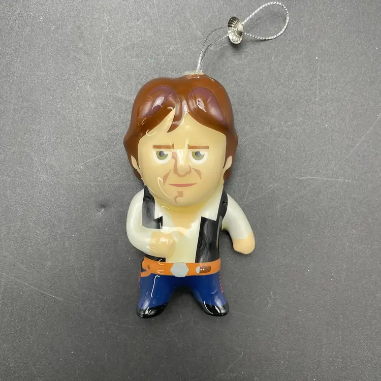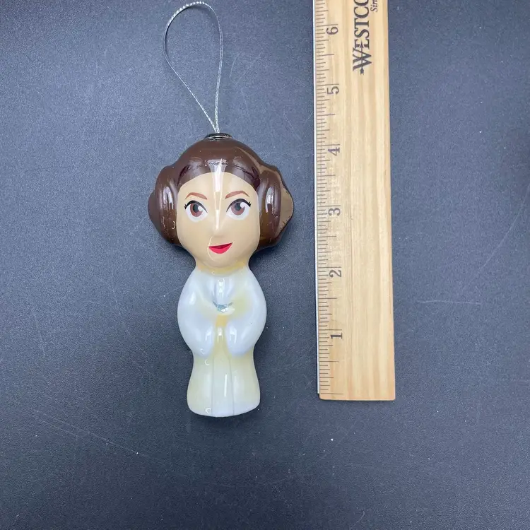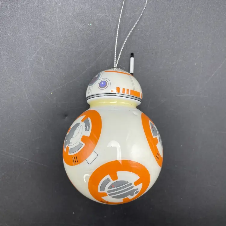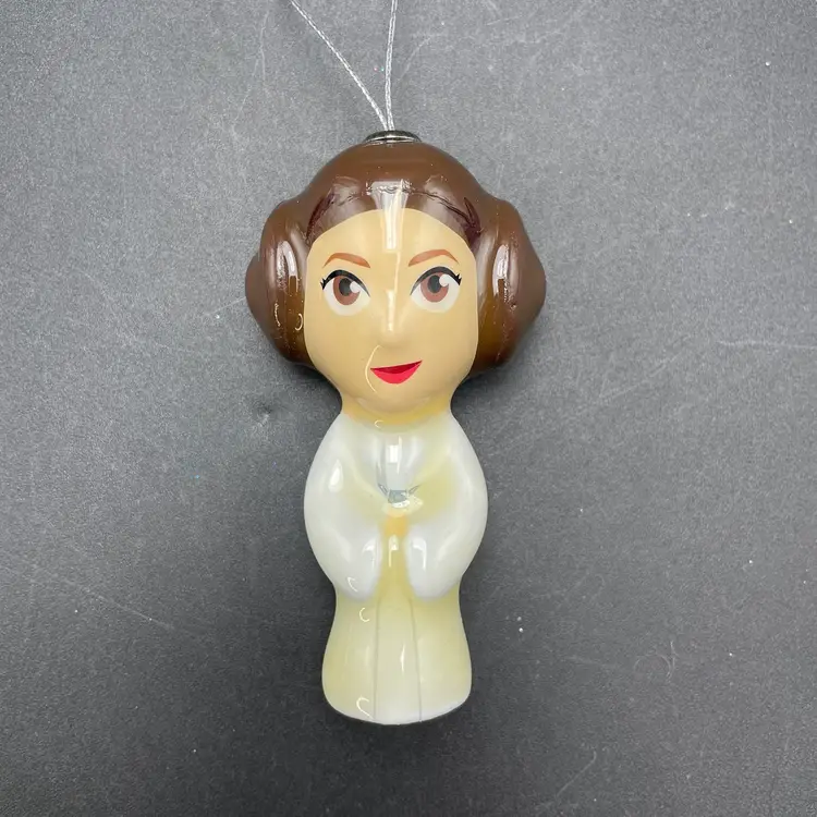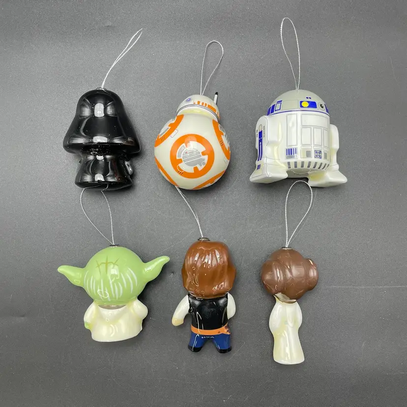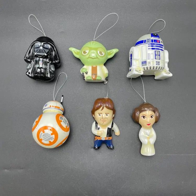 This is a lot of 6 Hallmark Star Wars shatter proof plastic hanging ornament. The lot includes Darth Vader, Yoda, R2D2, Han Solo, Princess Leia, and BB-8. Each measure approximately 4" long. There is some wear to each due to use. Major flaws are included in pictures. Leia has a scuff on the back of her head, and R2D2 has a dent on one leg.