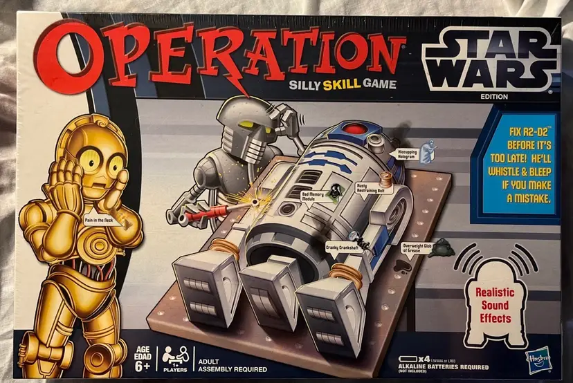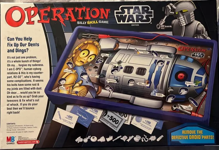 Classic Operation board game with R2D2 as the unfortunate patient! Hopefully the Force is with you as you try to repair R2. Give it a try, and may the odds be ever in your favor! Oops! Wrong franchise! LOL