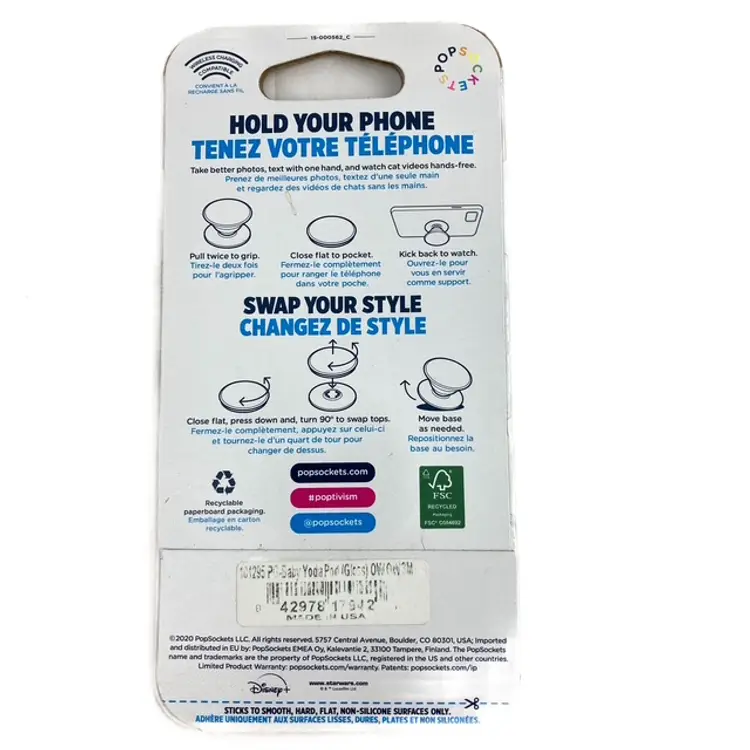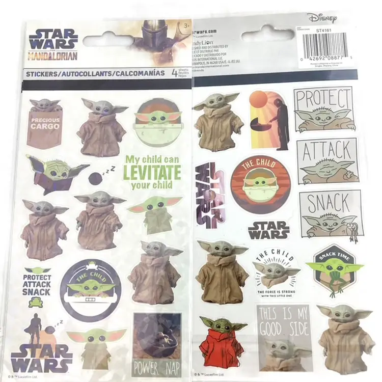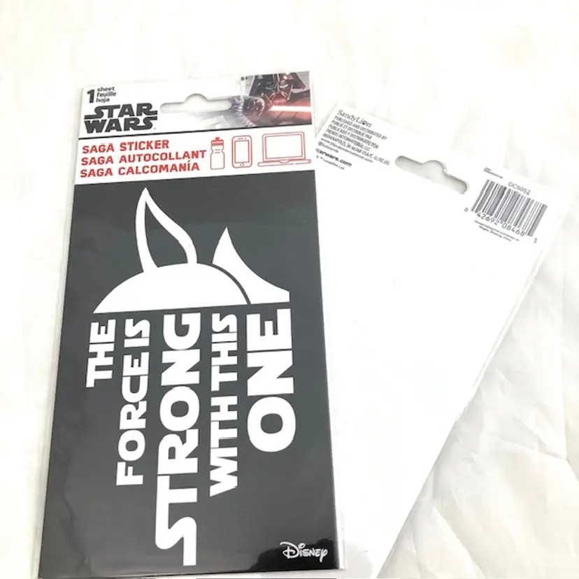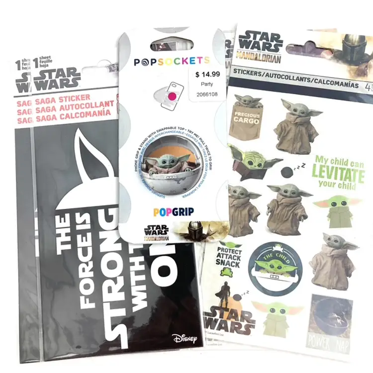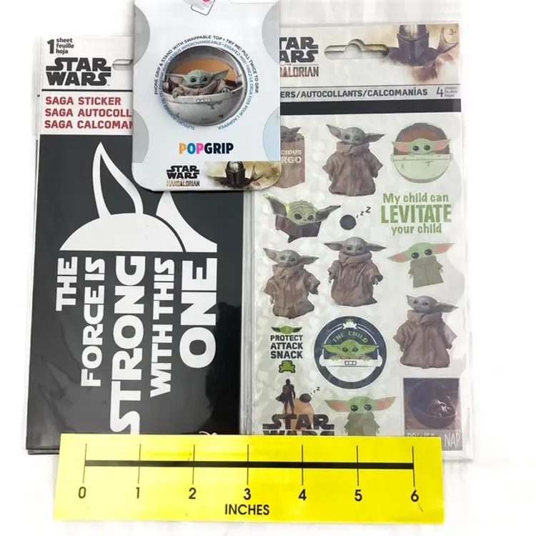 All new in their packages! 1 Pop Socket Pop Grip with Yoda, 2 Black and White Decals and 2 packages of 4 sheet Yoda stickers for you or your favorite Star Wars fan. mart147