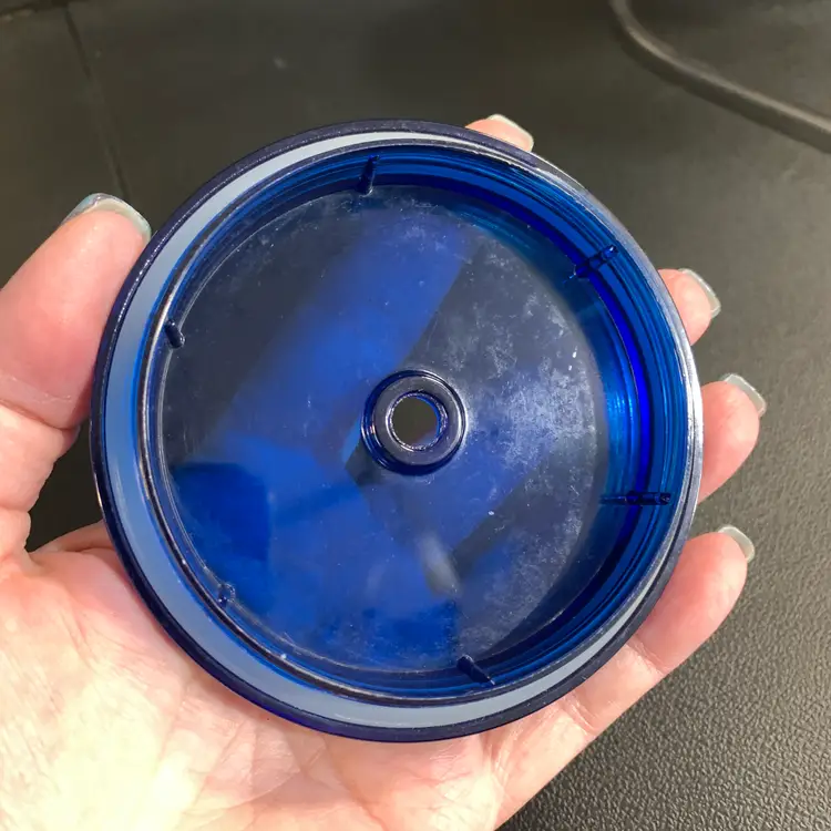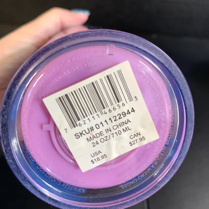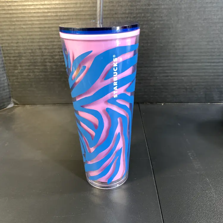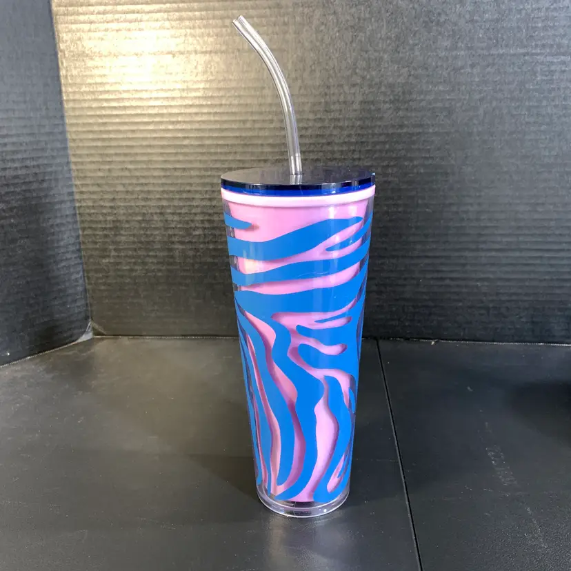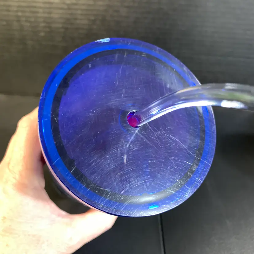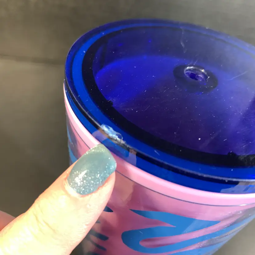 This is in good condition. There is some surface scratches as shown in the photos and there is a chip on the lid. Measures 3 3/4 inches wide and 9 inches tall not including the straw. Weighs 10 ounces. If the actual postage ends up being less than what you paid, you will be refunded for anything over one dollar.