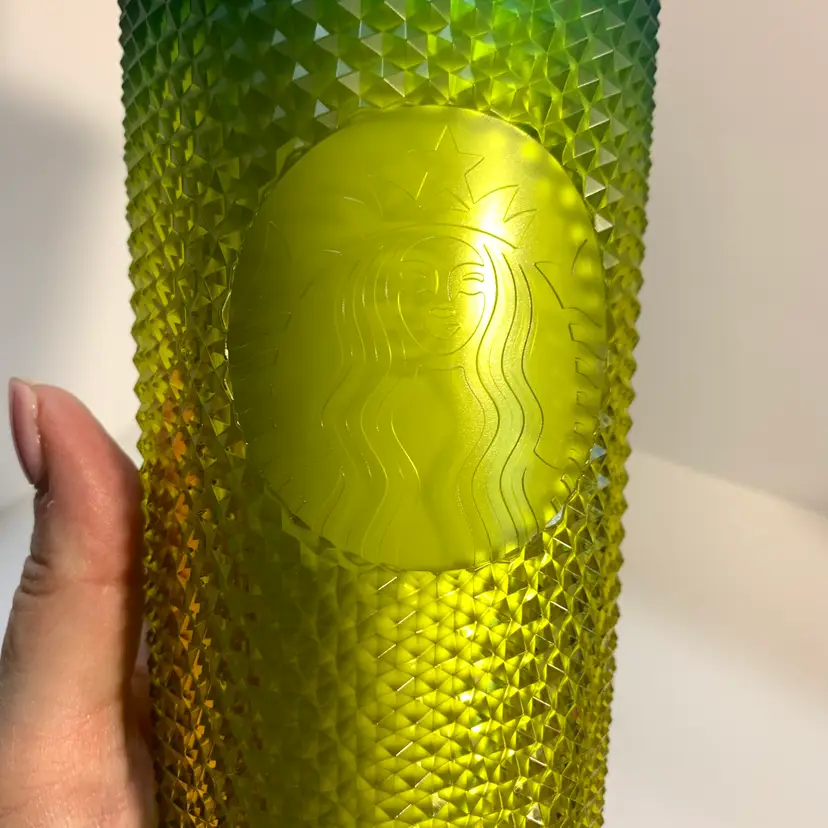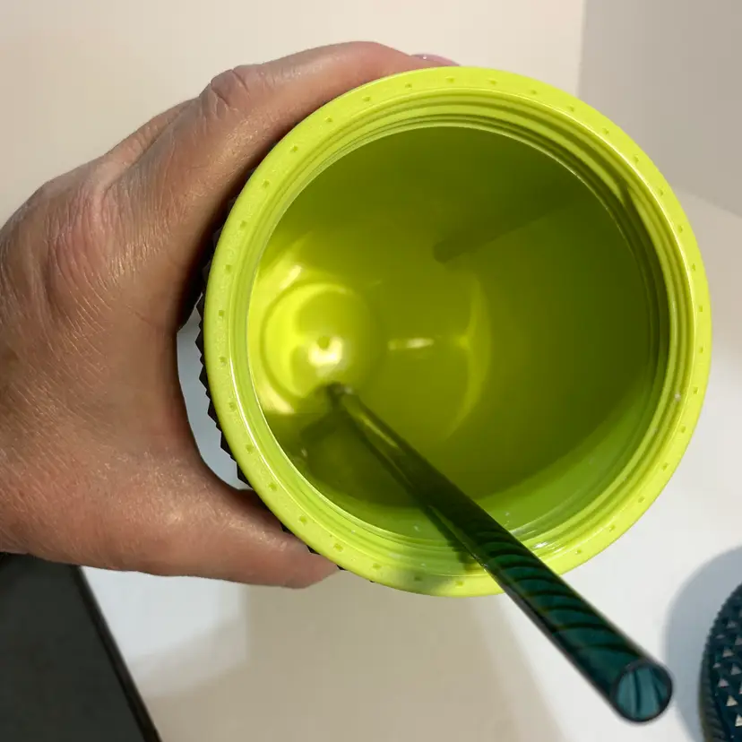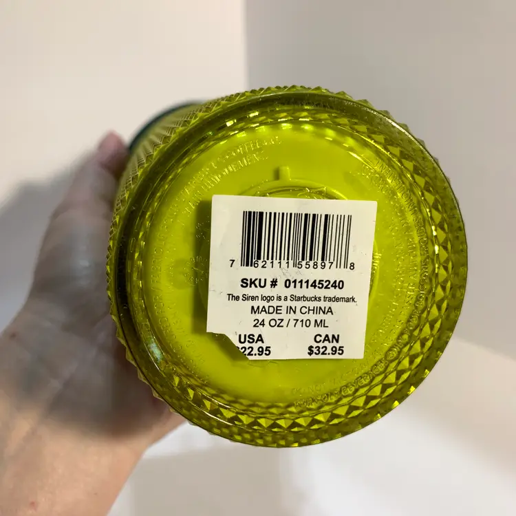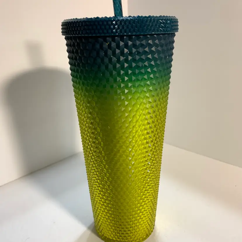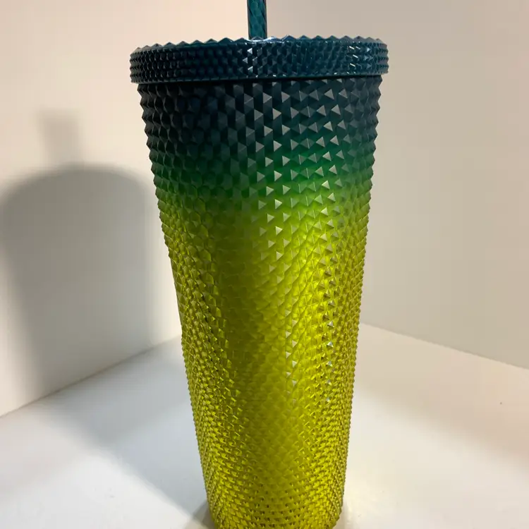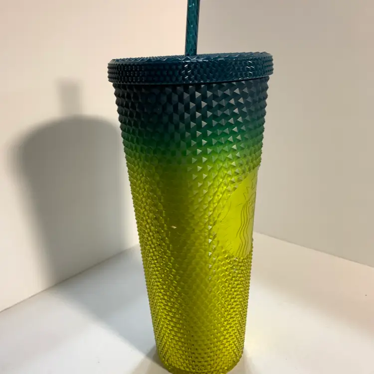 Color is gradient lemon yellow and blue. This is for cold beverages and looks to be new to me. It is in pristine condition. Measures 4 inches wide and 9 inches tall not counting the straw. Weighs 13 ounces. If the actual postage ends up being less than what you paid, you will be refunded for anything over one dollar.
